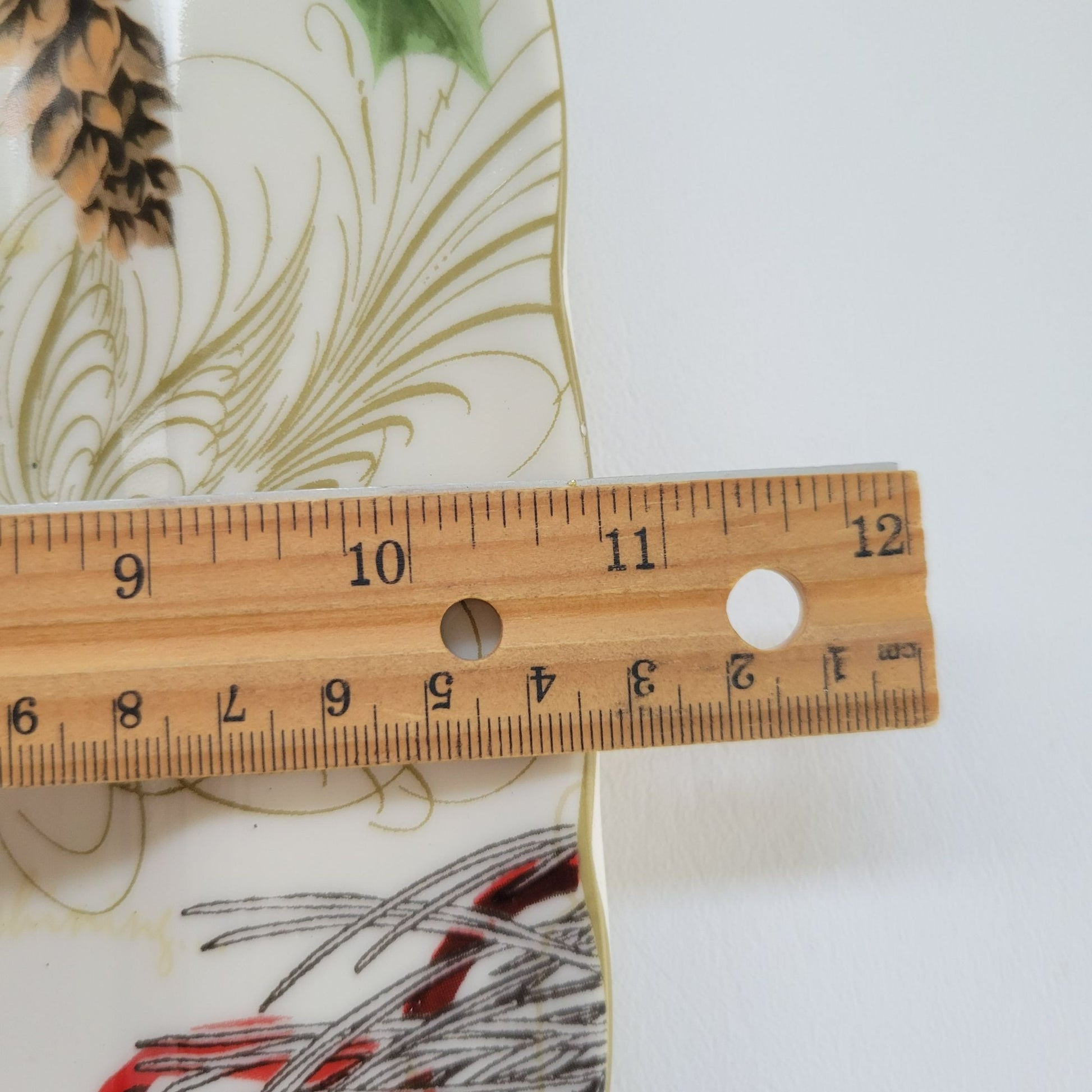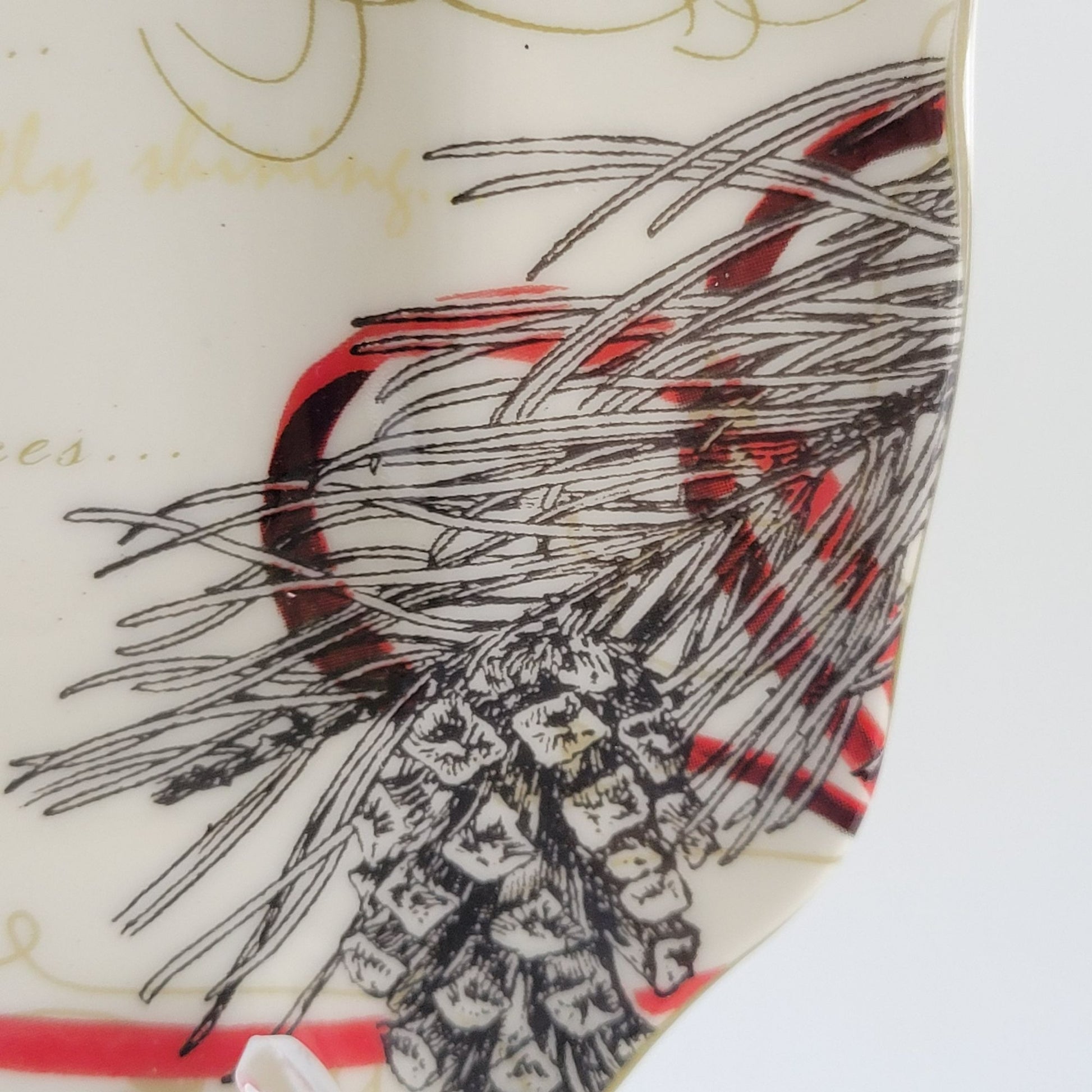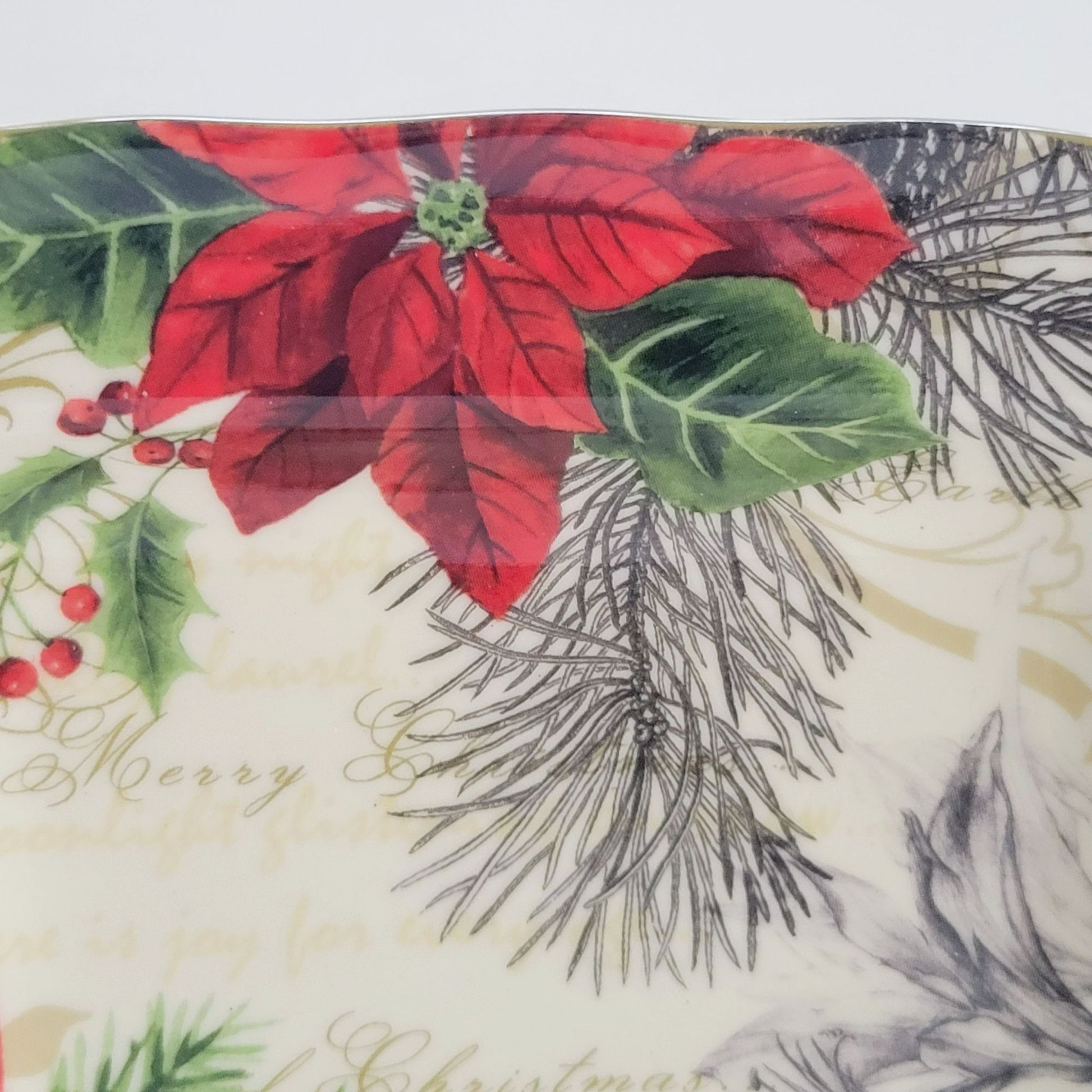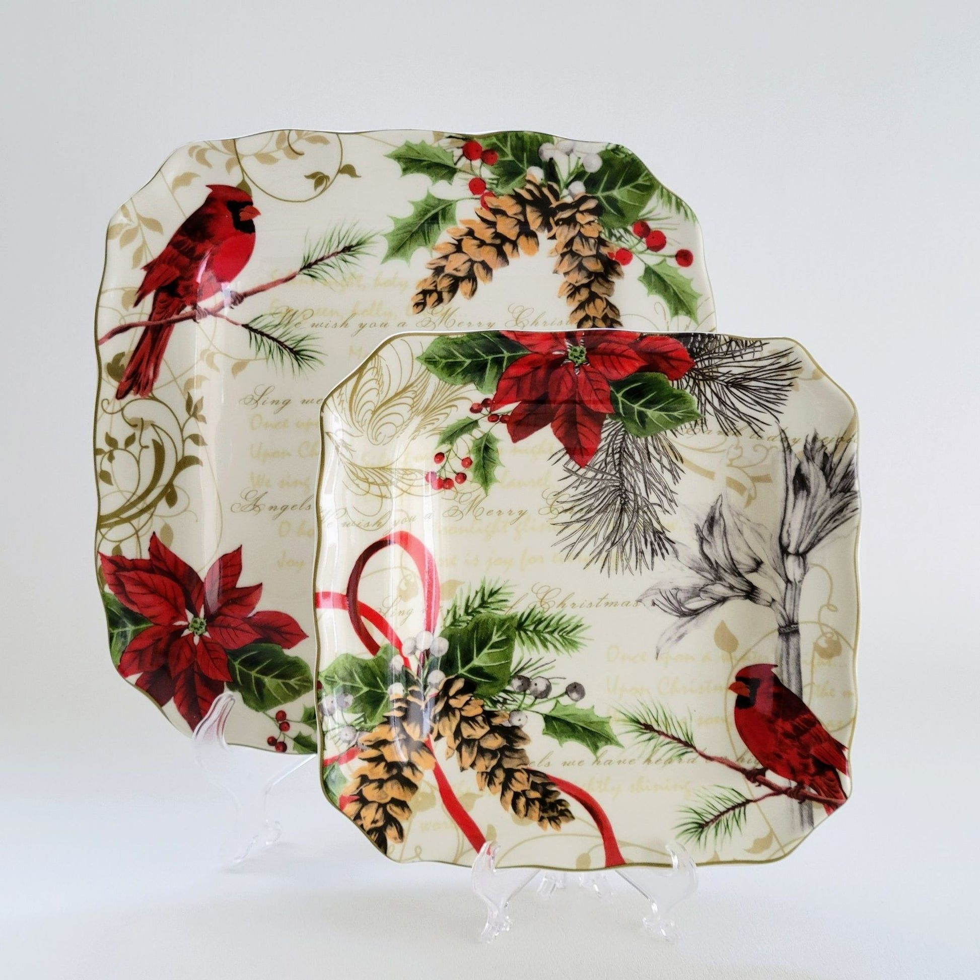 Enhance your holiday table with this exquisite set featuring poinsettias, pinecones, and birds. Perfect for festive gatherings.