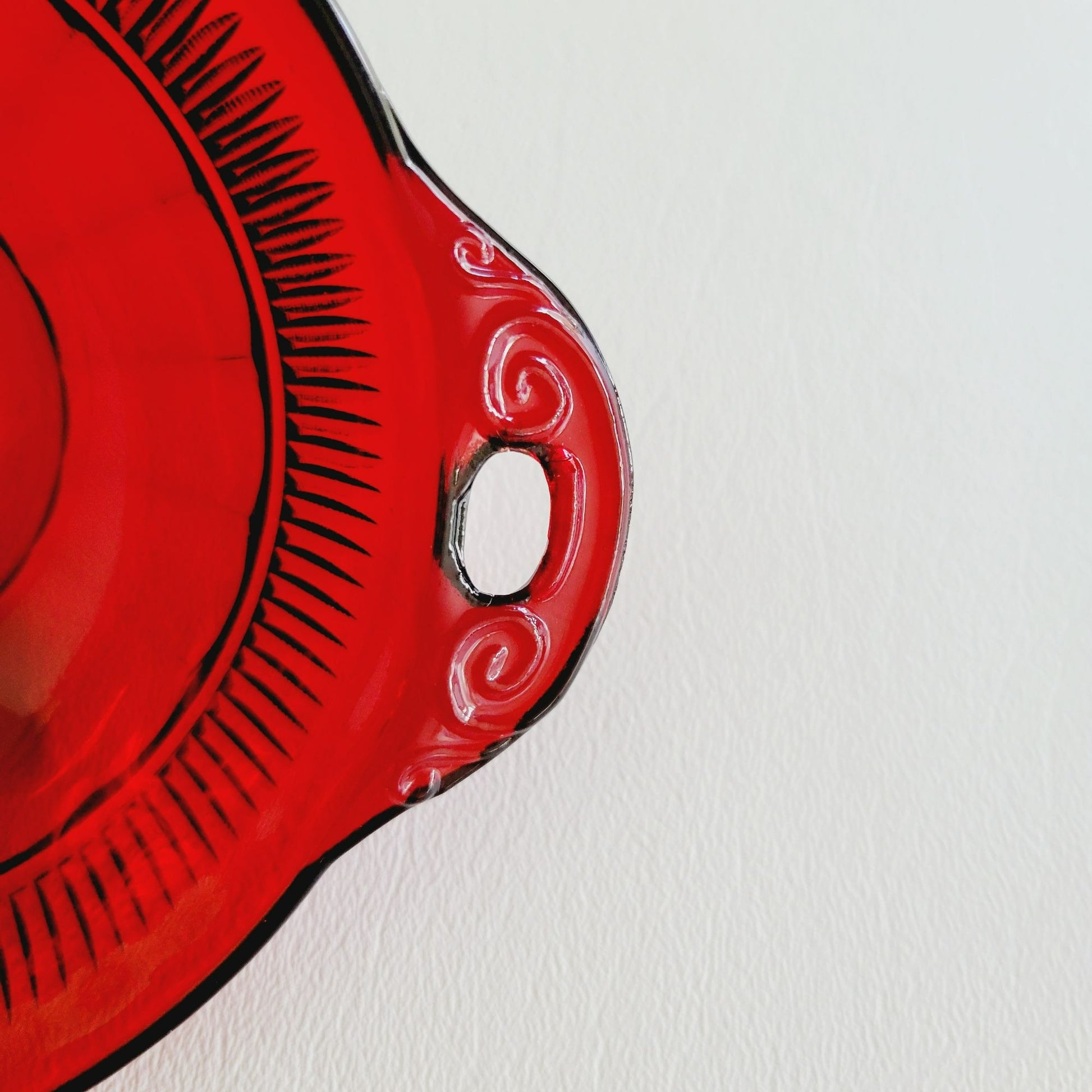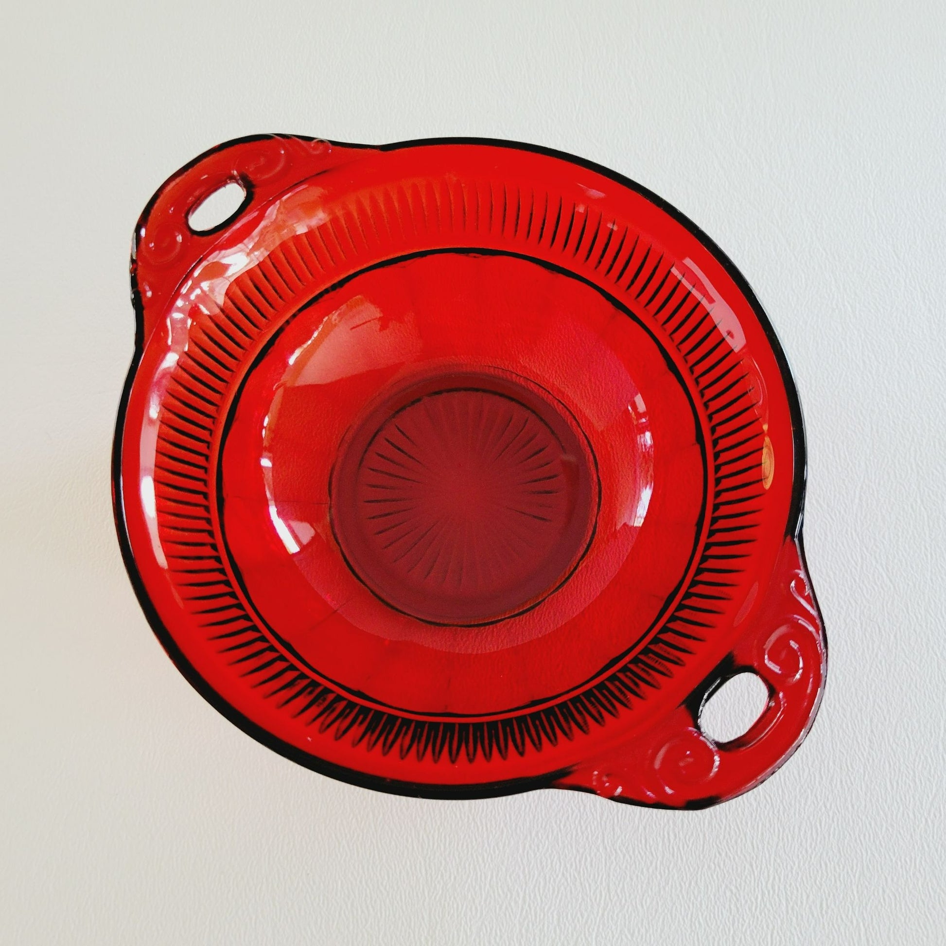 Vintage Anchor Hocking Coronation Royal Ruby Berry Bowls from the 1936-40 era, showcasing vibrant red Depression glass with side handles. Ideal retro kitchen decor.