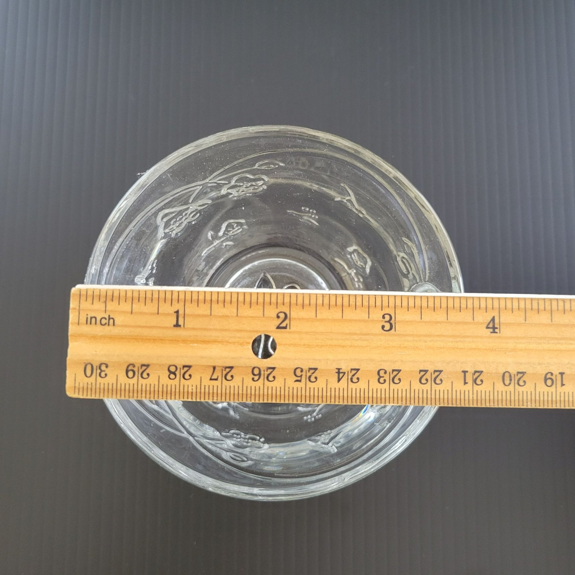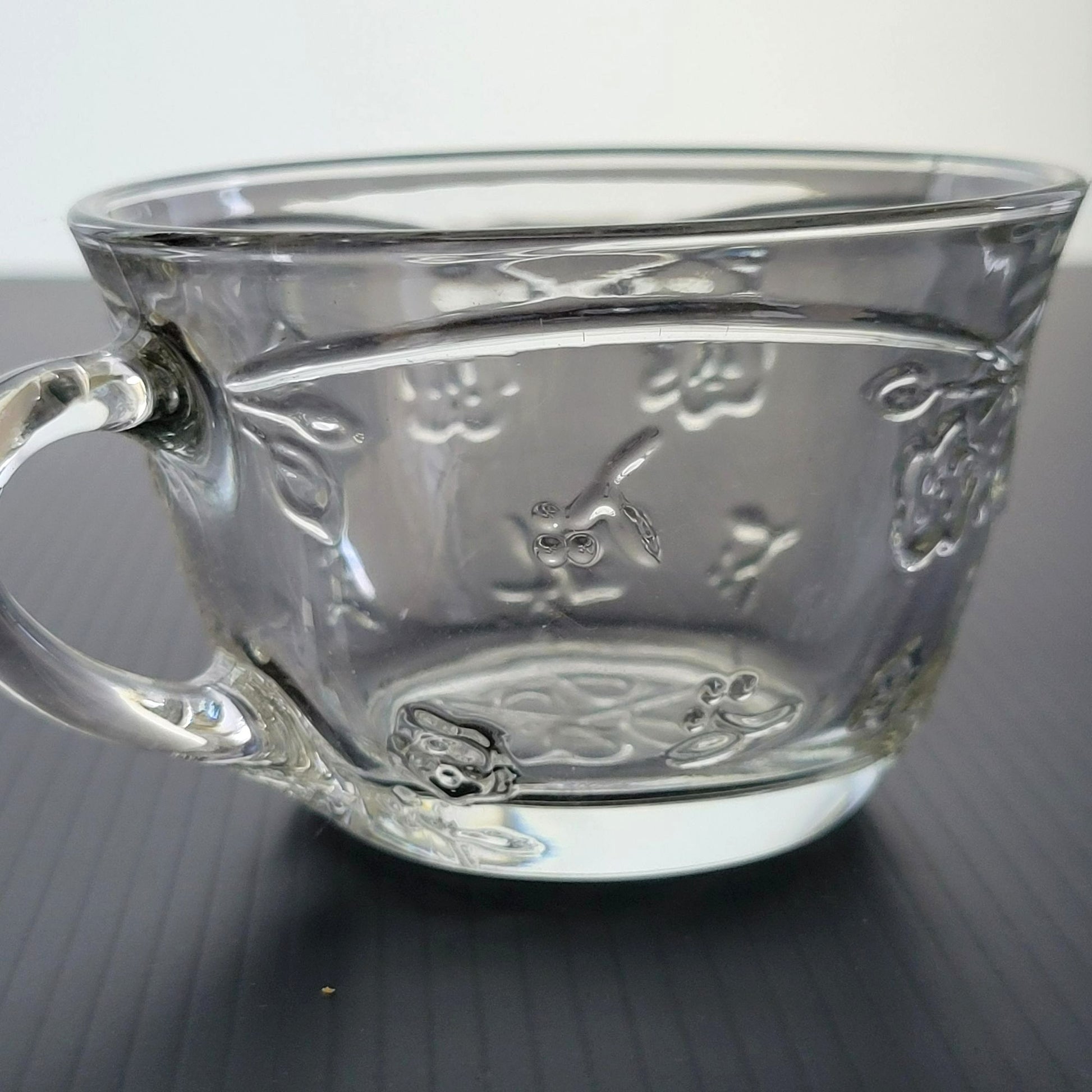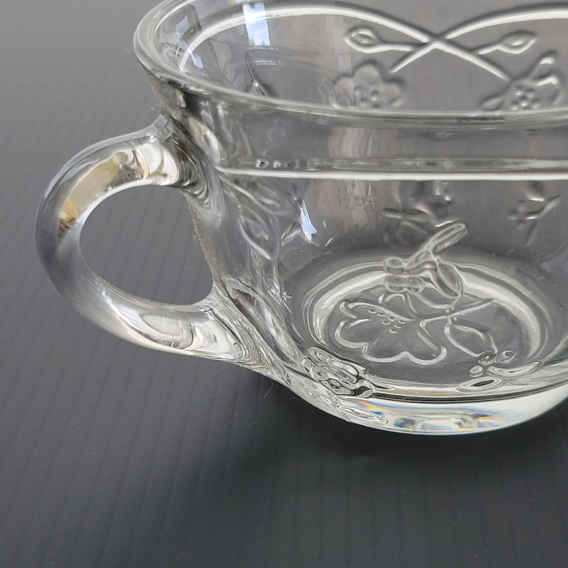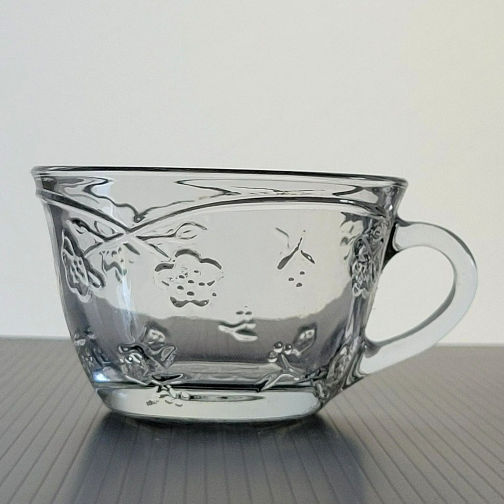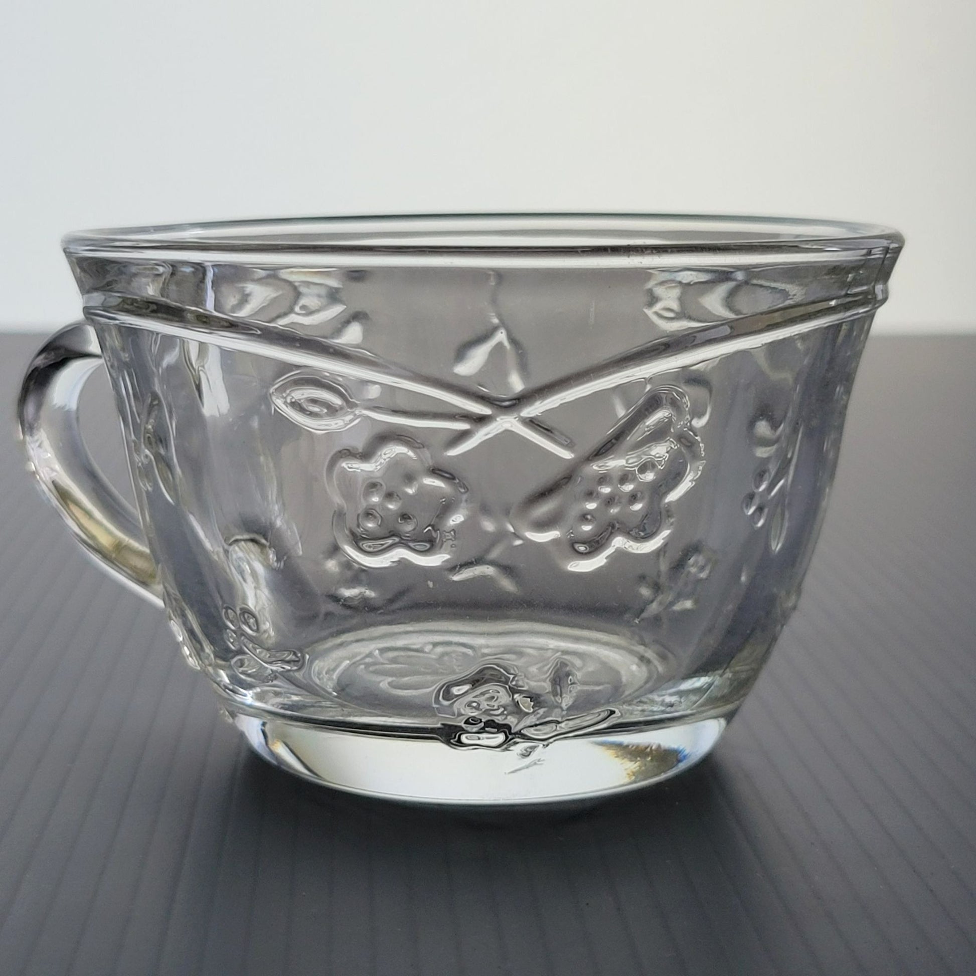 The Anchor Hocking Savannah Clear Punch Coffee/Tea Cup set includes four beautifully crafted pressed glass cups featuring a timeless floral design. Perfect for entertaining or everyday use, these USA-made, discontinued pieces offer a touch of elegance to any setting.