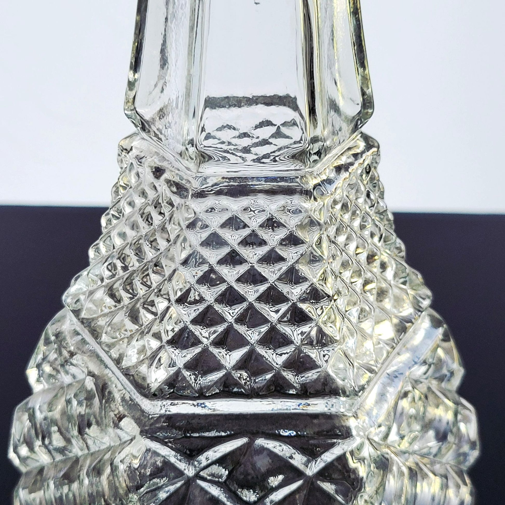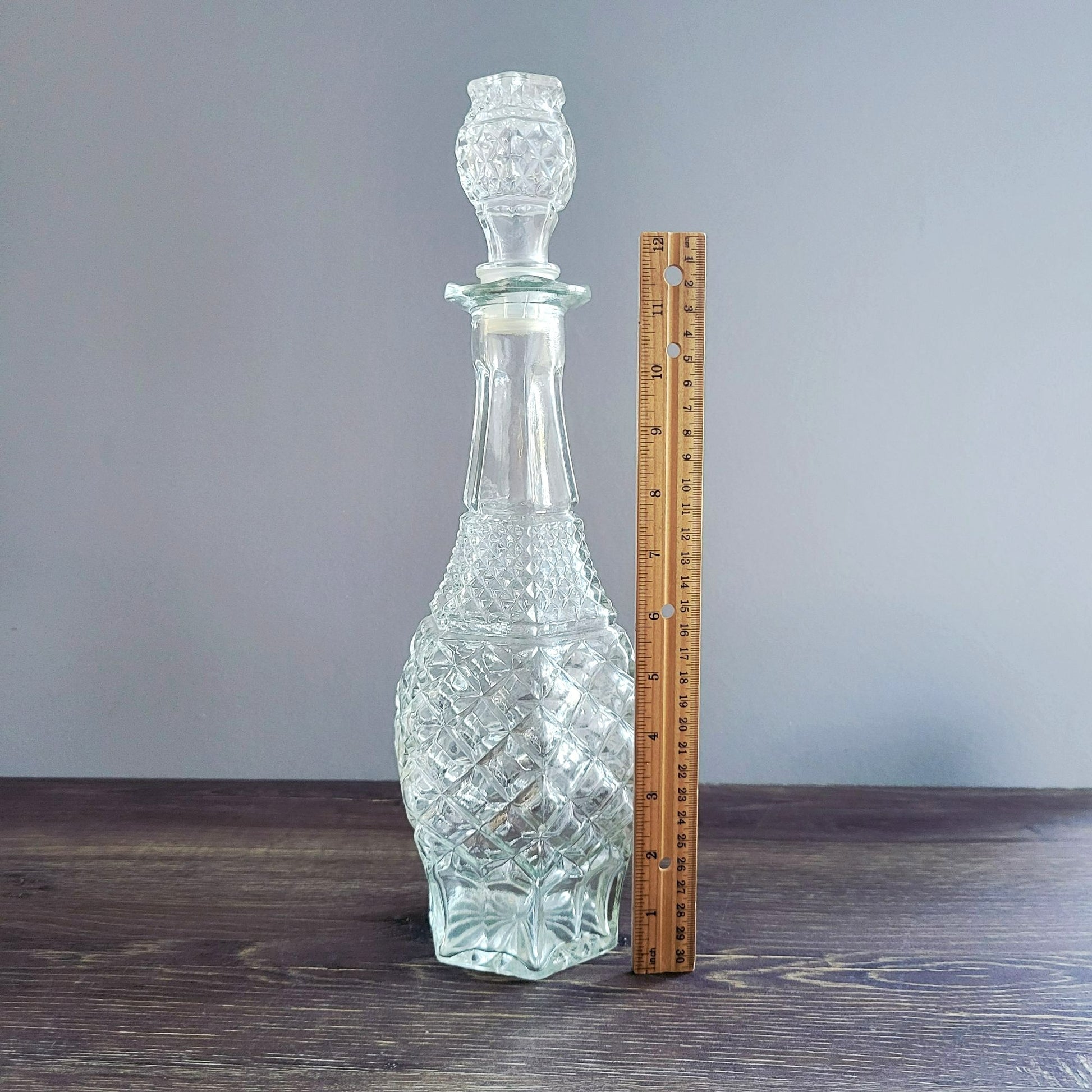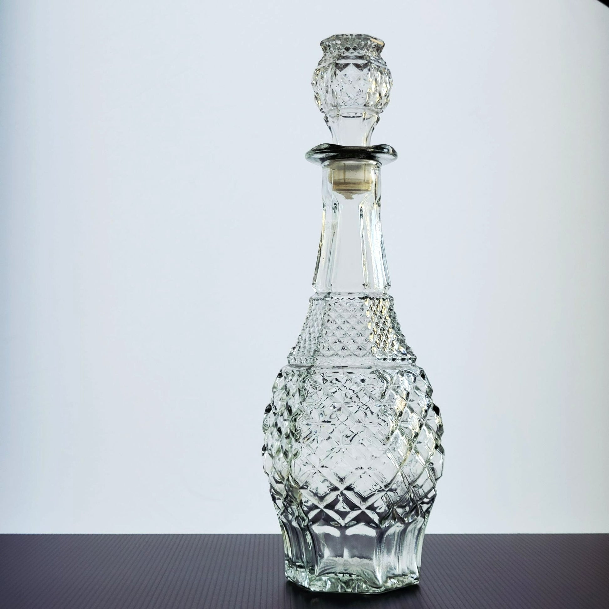 Vintage Anchor Hocking Wexford decanter with stopper features a classic criss-cross pattern. Made in the USA, this discontinued MCM glassware piece adds fun to any collection or decor.