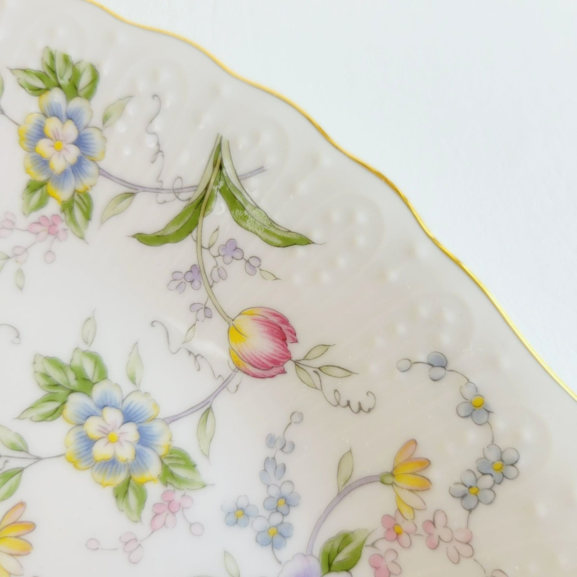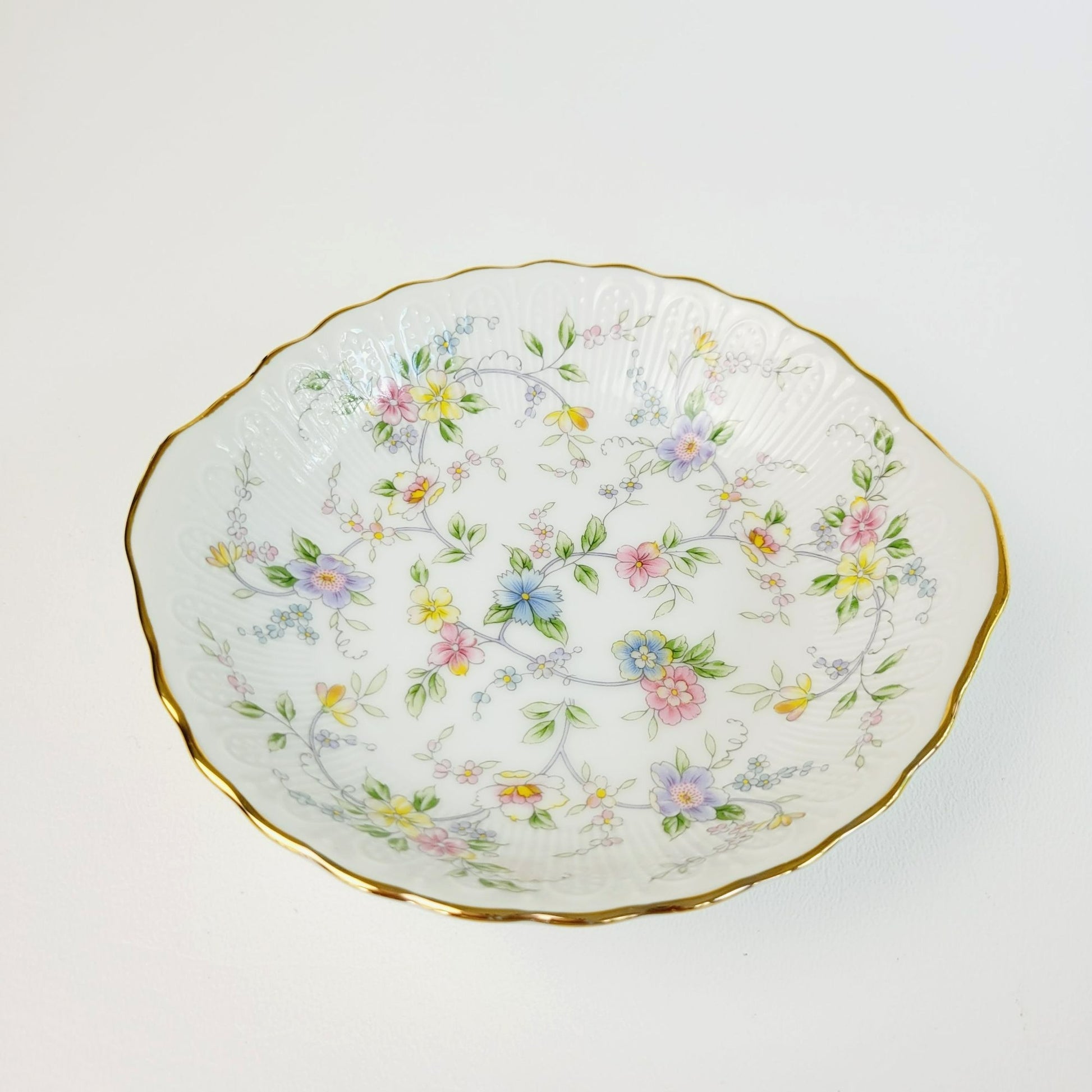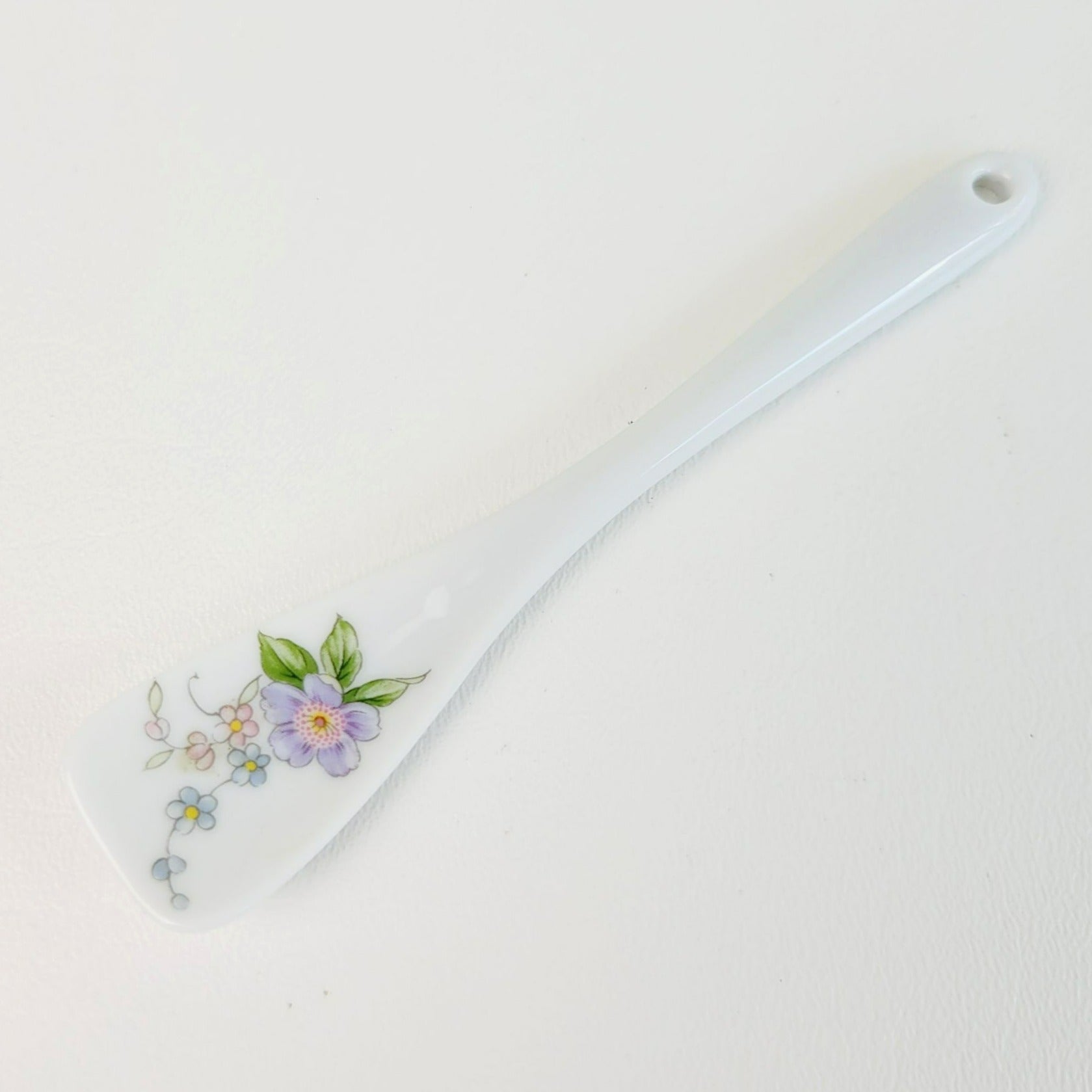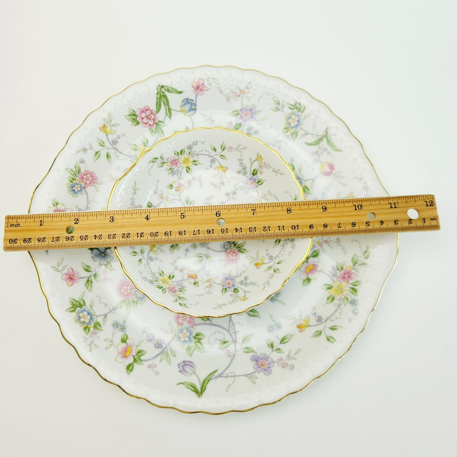 A charming vintage dessert plate set by Andrea by Sadek. Features a delicate floral pattern with gold trim and includes a matching spatula.