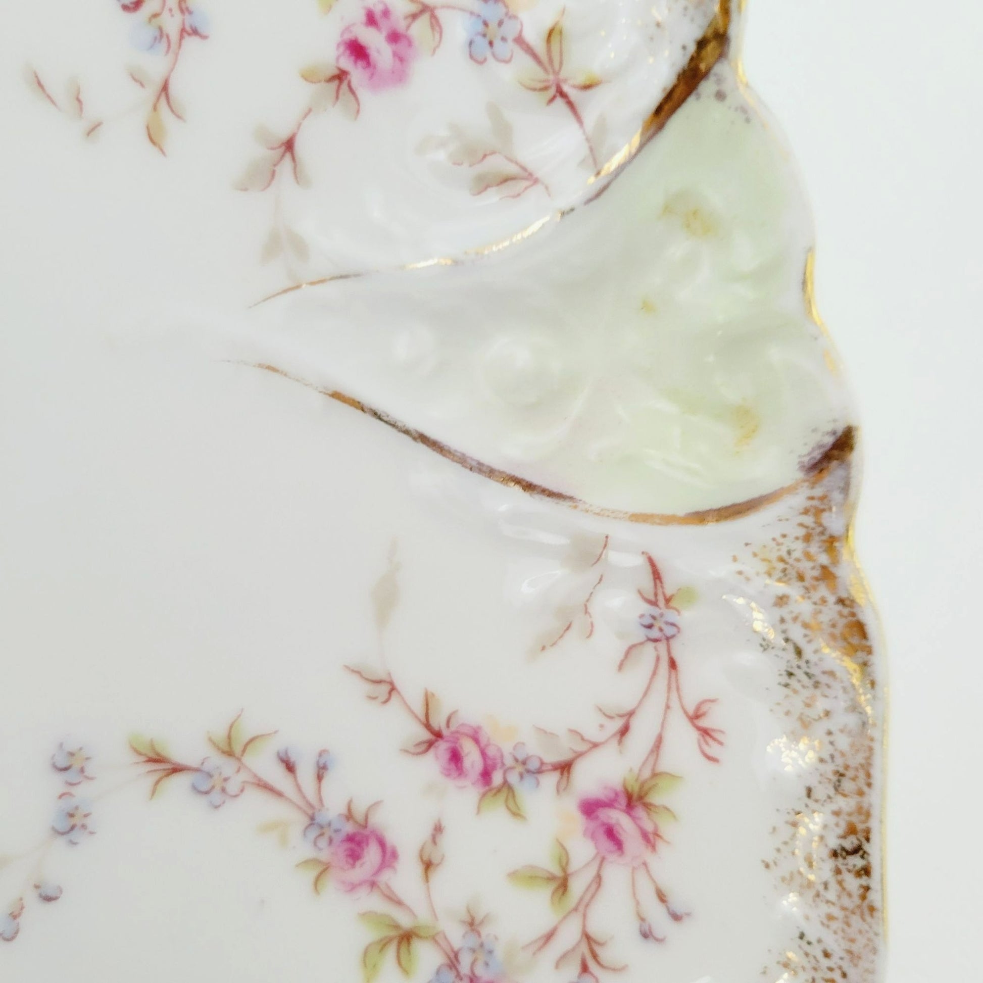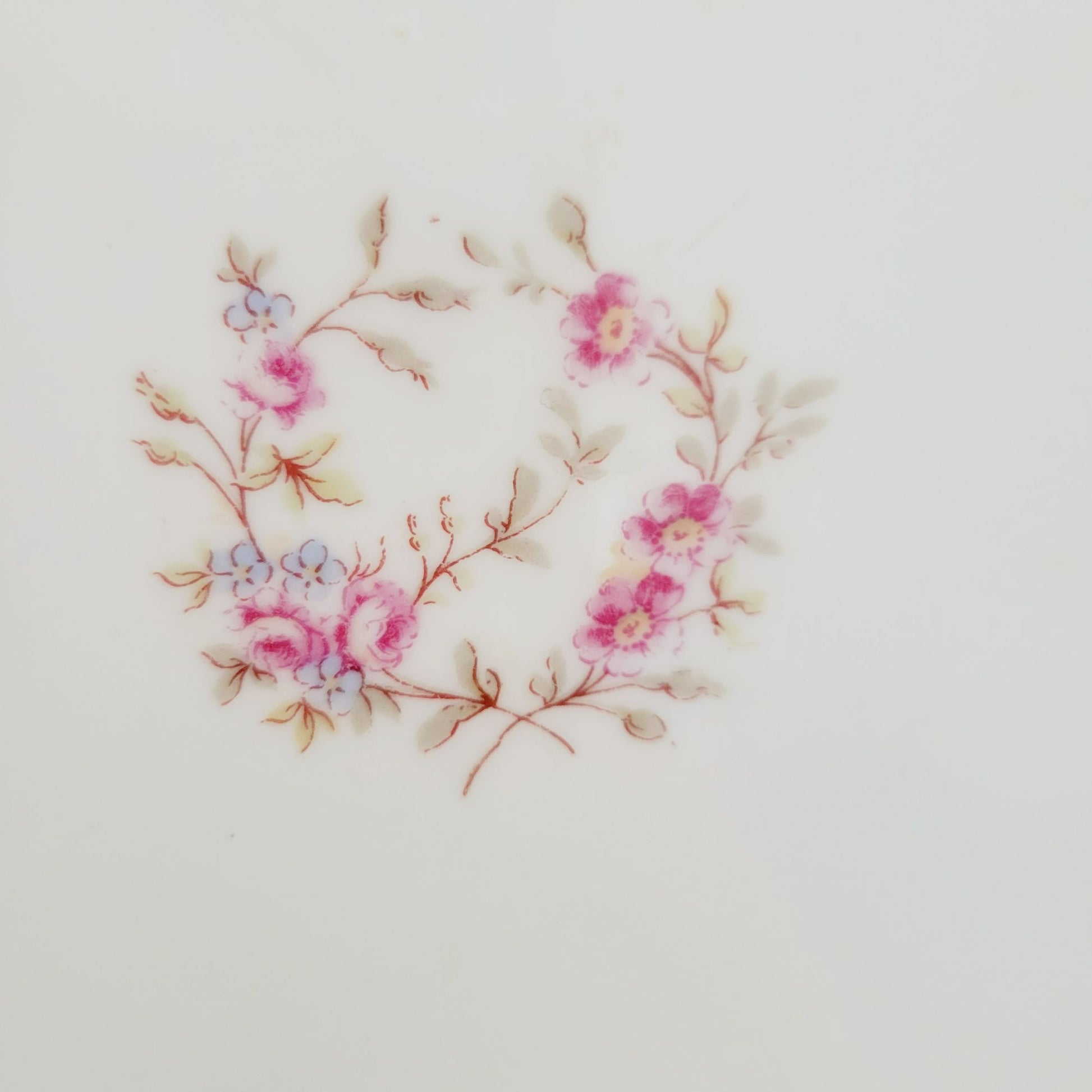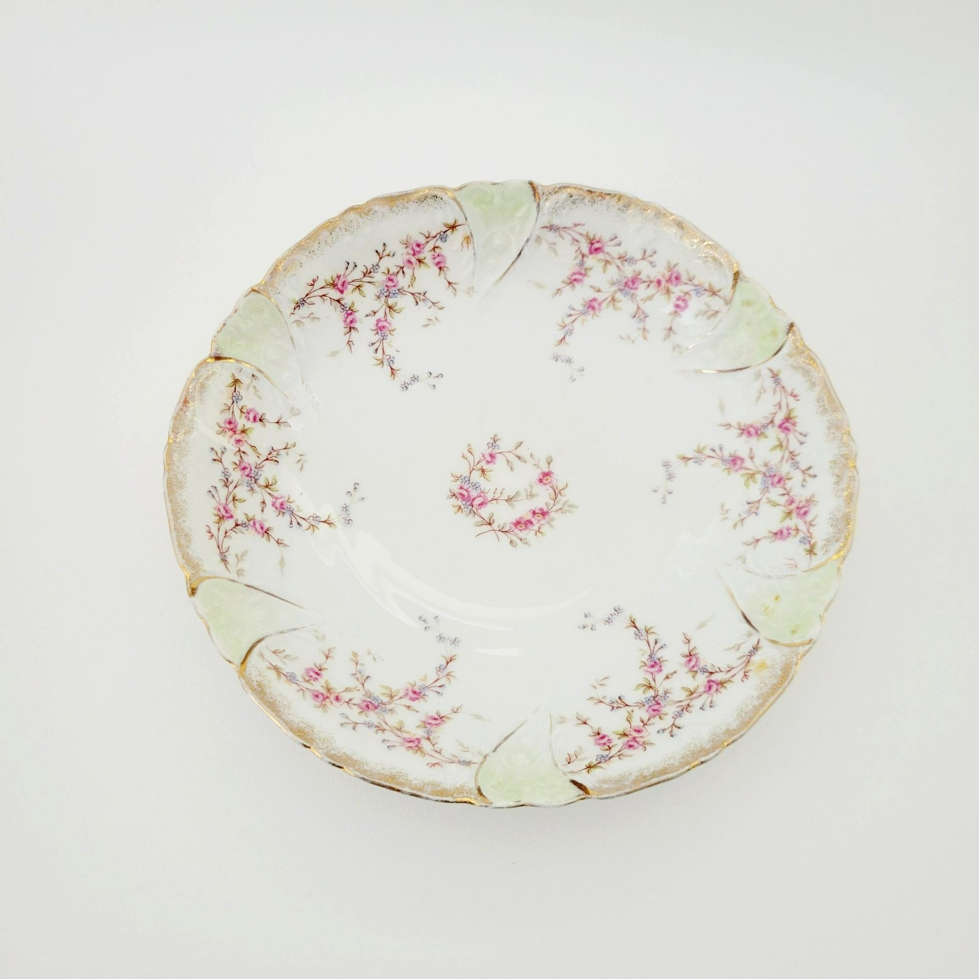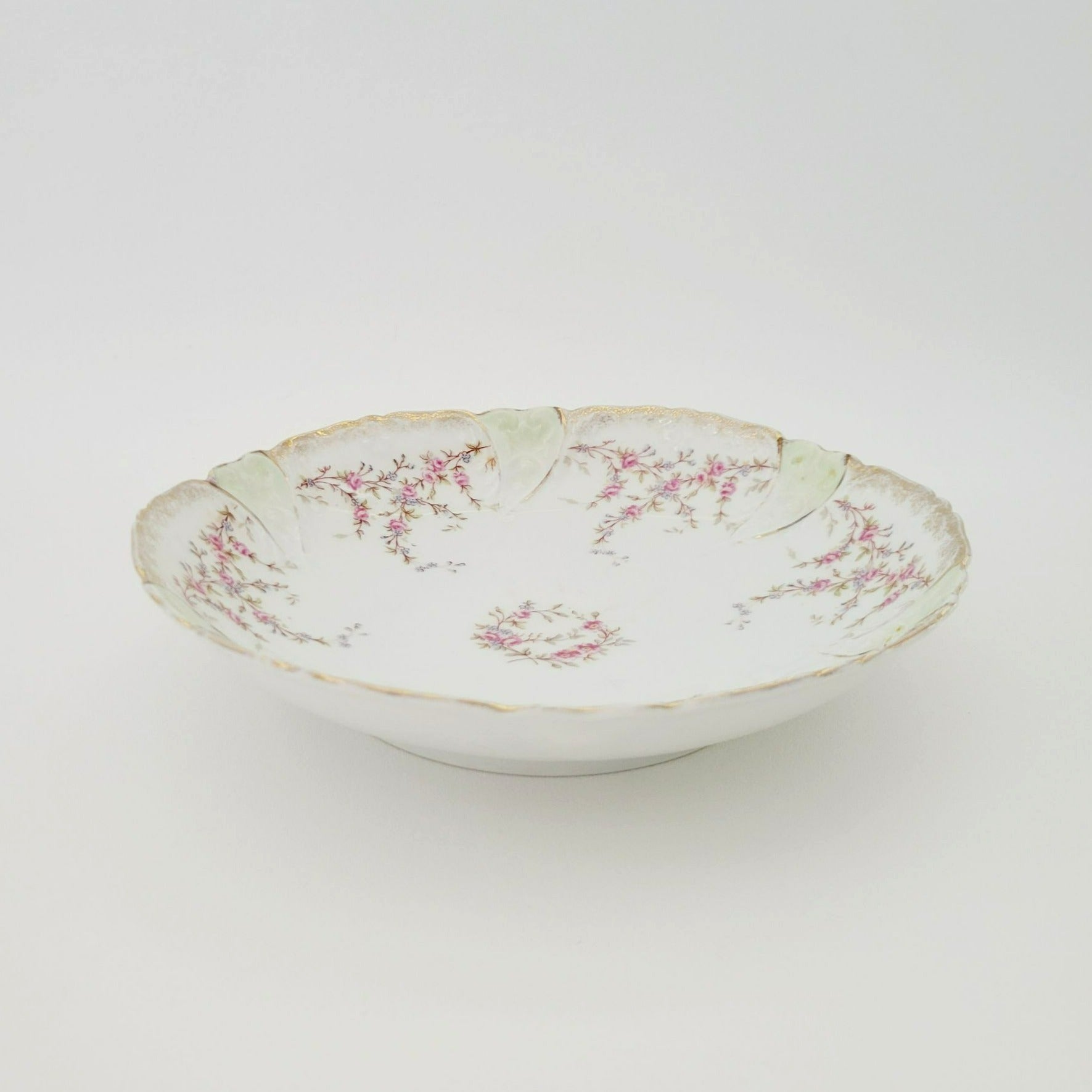 This Carl Tielsch Altwasser vintage shallow serving bowl is a stunning piece from c.1875-1935. It's hand painted in Germany with pink floral, gold and mint green accents on white porcelain.