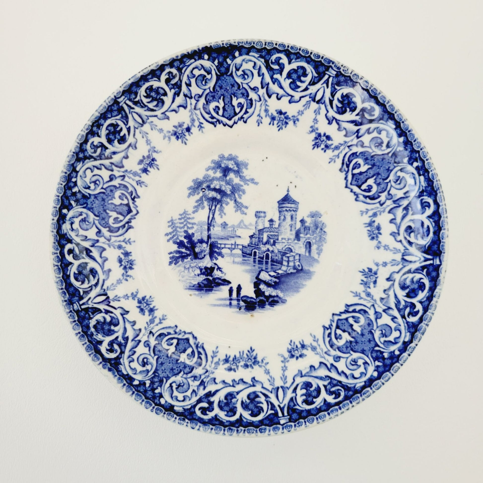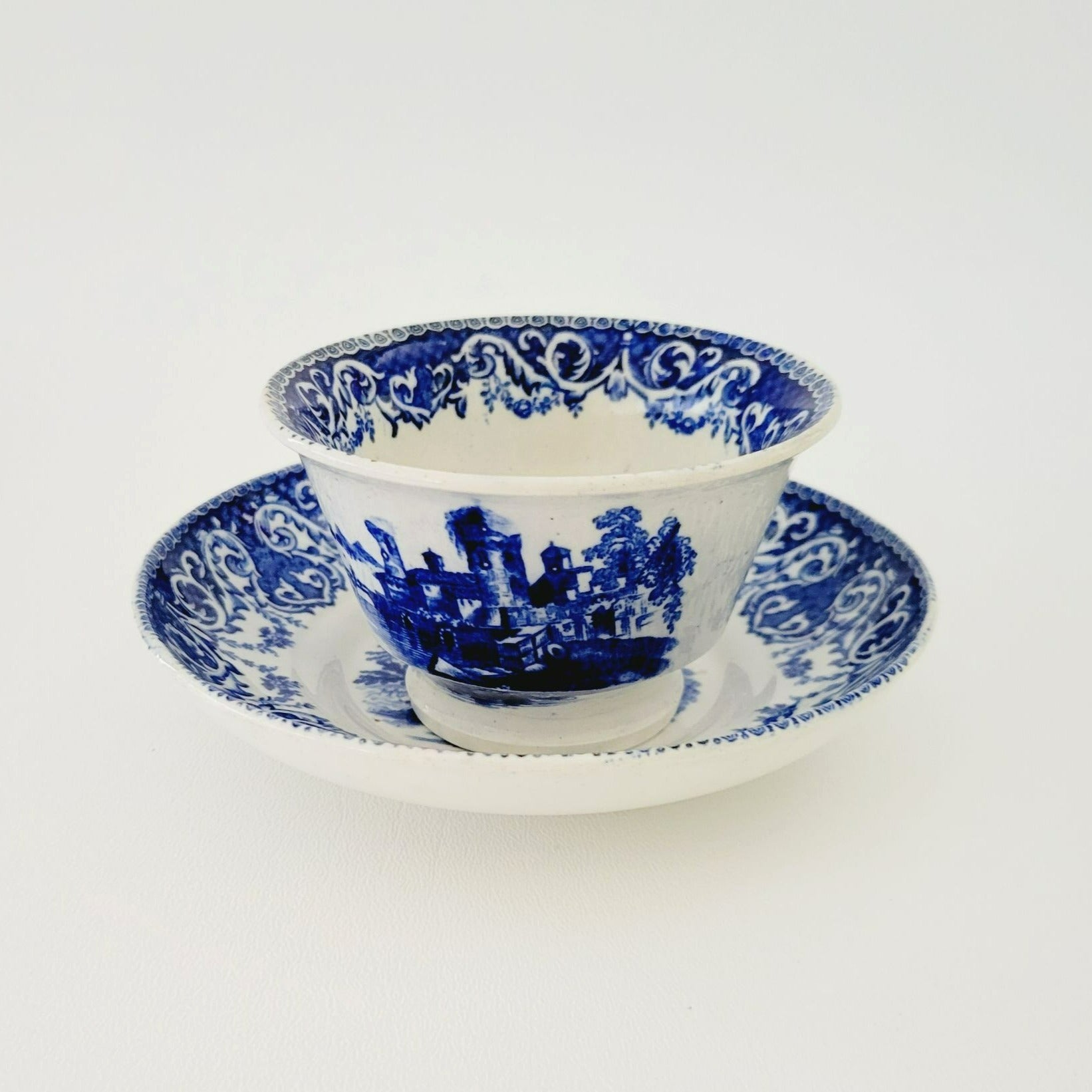 This antique E. Wood Kaolin Ware Flow Blue Tea Bowl and Saucer, c.1818-46, features a beautiful blue and white countryside castle and lake design. Perfect for collectors of English pottery, it can hold up to 4fl. oz.