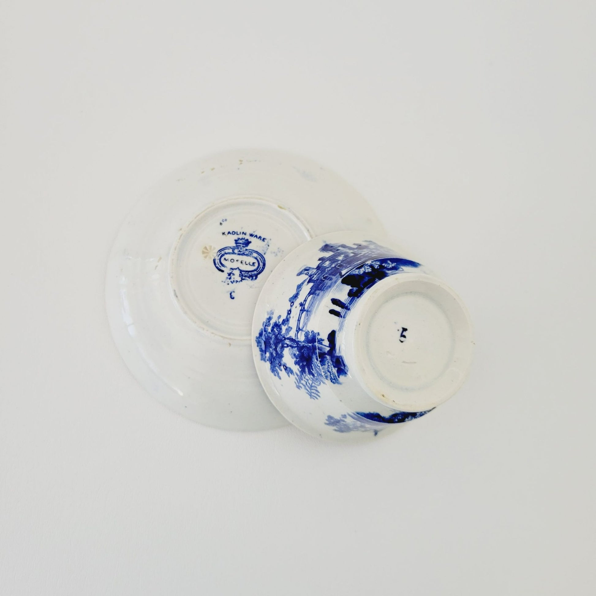 Antique E. Wood Kaolin Ware Flow Blue Tea Bowl and Saucer, c.1818-46 England