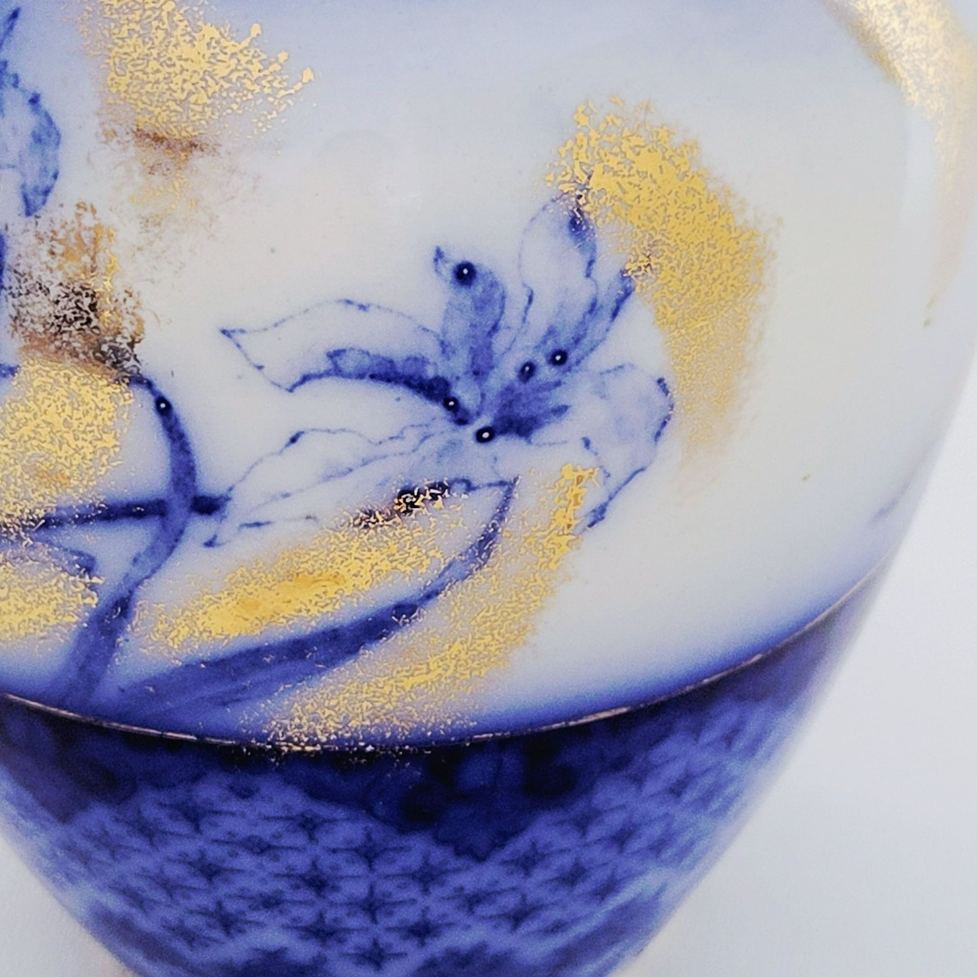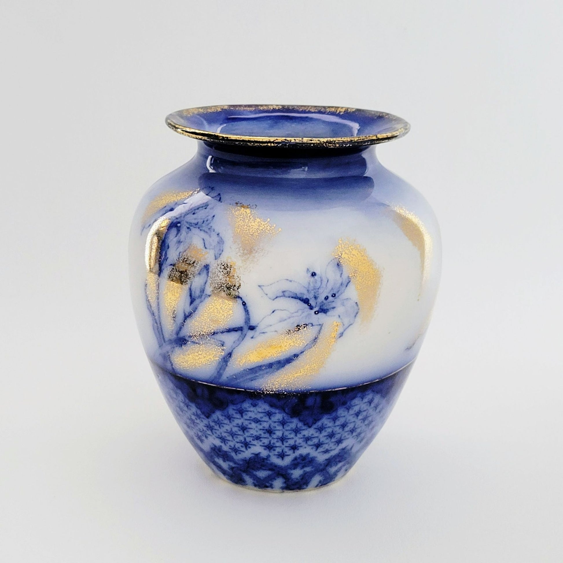 This Antique Flow Blue & Gold Vase by Edge Malkin & Co. is a beautiful vintage collector's item. Made between 1891-1903 in Burslem, England, it adds a touch of elegance to any home decor with its vibrant blue and white colors.