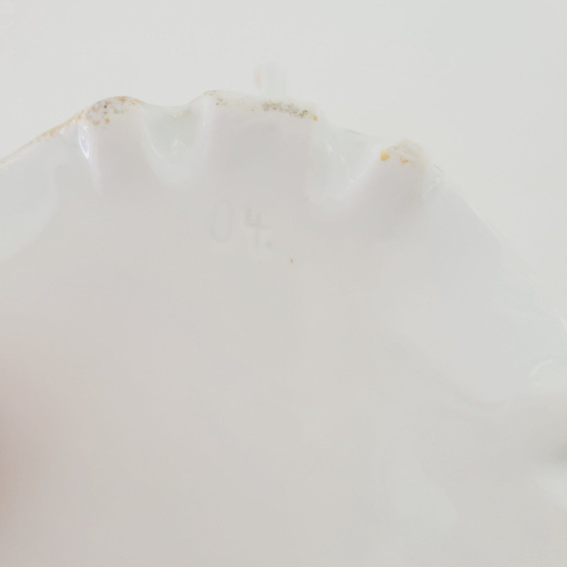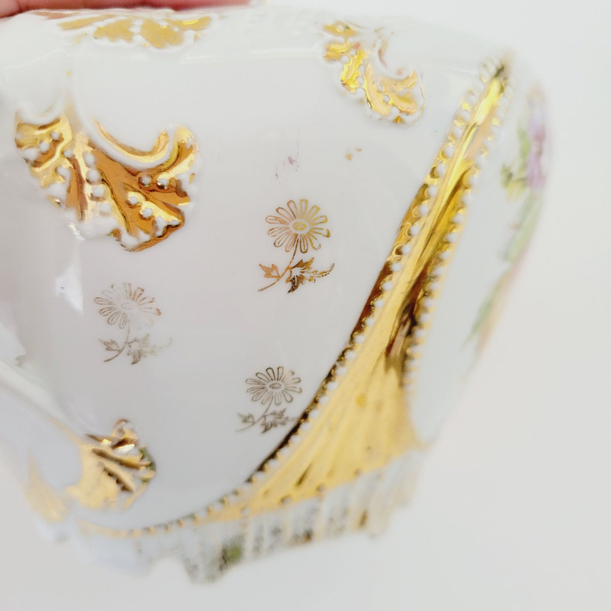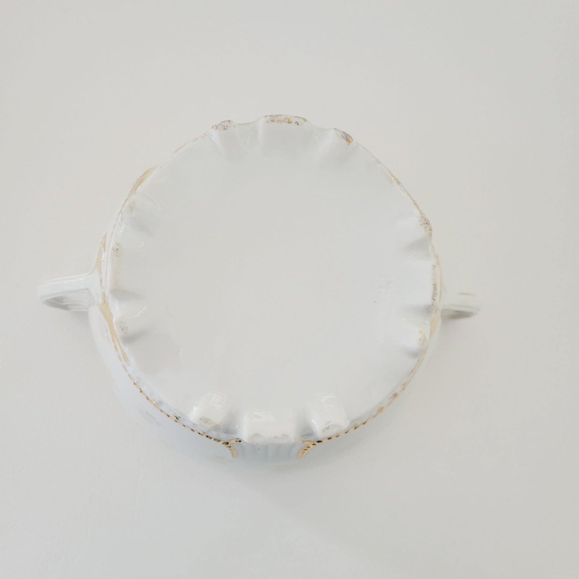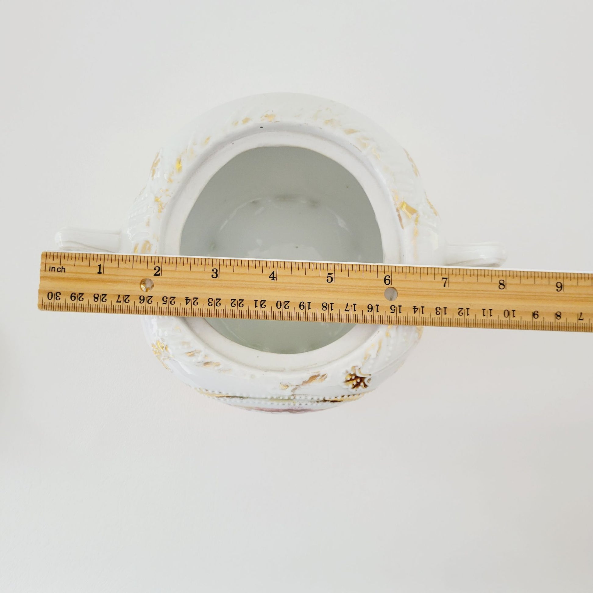 This Antique White & Gold Biscuit Jar is a beautiful piece of German pottery in a Baroque and Art Nouveau style. The jar features floral and fruit designs embossed on porcelain, making it a stunning addition to any kitchen décor.
