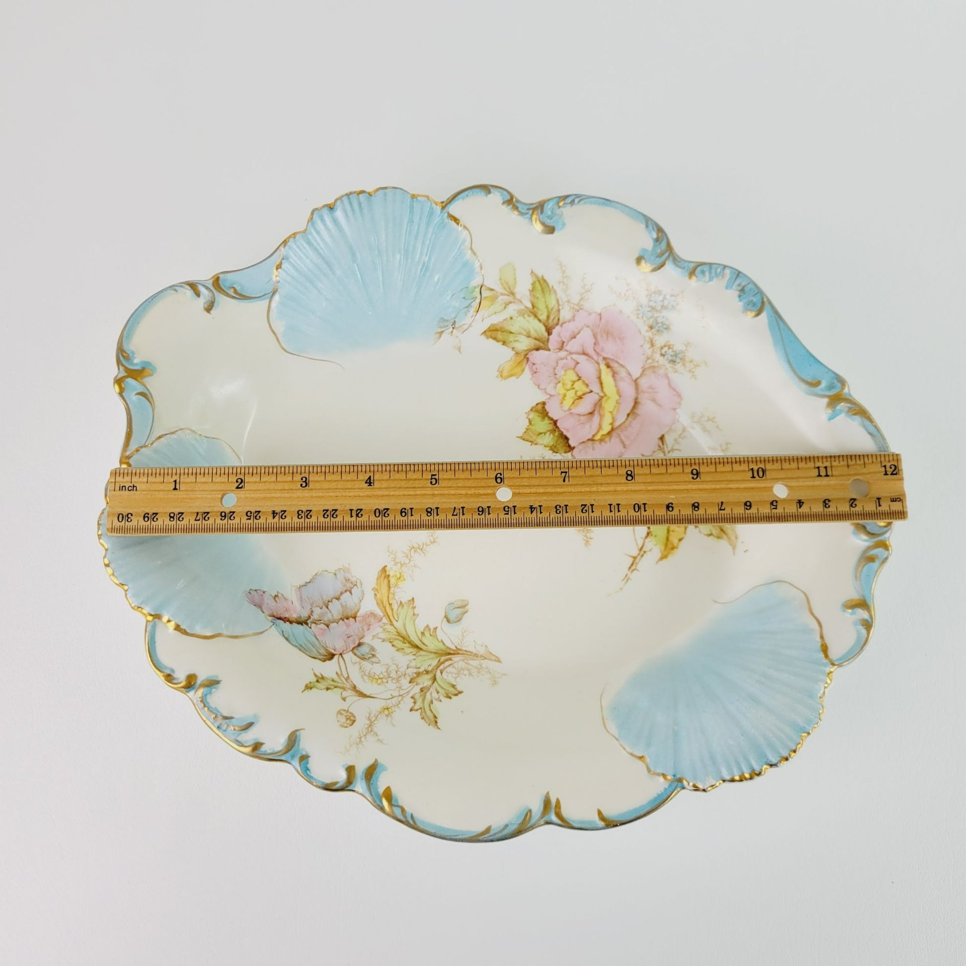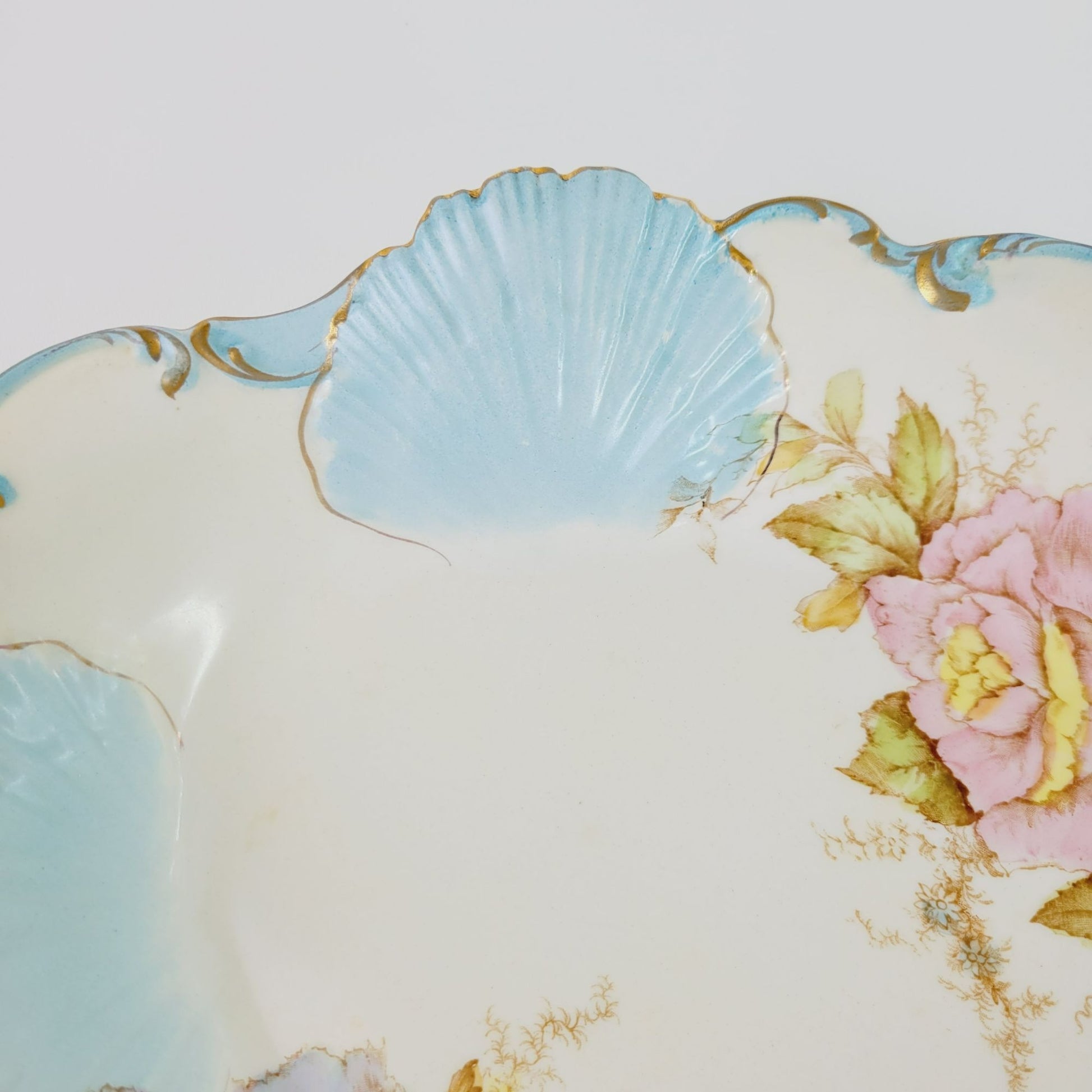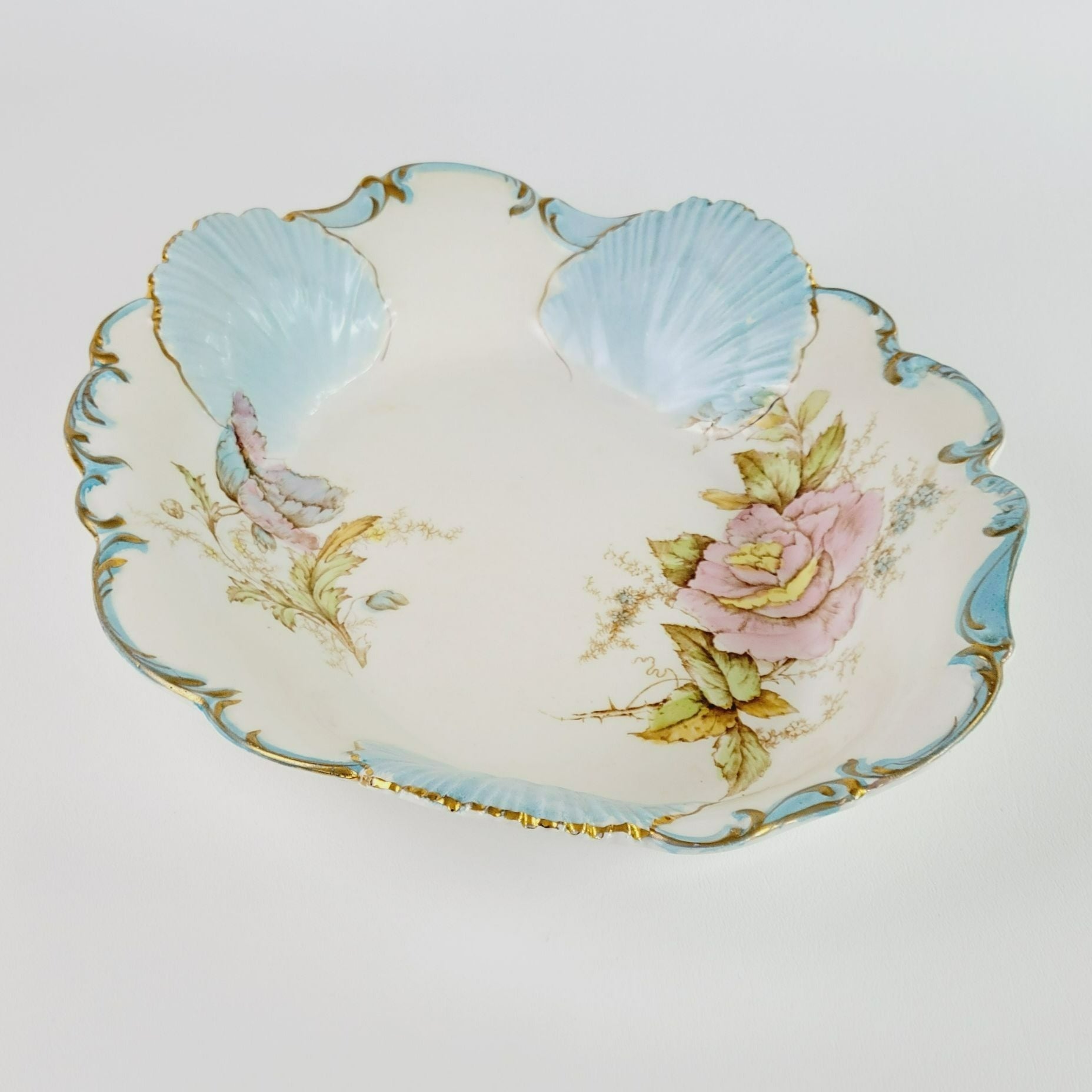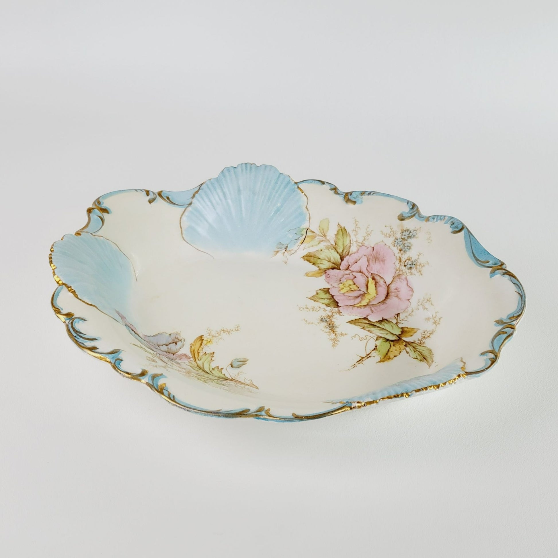 Antique French China Porcelain Bowl: Blue Shell & Pink Floral, Gold Trim, c.1900-16 La Francaise by French China Co