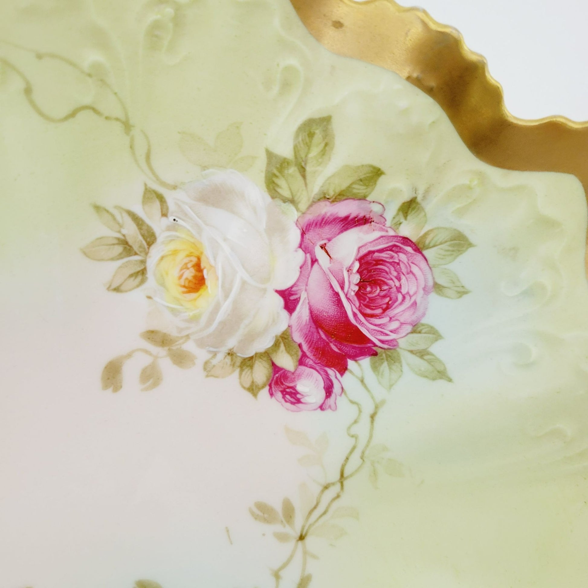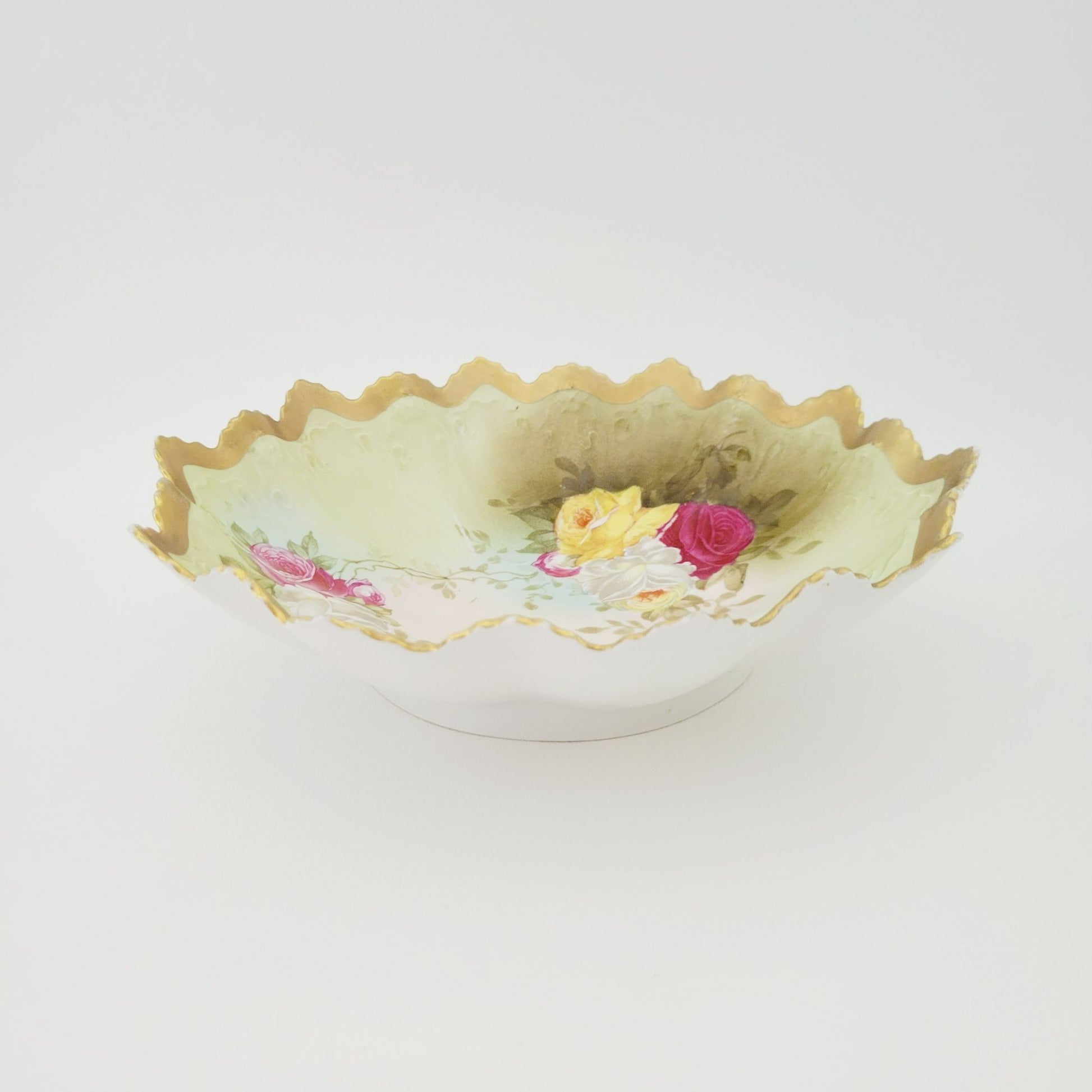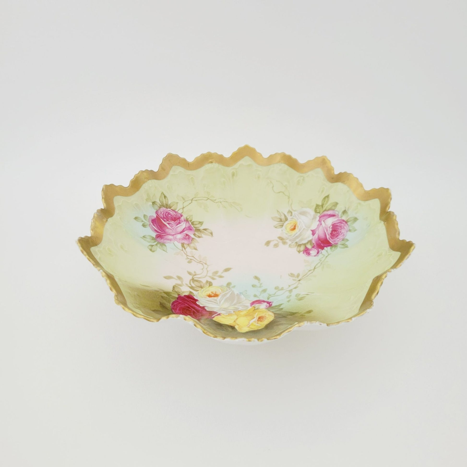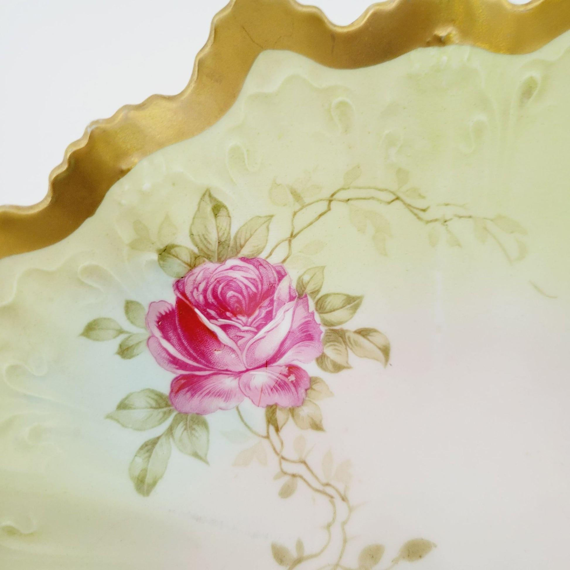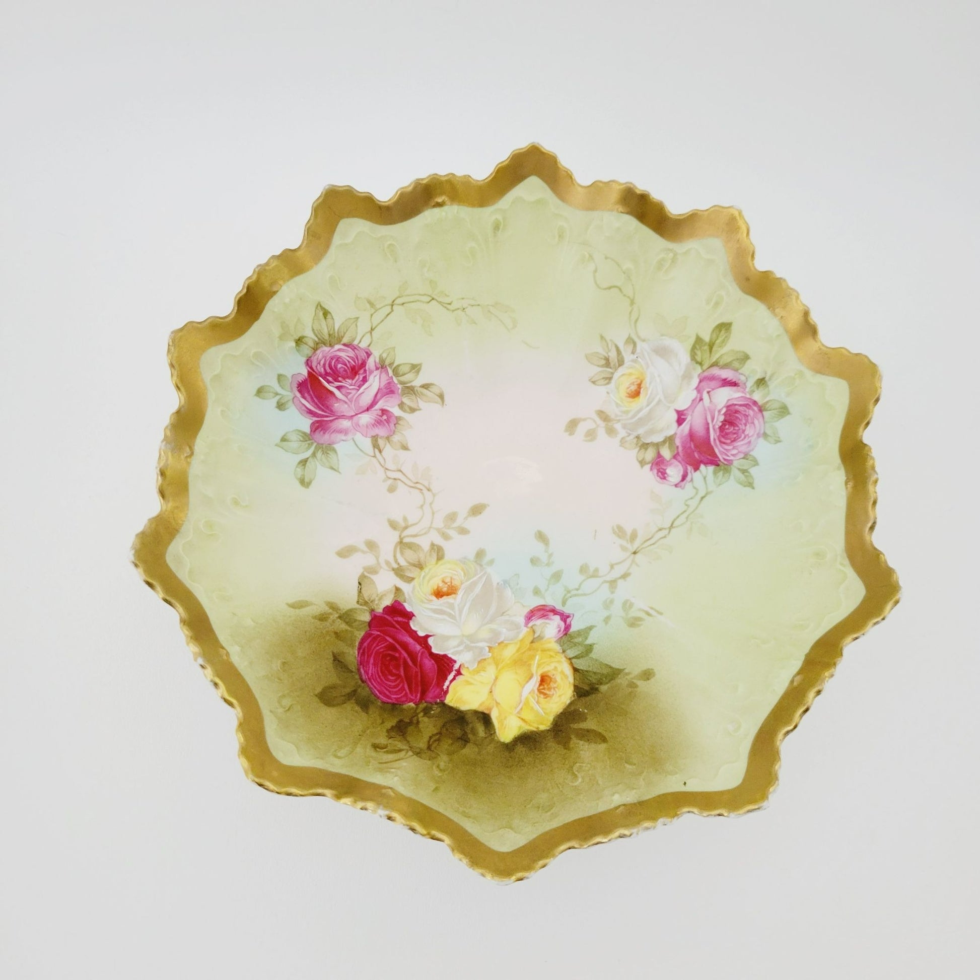 Antique M.Z Austria Cabinet Bowl, Hand Painted Green with Roses, Heavy Gold & Embossed Edging c.1884-1909
