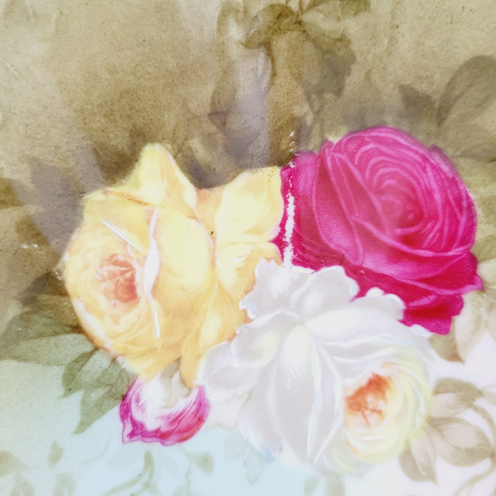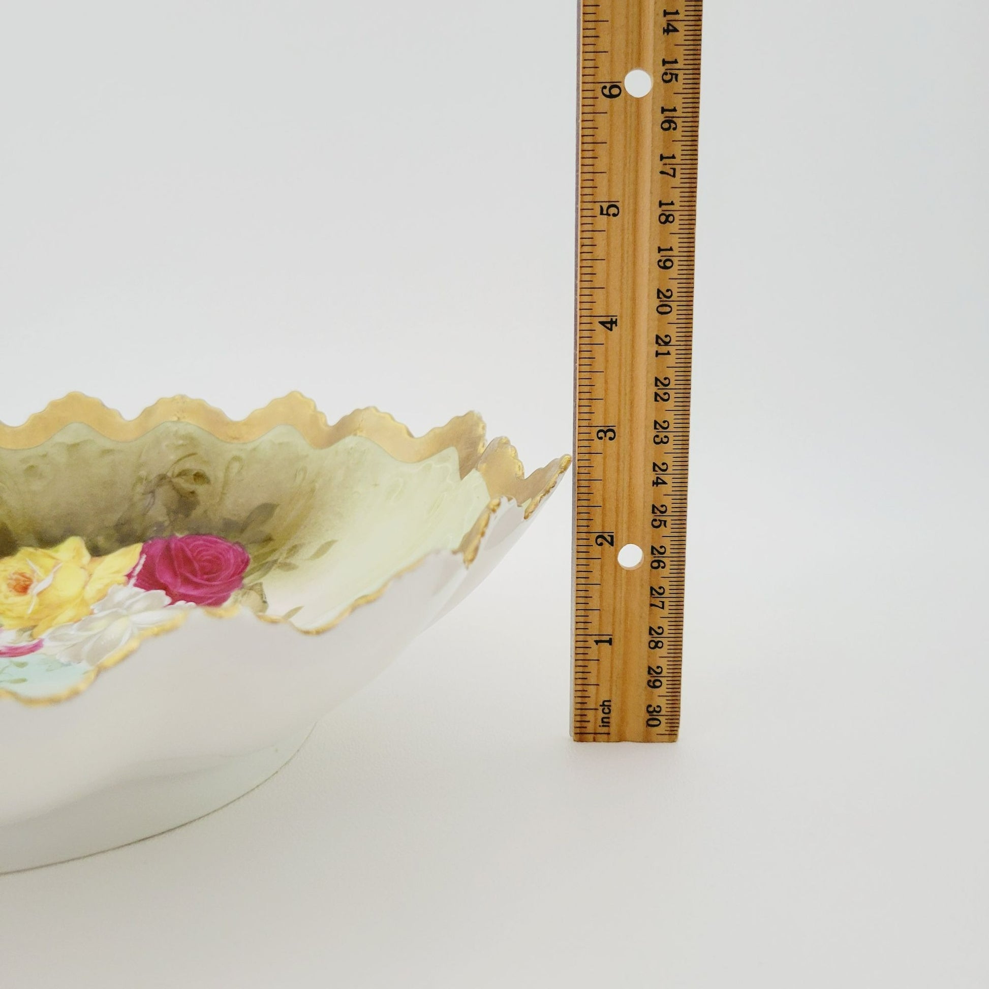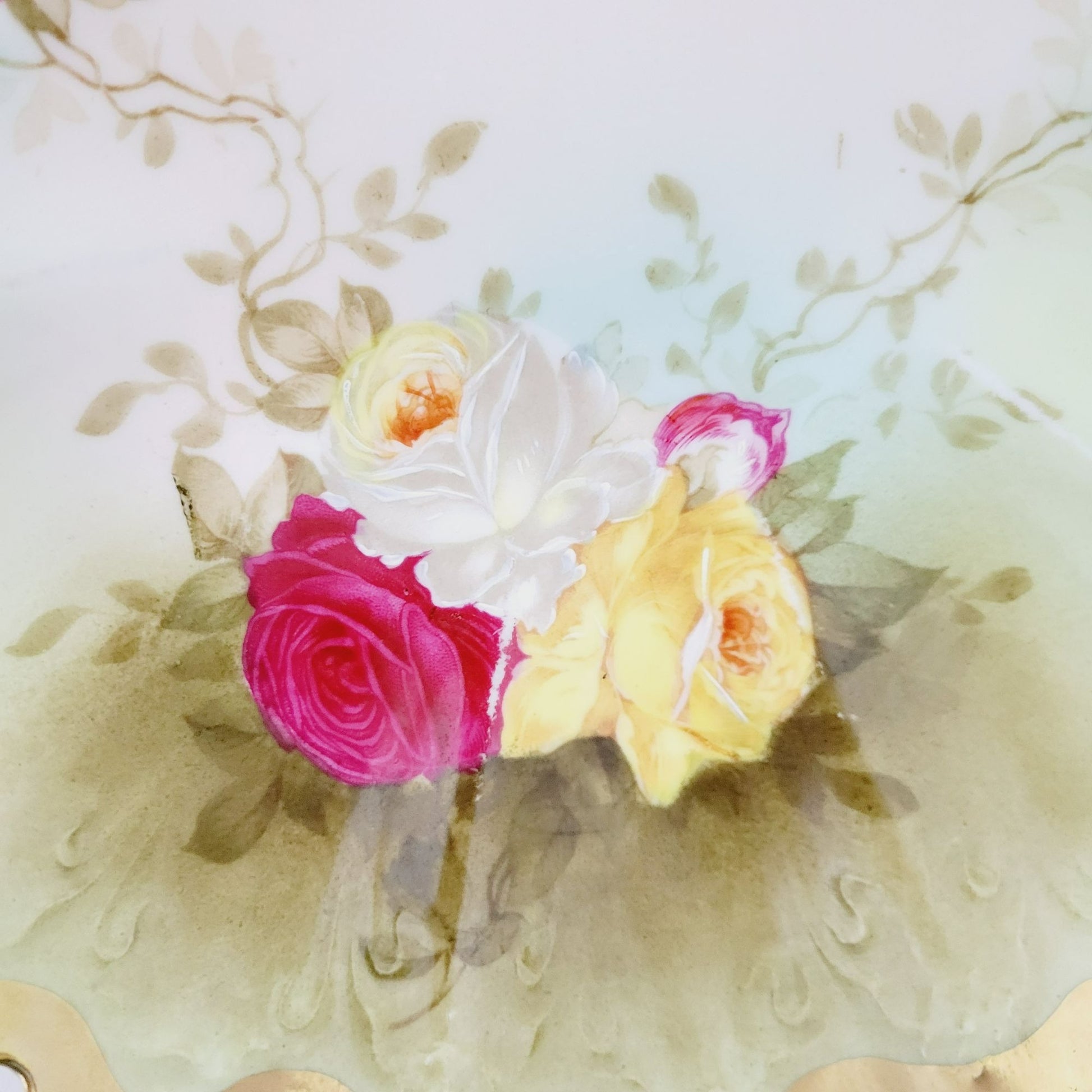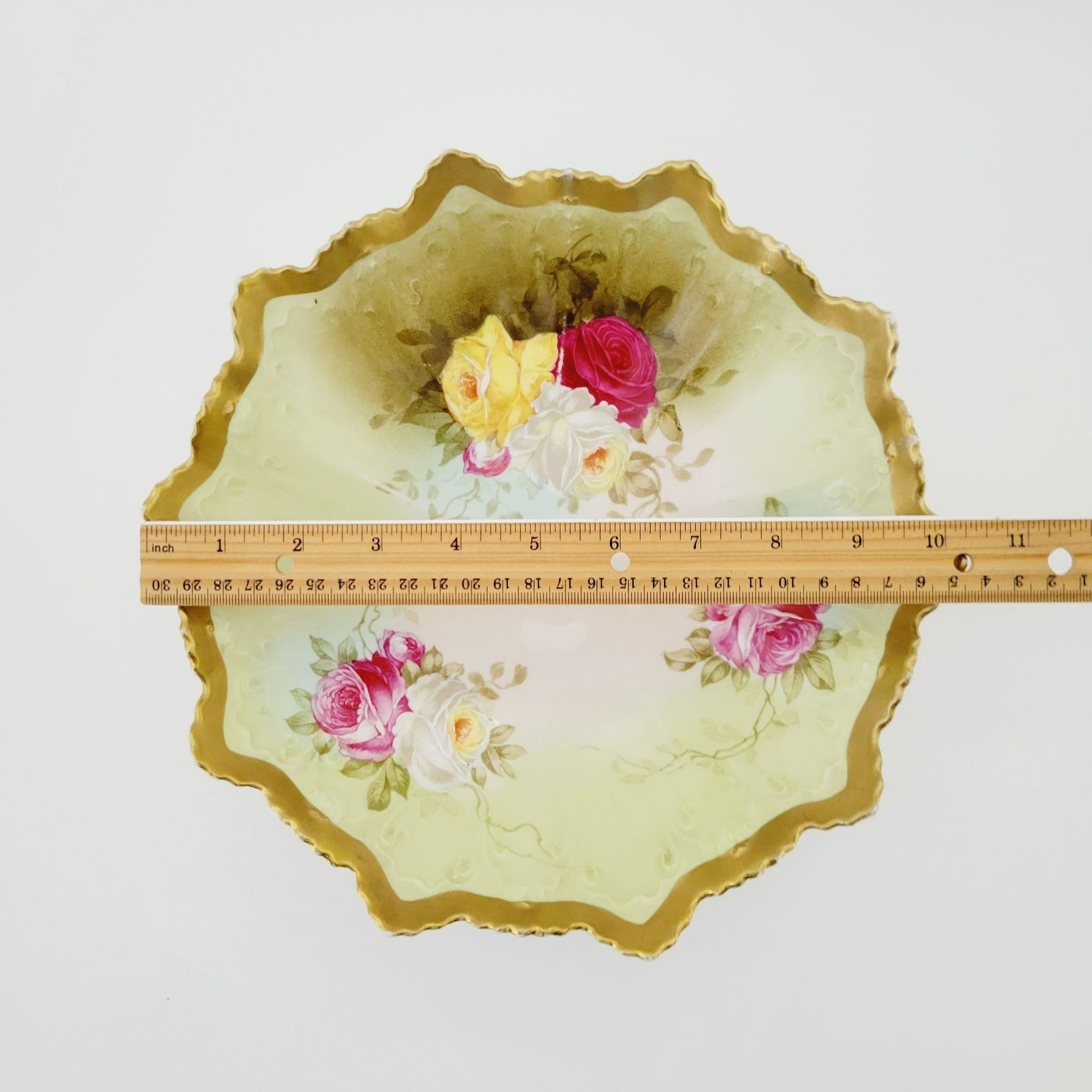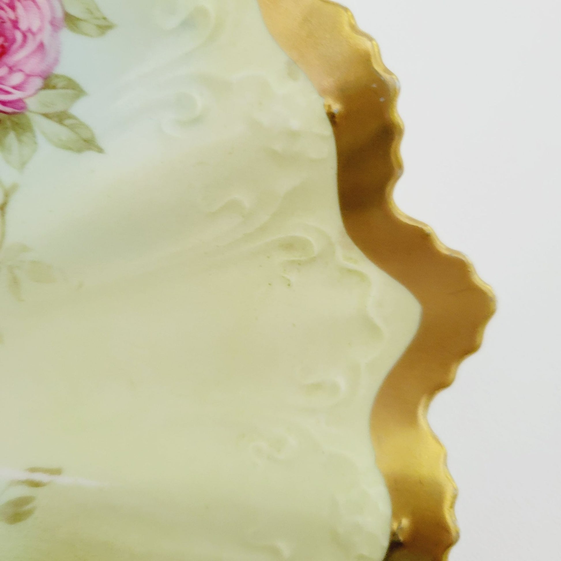 Antique M.Z Austria Cabinet Bowl, Hand Painted Green with Roses, Heavy Gold & Embossed Edging c.1884-1909