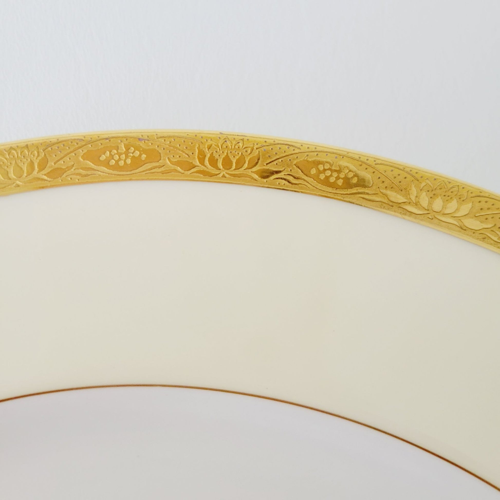 This Antique Chicago Burley & Co Mintons Dinner Plate is an embodiment of luxury. Made in England c.1873-1912, the 10.25" plate features Gold Encrusted Lotus Trim with Ivory Border, made of Bone China.