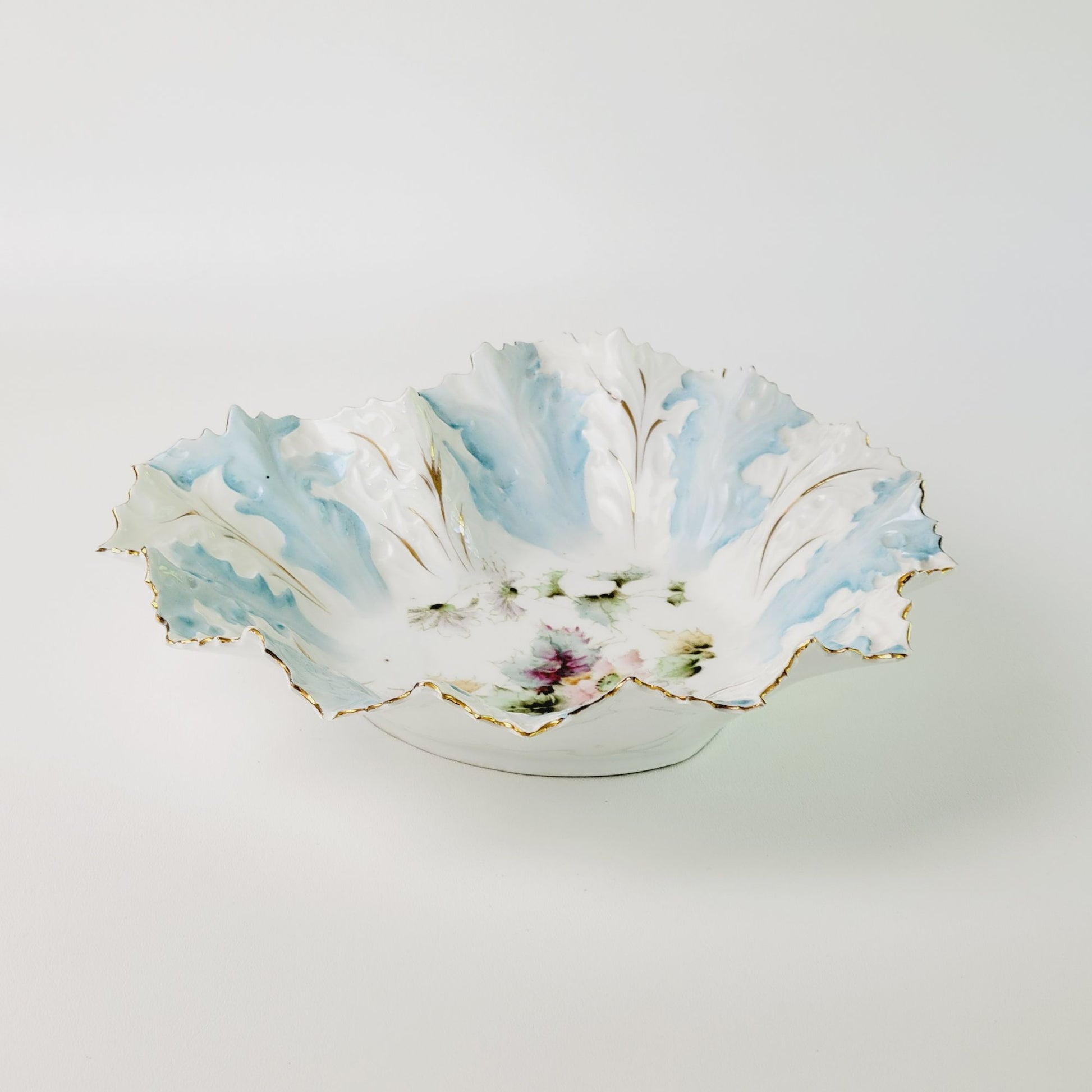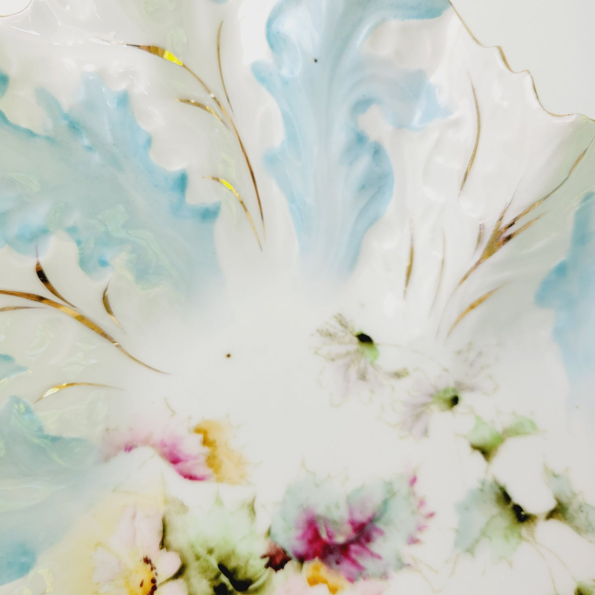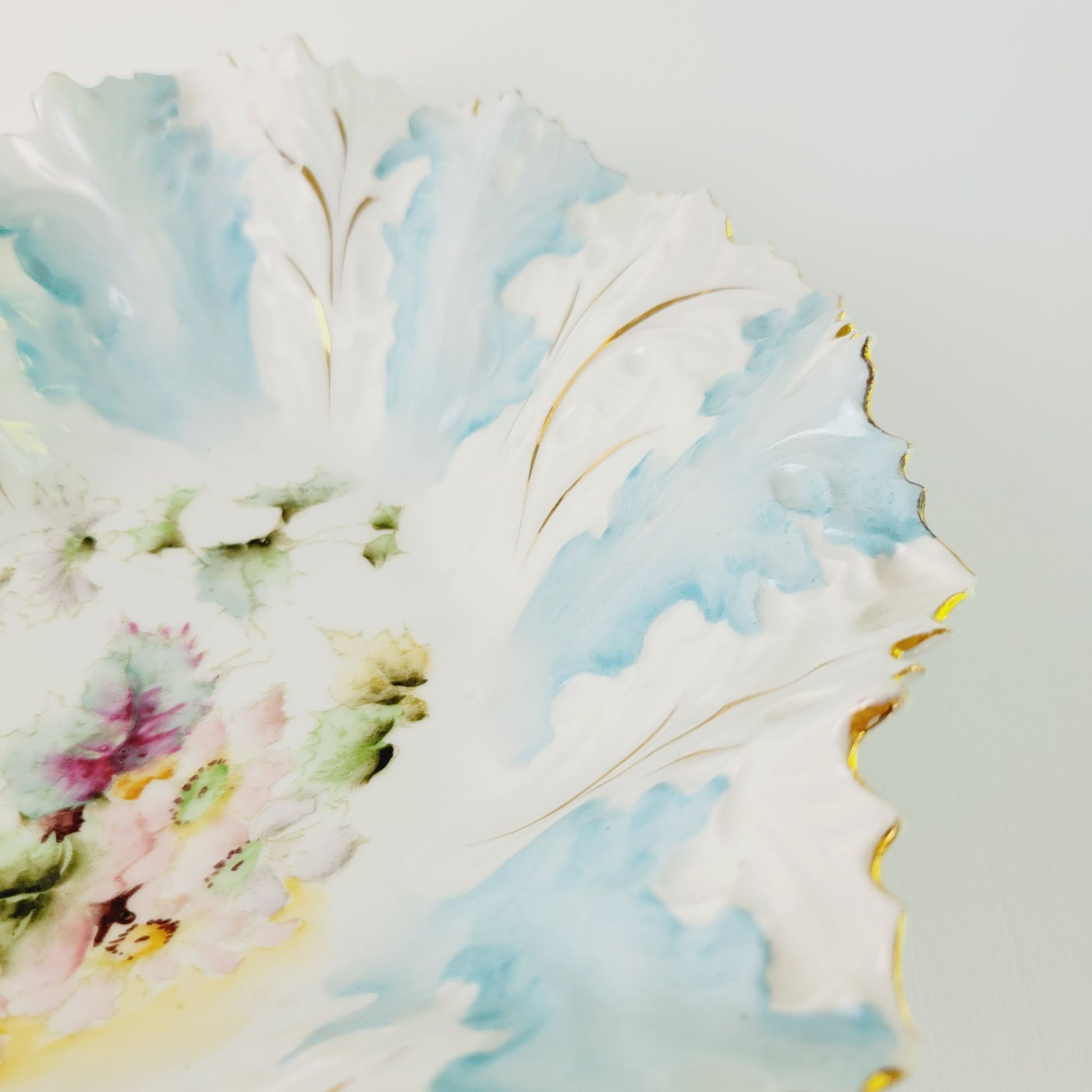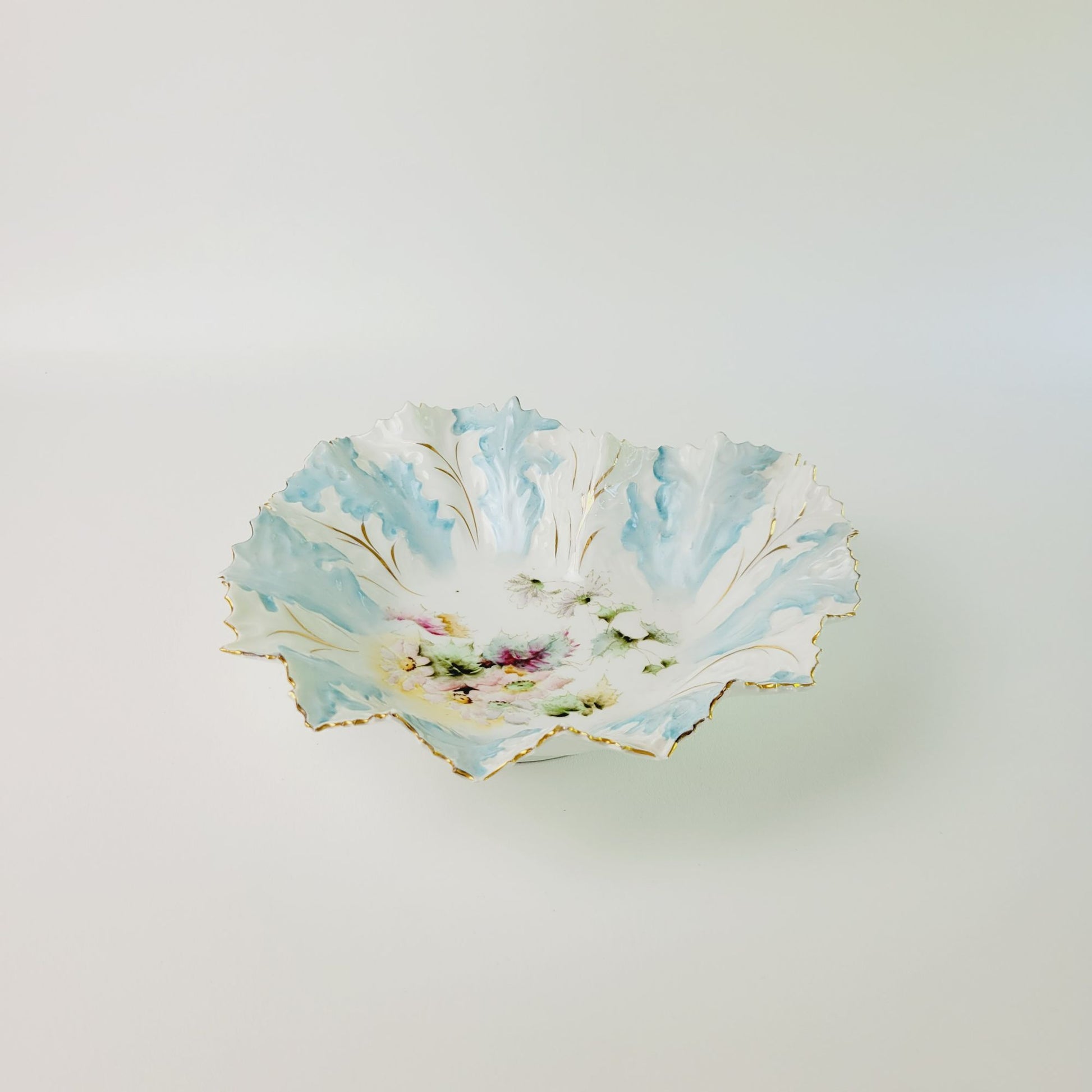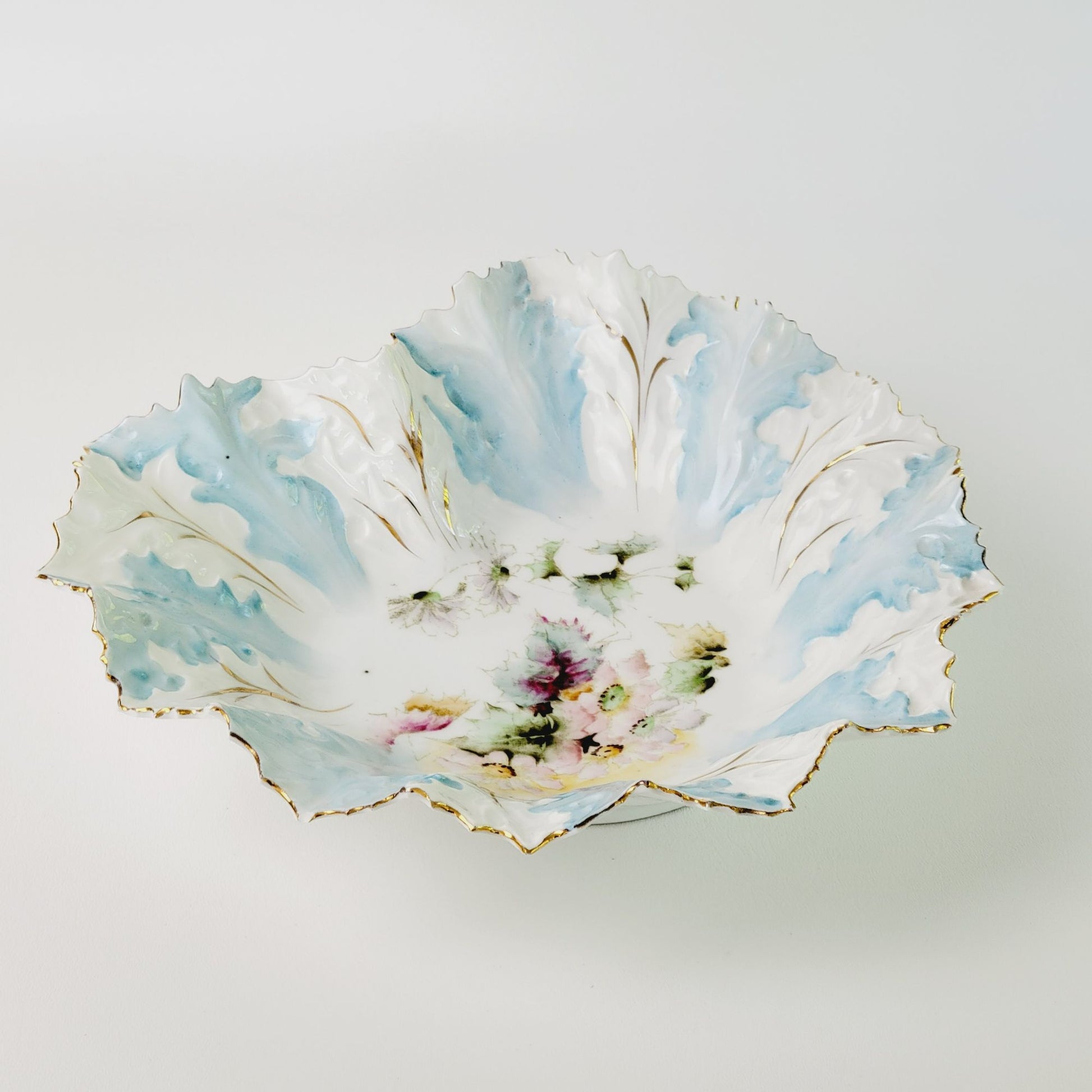 This antique RS Prussia bowl, c.1890s, features a heart-shaped design with light robin blue and white coloring with gold gilded and embossed accents and floral and leaves center design. Seller verified it is mold number OM5 based off research found in published books.