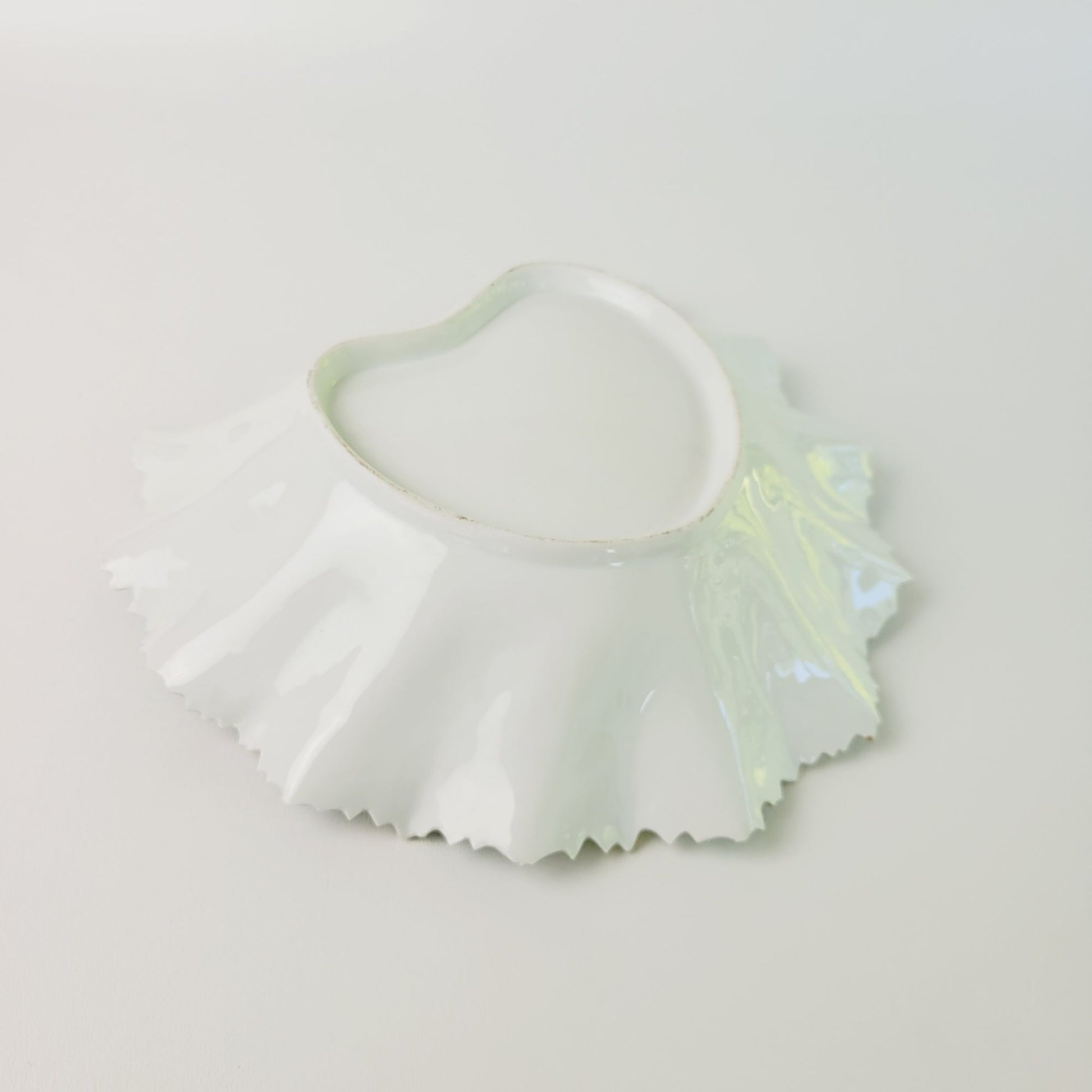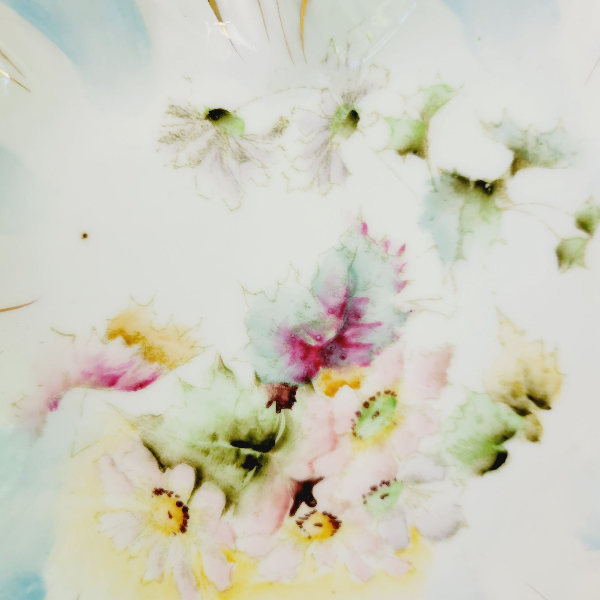 Overall piece is in good condition, there are no cracks. There are a few tiny chips on the edging points, but are very hard to see due to the design. Seller had to feel for the chips as they are hard to see. The center does have wear.
