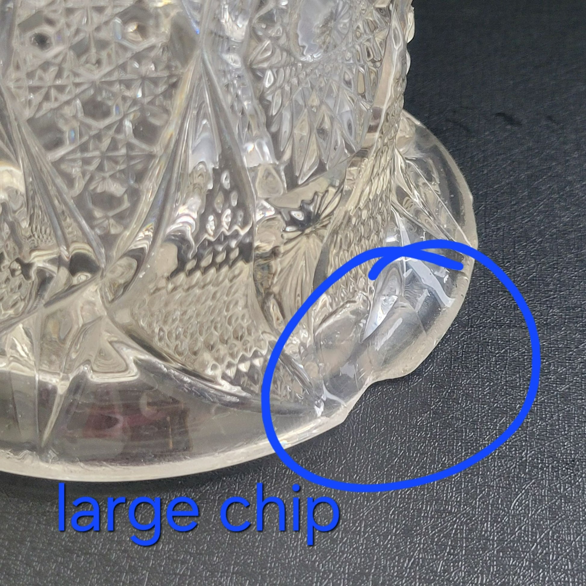 Pitcher is in overall good condition for the age, however there is a large chip on the bottom edge. The busy pattern does make it less visible.