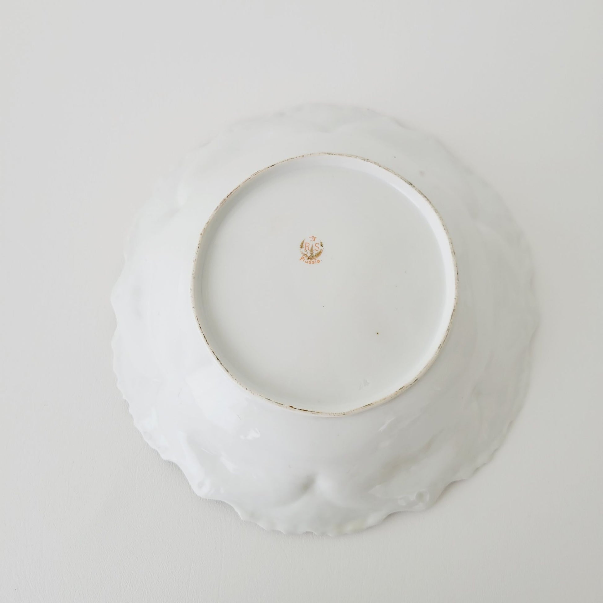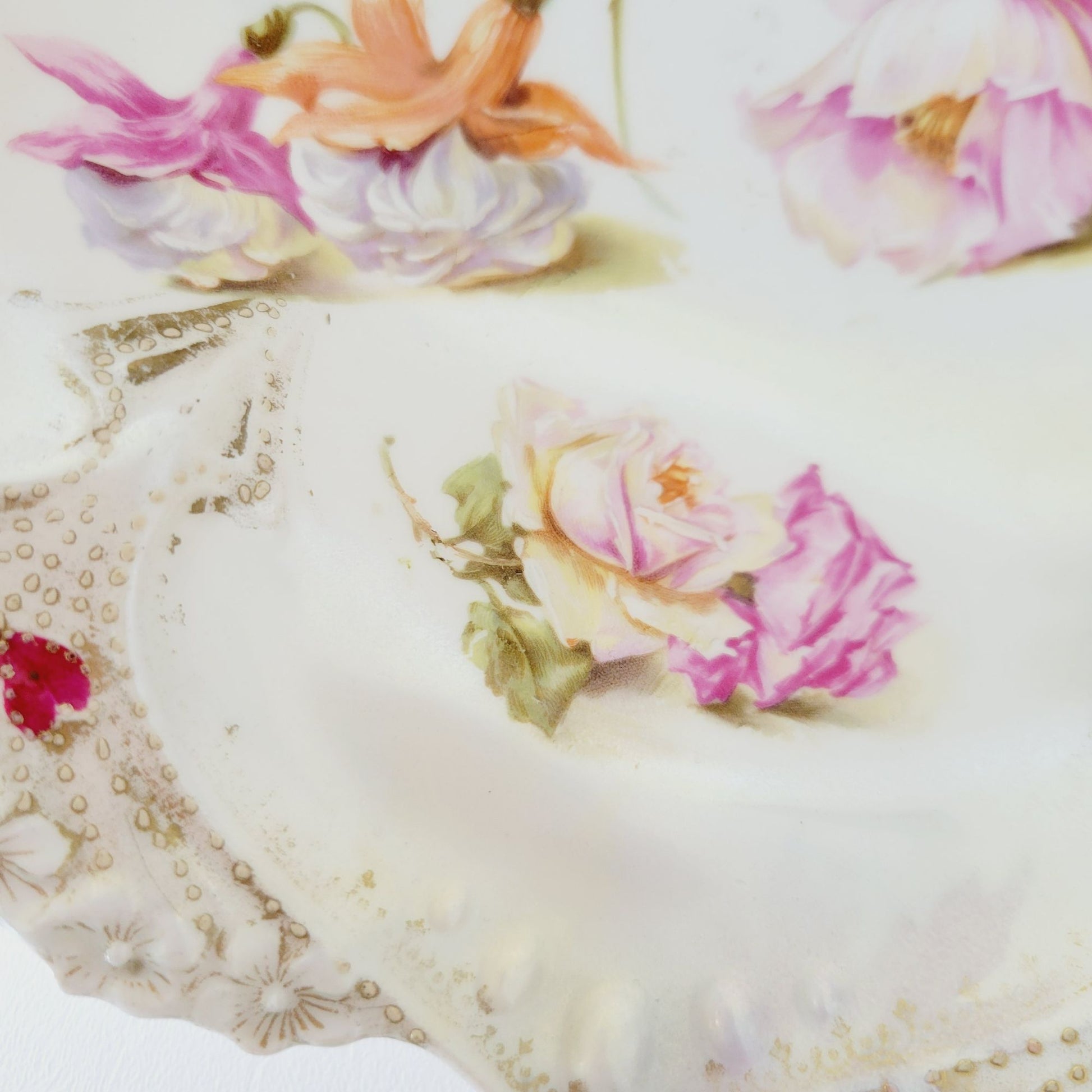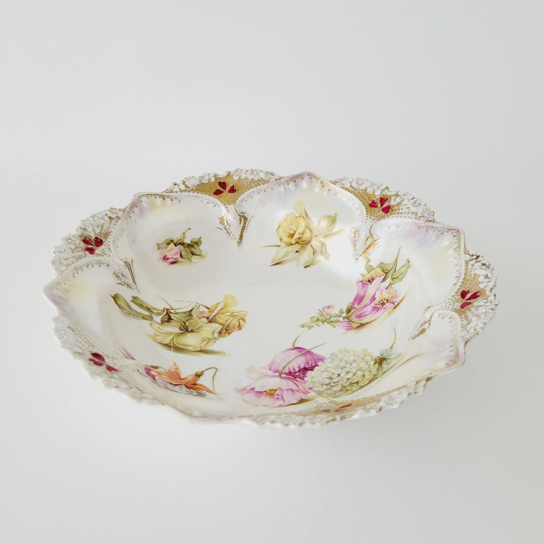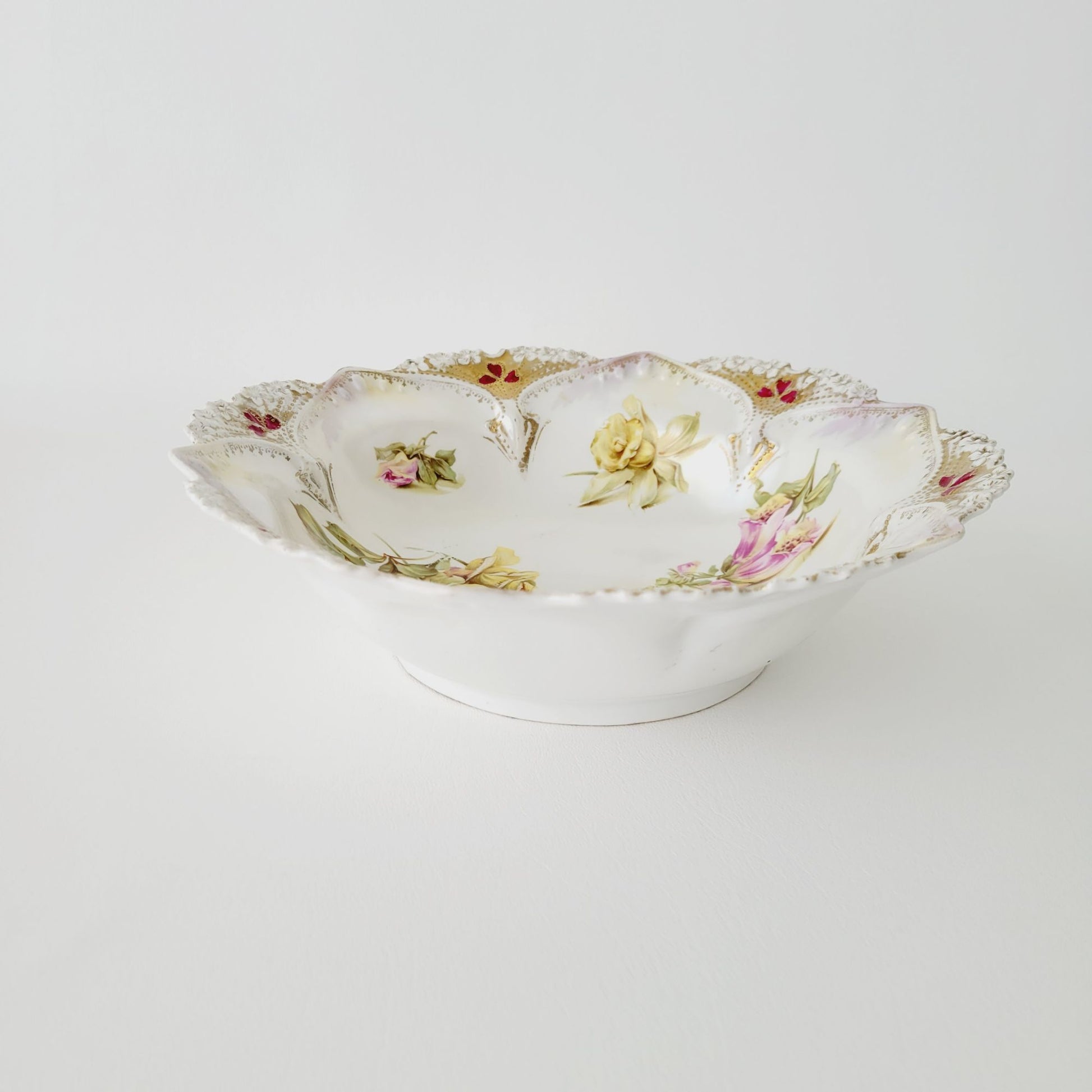 This RS Prussia antique floral porcelain bowl, in white and pink, features a hand painted floral design with gold accents. Its satin finish and Art Nouveau style make it a standout piece for any home décor.
