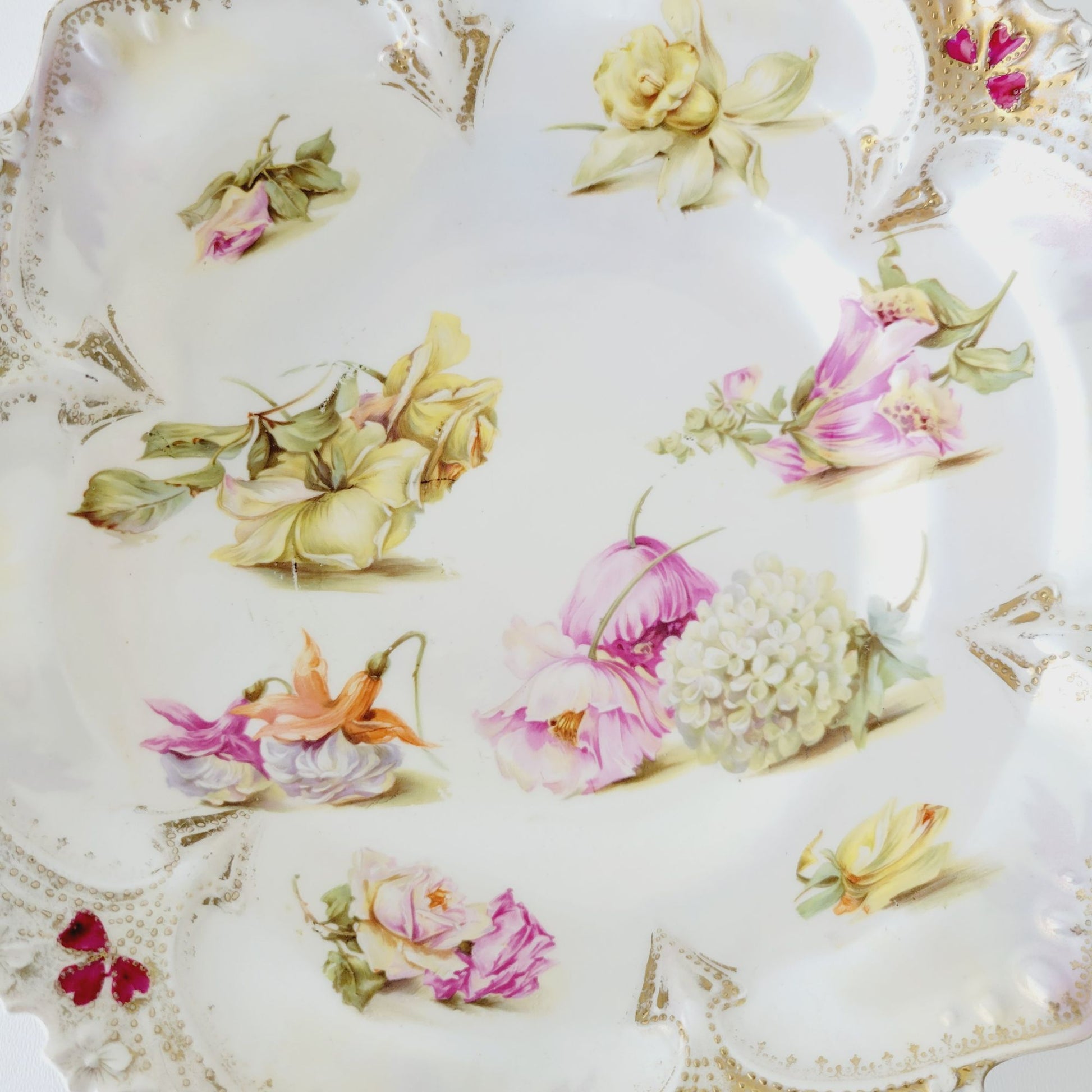 Antique White RS Prussia Floral Bowl with Satin Finish, Yellow Daffodils & Roses, Fuchsia and White Hydrangea