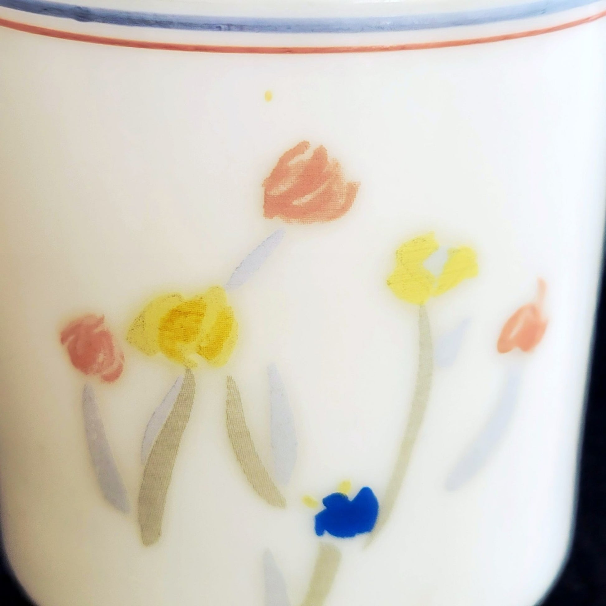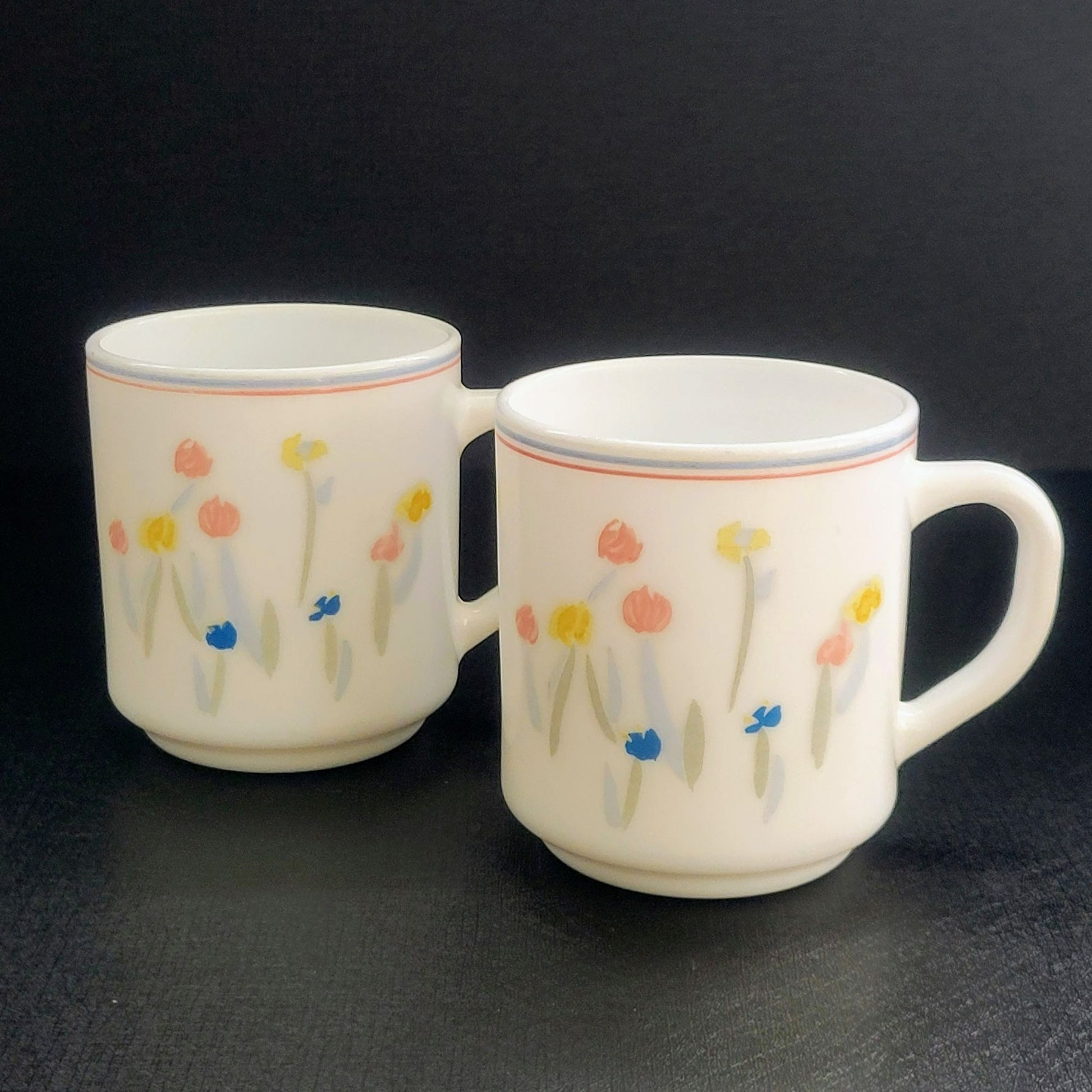 This charming set of two vintage milk glass coffee cups features a pastel floral design in blue, pink, yellow, and green. Perfect for adding a touch of elegance to your morning routine or as a thoughtful home gift.