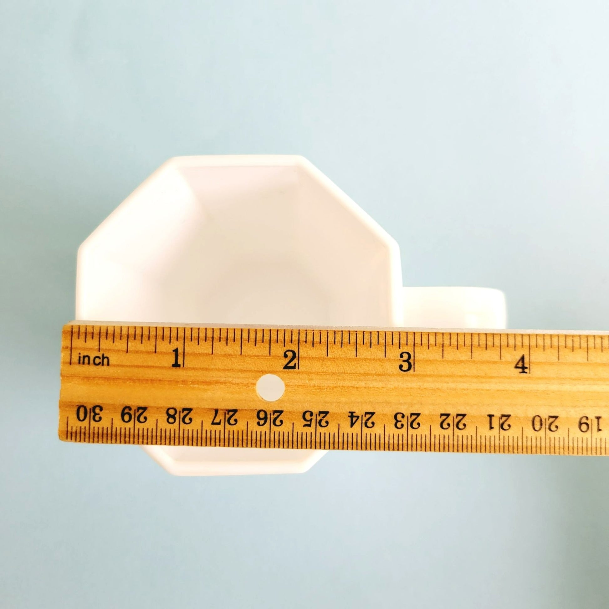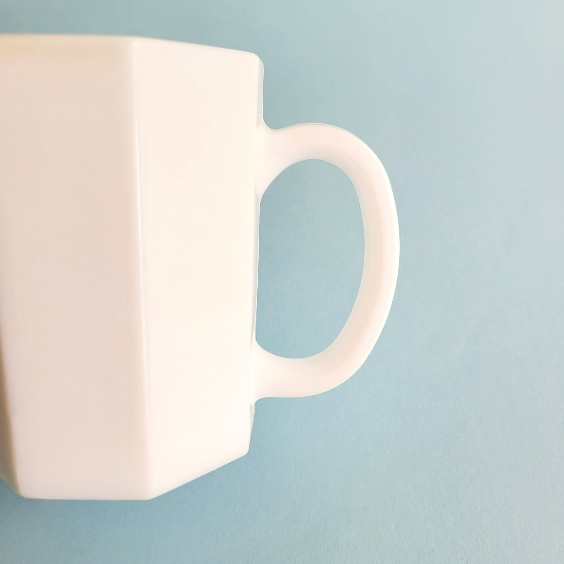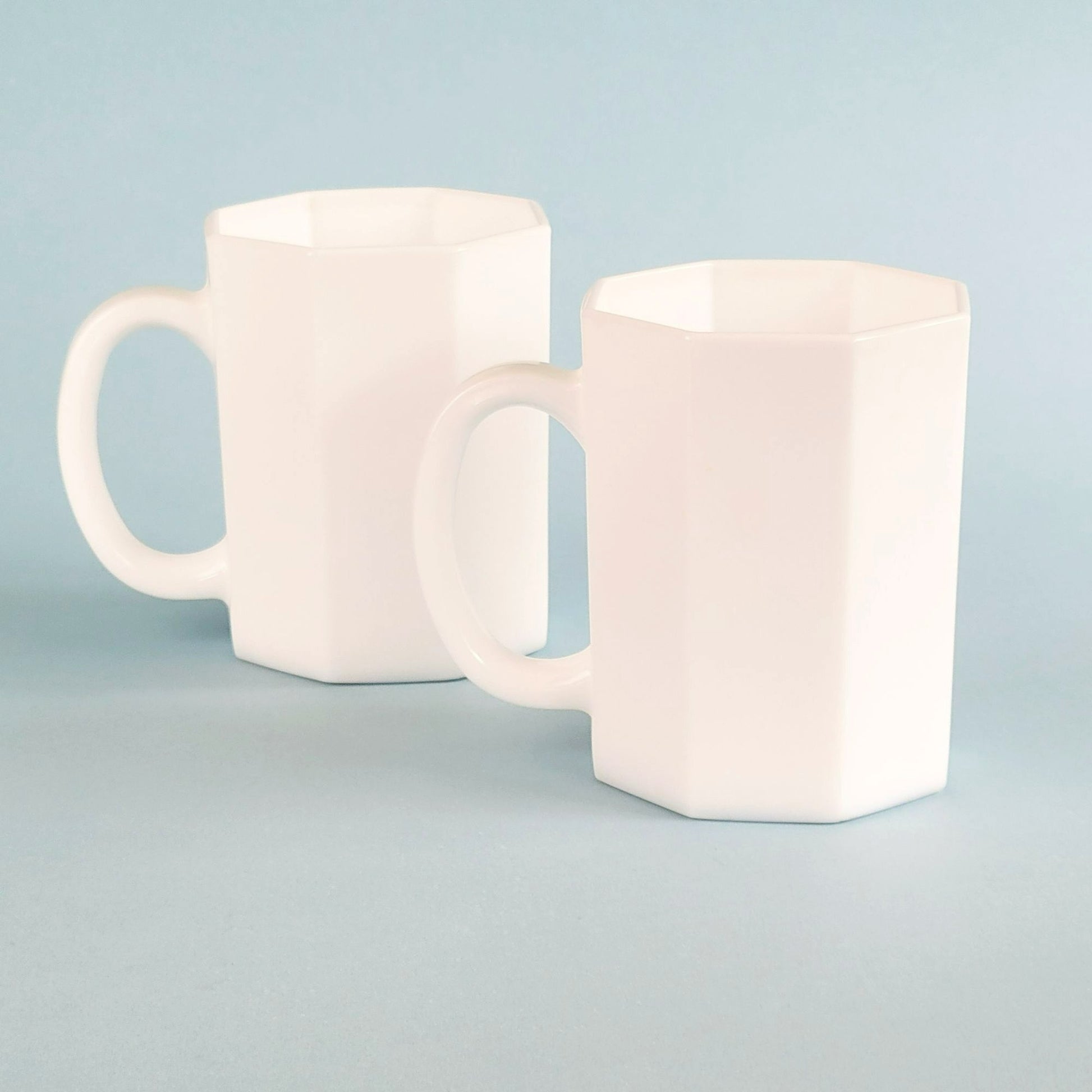 Set of 2 Arcoroc Octime white glass mugs, beautifully designed with eight sides. Made in France, these discontinued, minimalist, eco-friendly replacement coffee cups hold 8fl. oz. each.