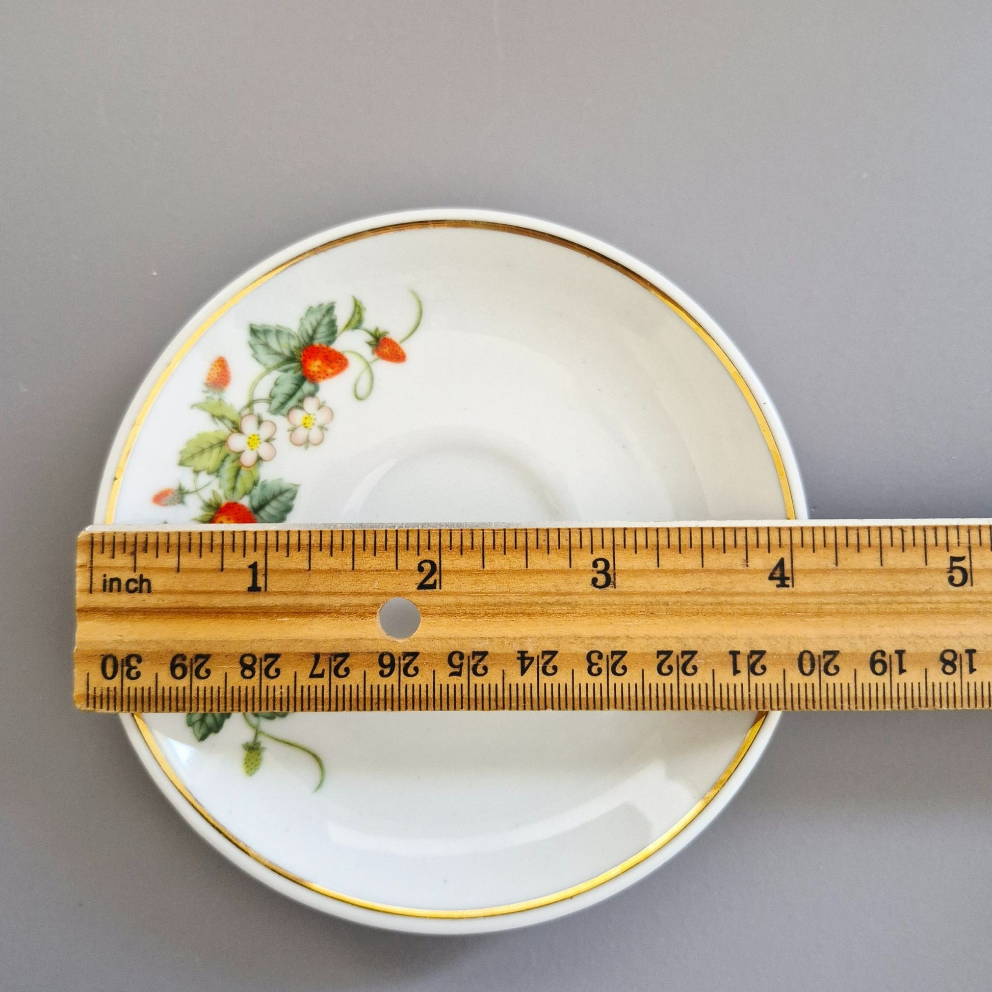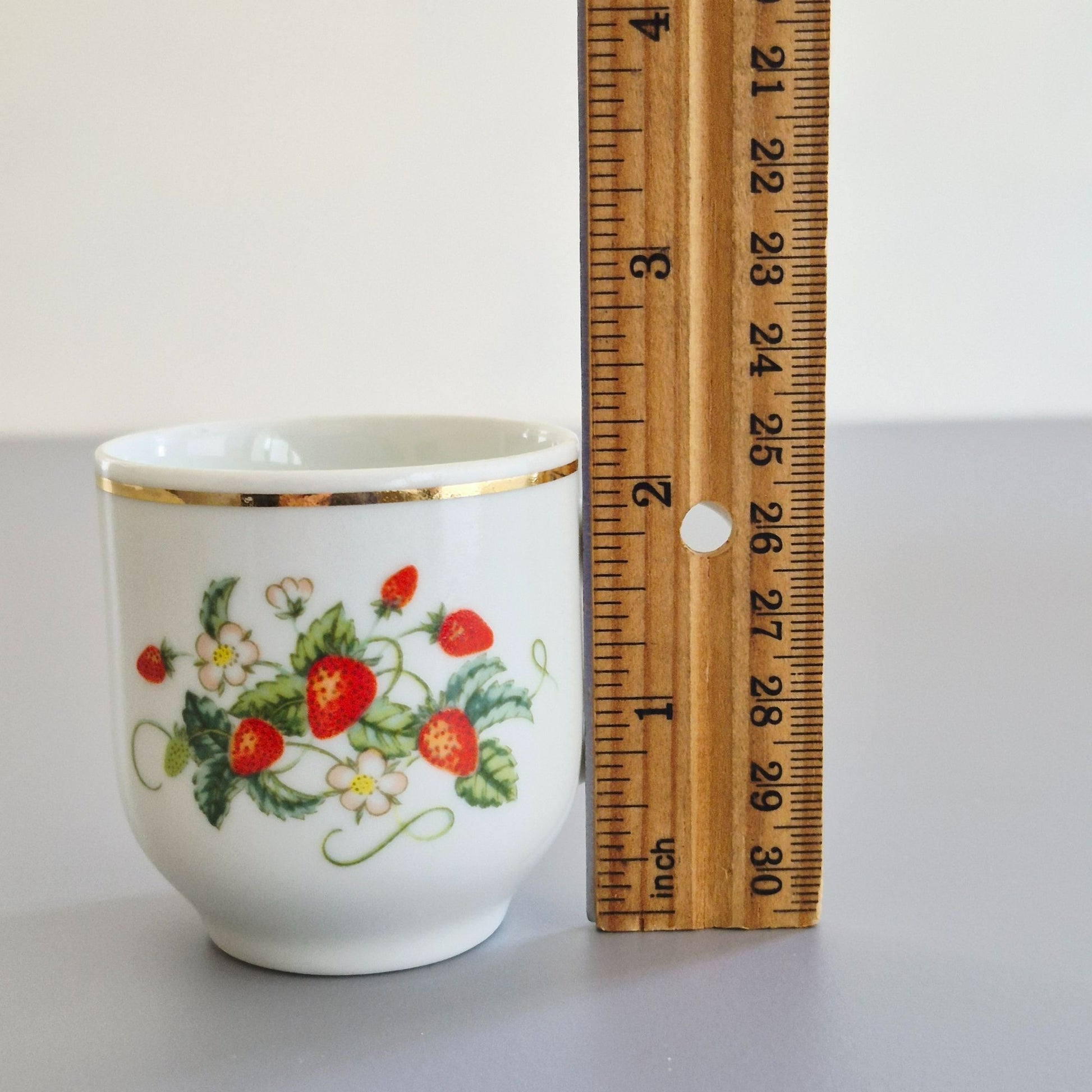 This charming vintage demitasse set features a delightful strawberry design with gold trim. Perfect for collectors or espresso lovers, this Avon set from the late 1970s to 1980s adds a touch of elegance to any occasion.