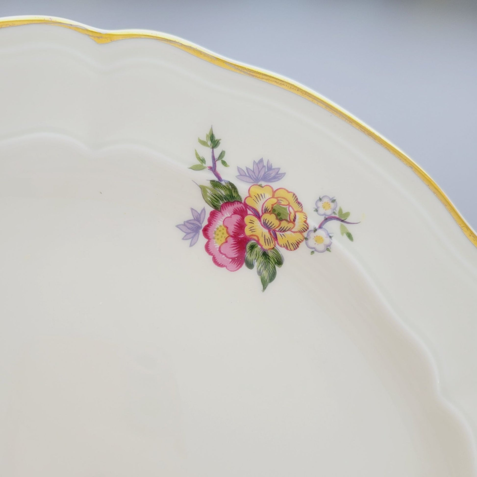 This elegant, vintage cake plate from Bernardaud features an elegant pink floral and bird design with gold embossed trim. Perfect for collectors or as a statement piece in your dinnerware collection. Discontinued and rare, made in Limoges, France.