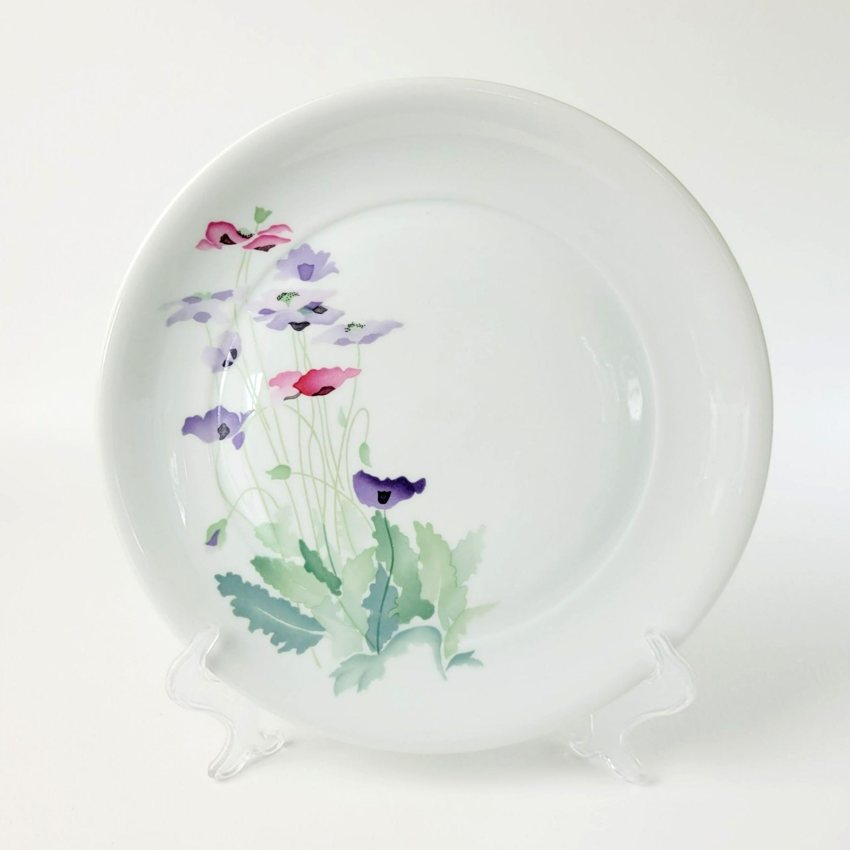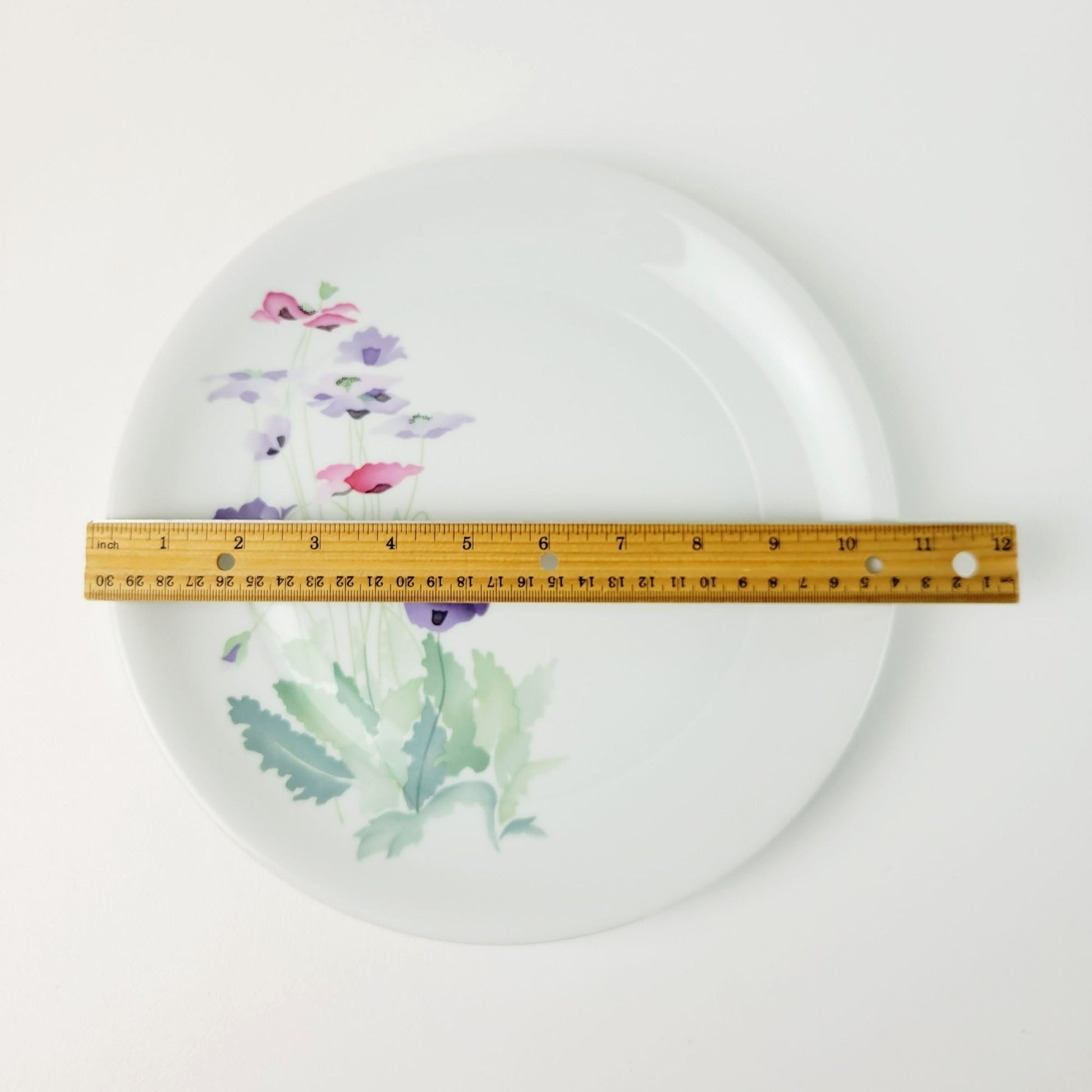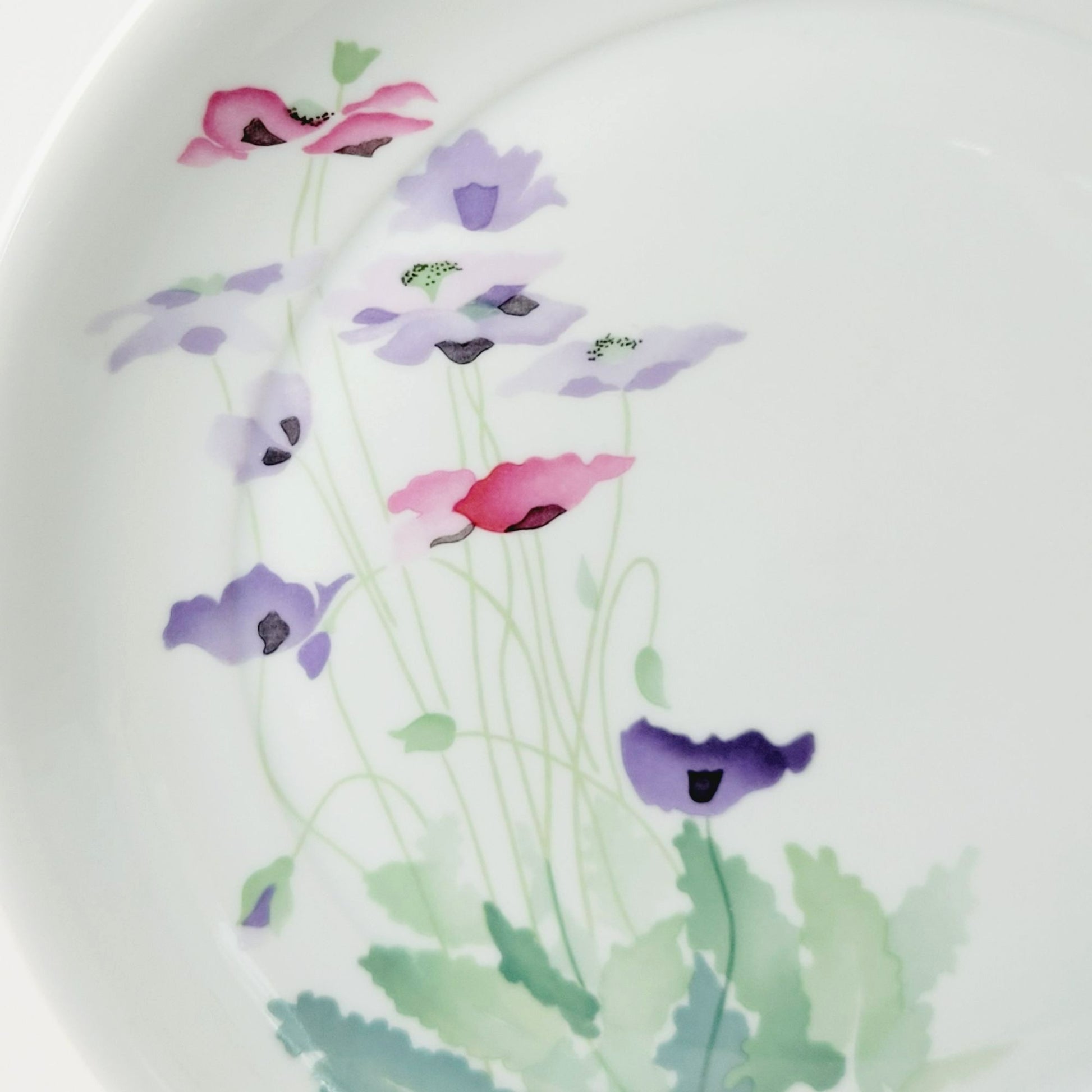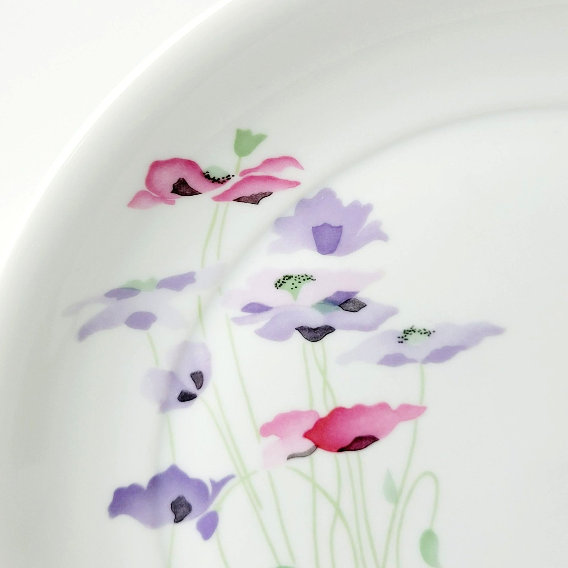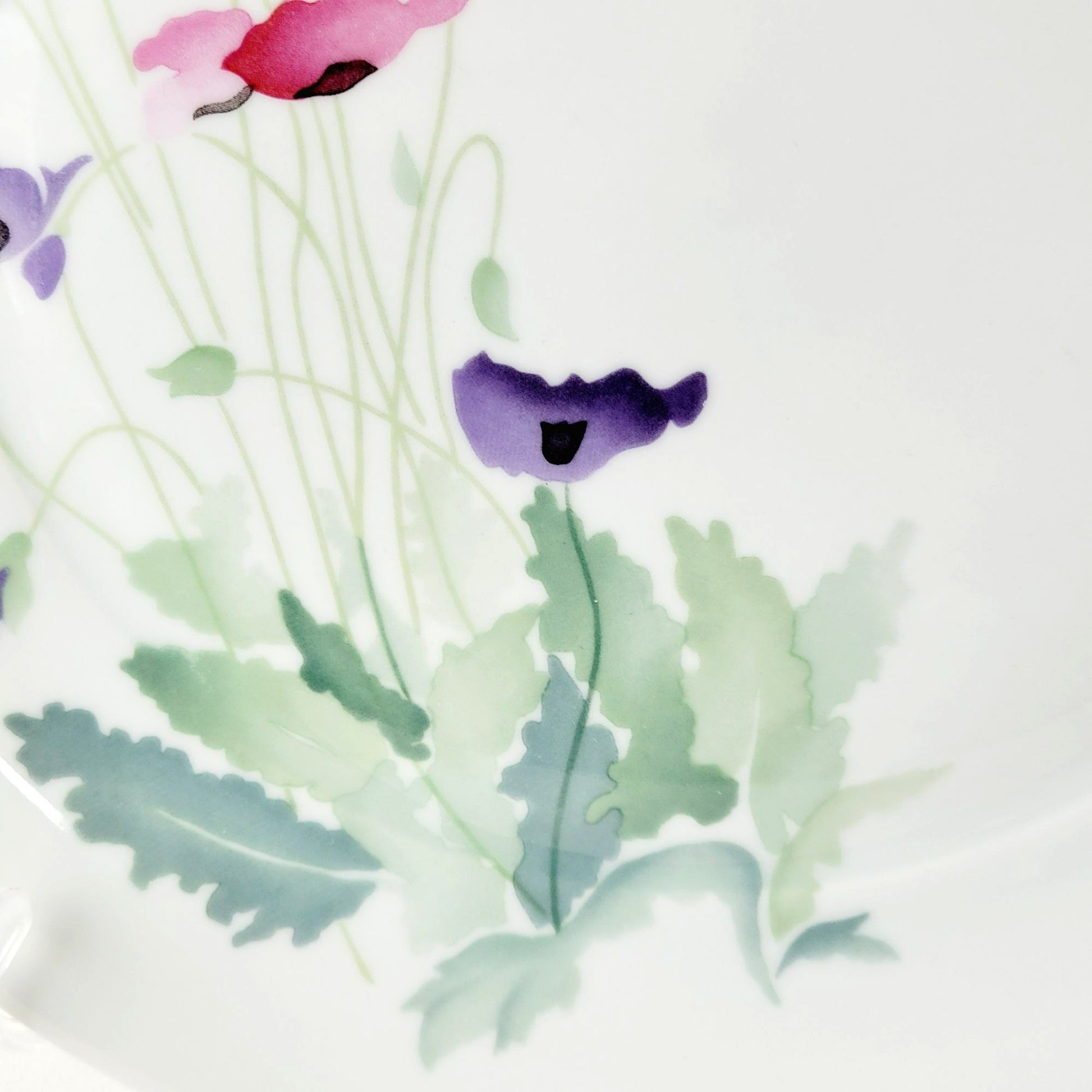 This Block Spal plate features a vibrant wildflower design in pink, purple, and green. It is from The Artist Garden line in the Midsummer Watercolor pattern. Made in Portugal, it is perfect for summer meals.