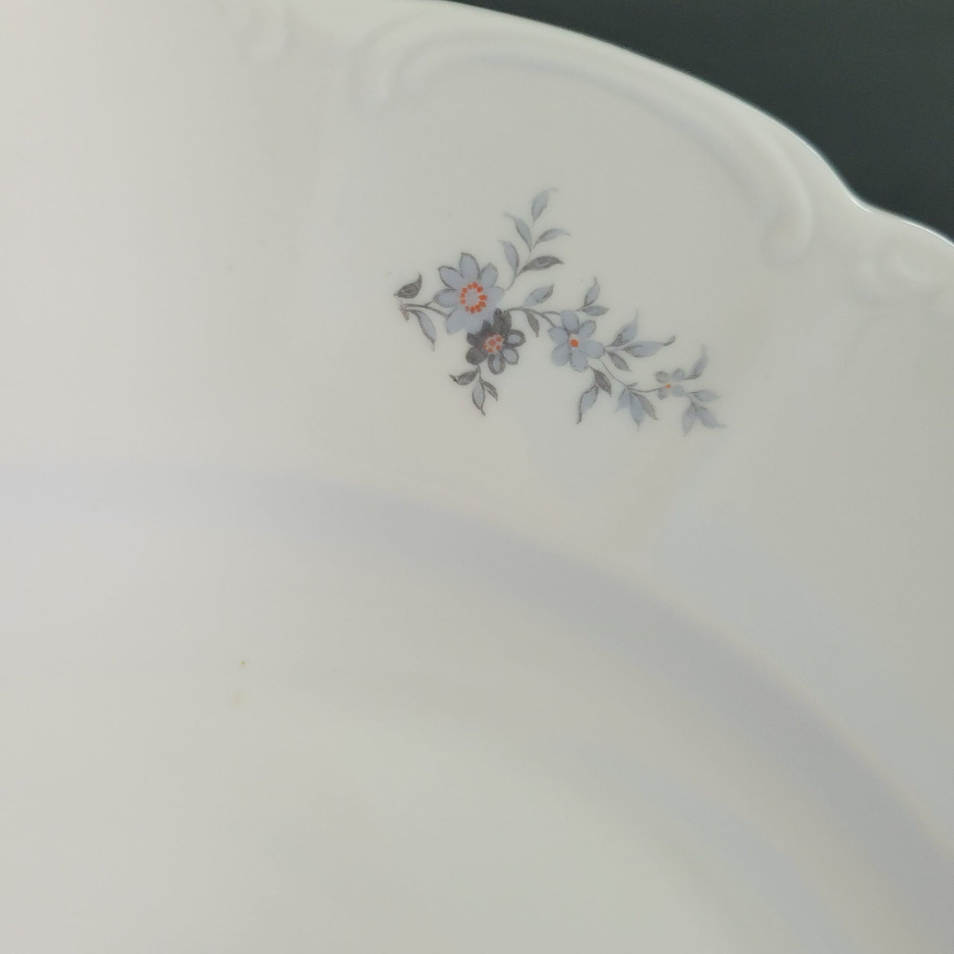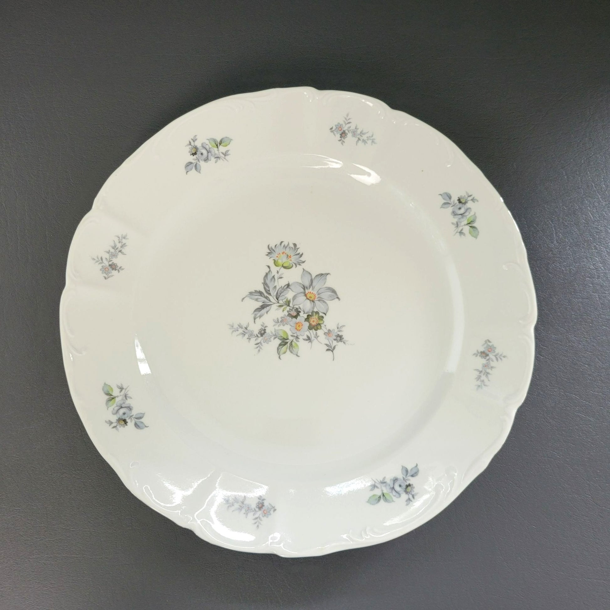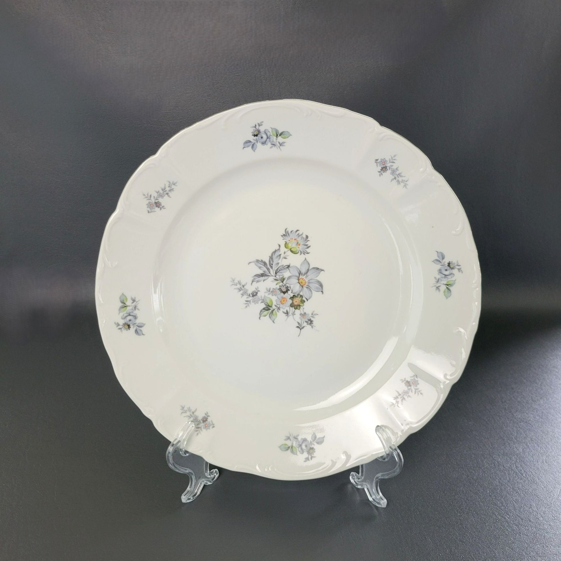 This Europa Bohemian China "Wild Flower" 13" round platter showcases a stunning blue and gray floral pattern with a silver embossed edge. Made in Czechoslovakia, this discontinued piece is perfect for replacing missing items in your existing collection.