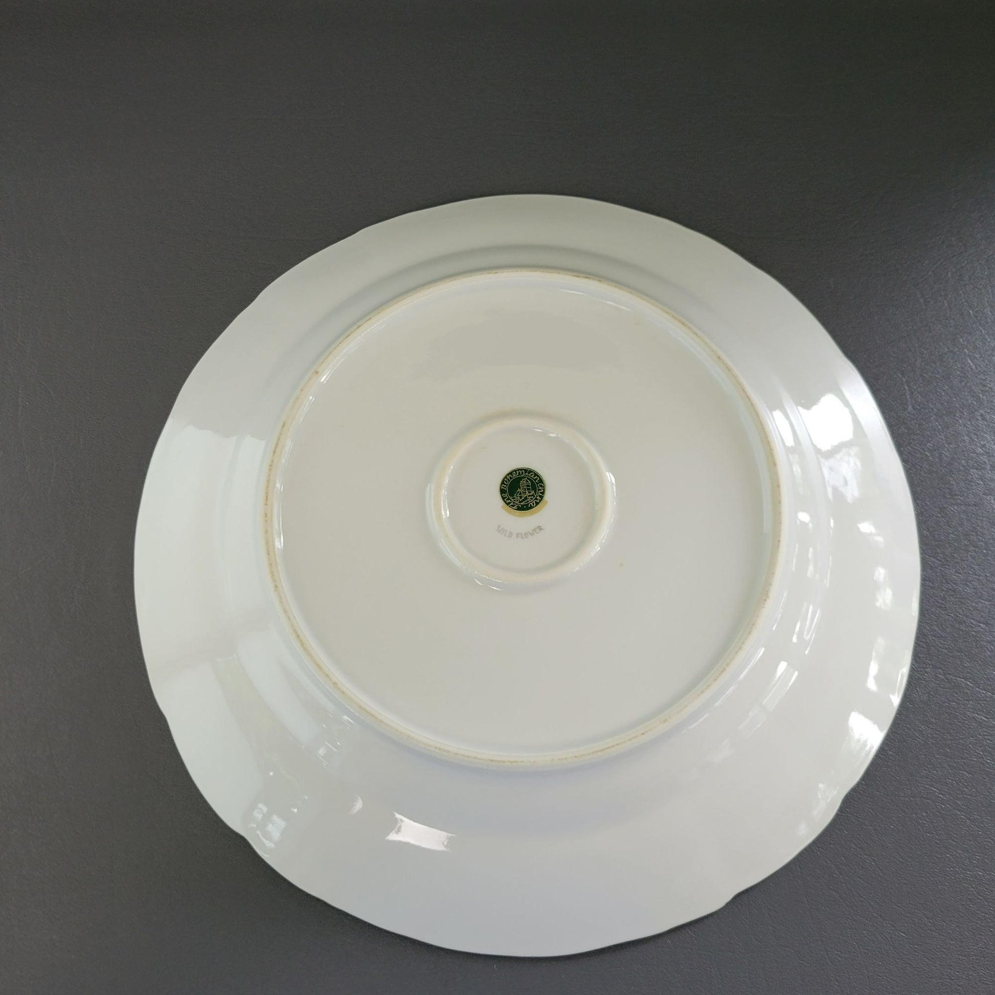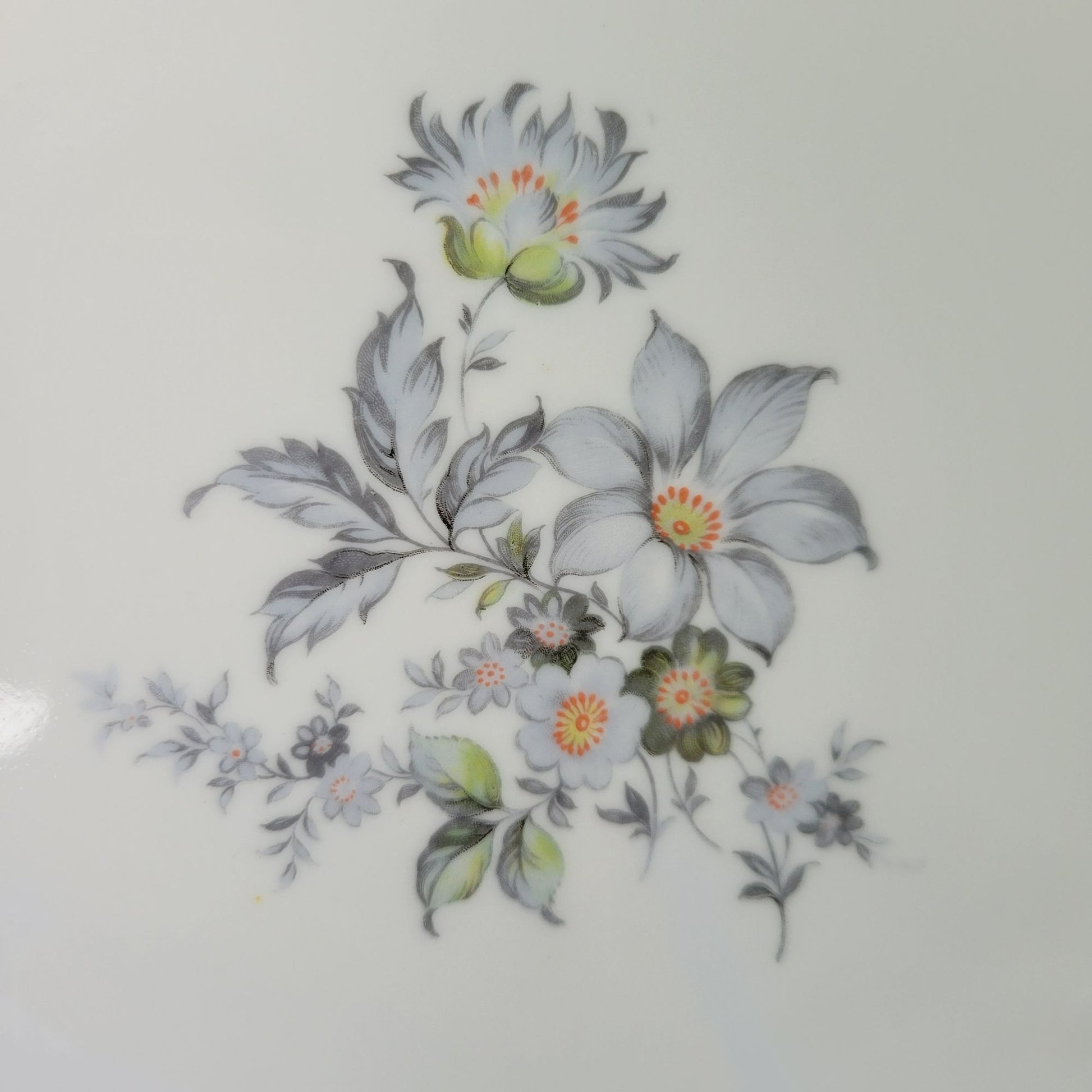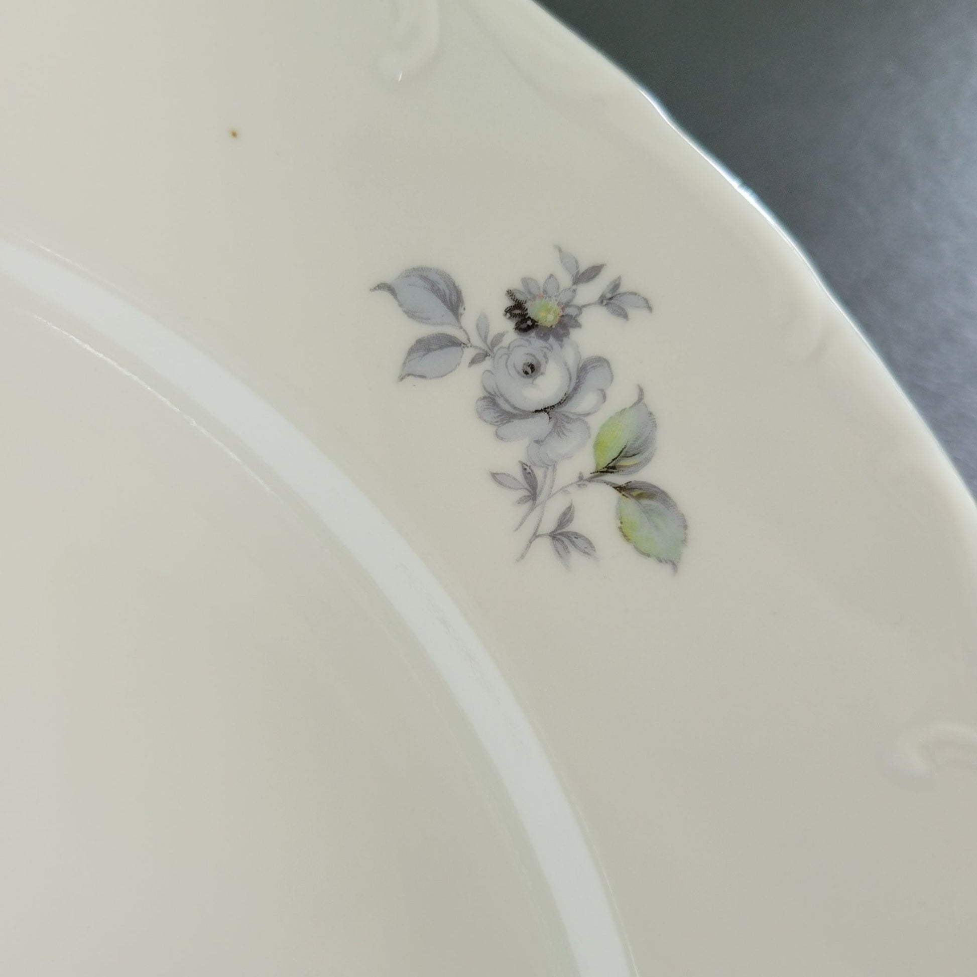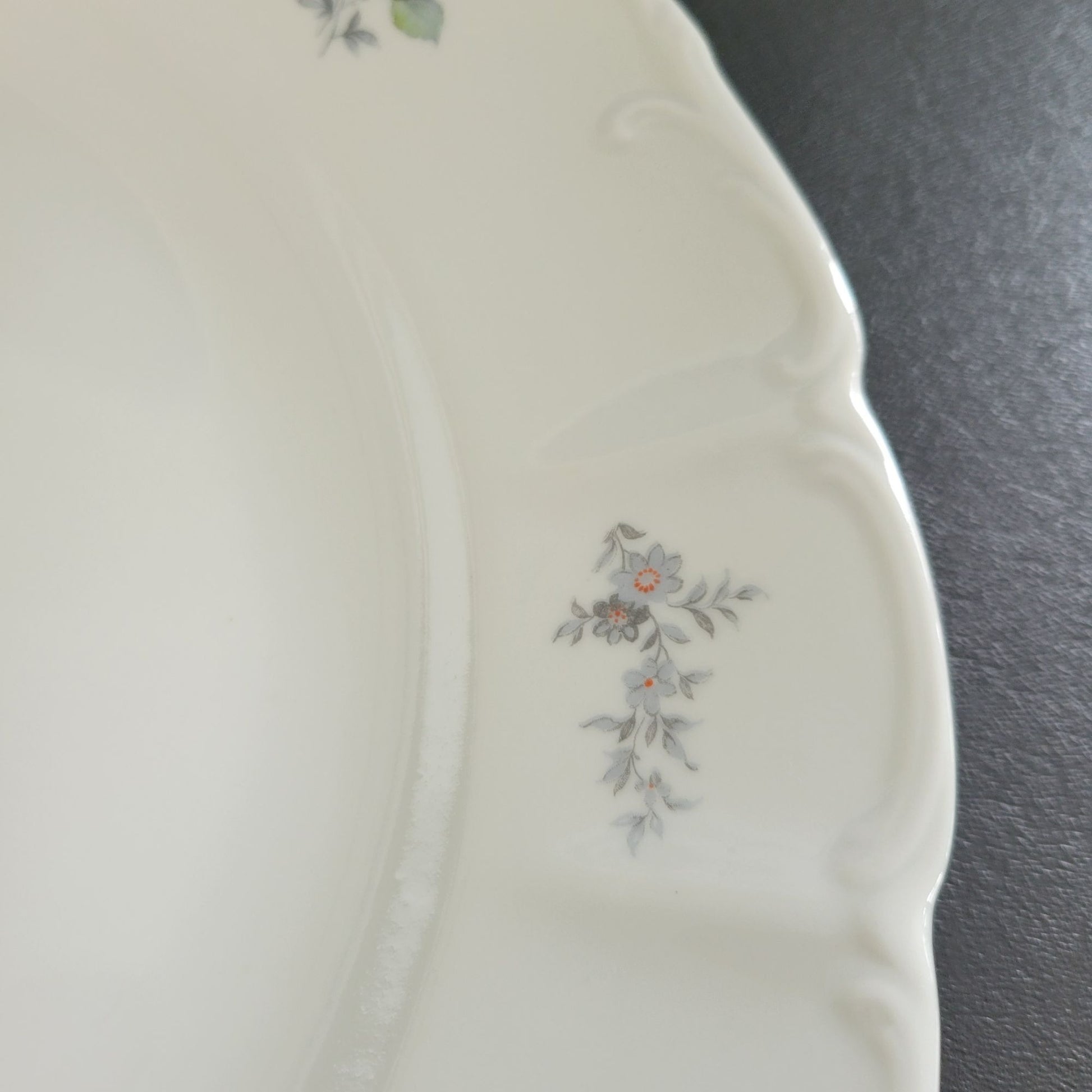 This Europa Bohemian China "Wild Flower" 13" round platter showcases a stunning blue and gray floral pattern with a silver embossed edge. Made in Czechoslovakia, this discontinued piece is perfect for replacing missing items in your existing collection.