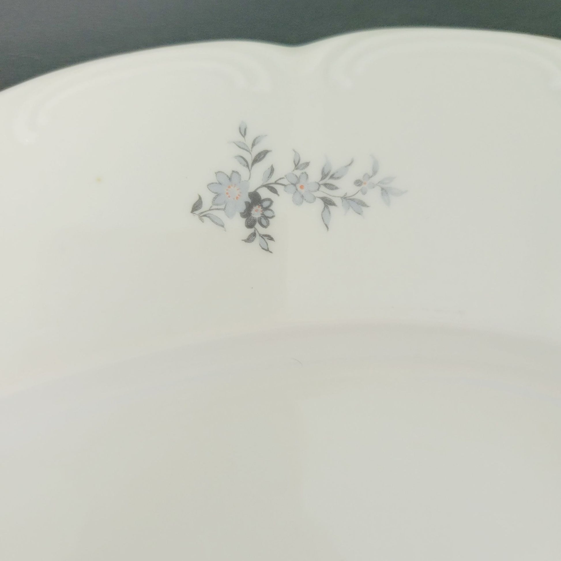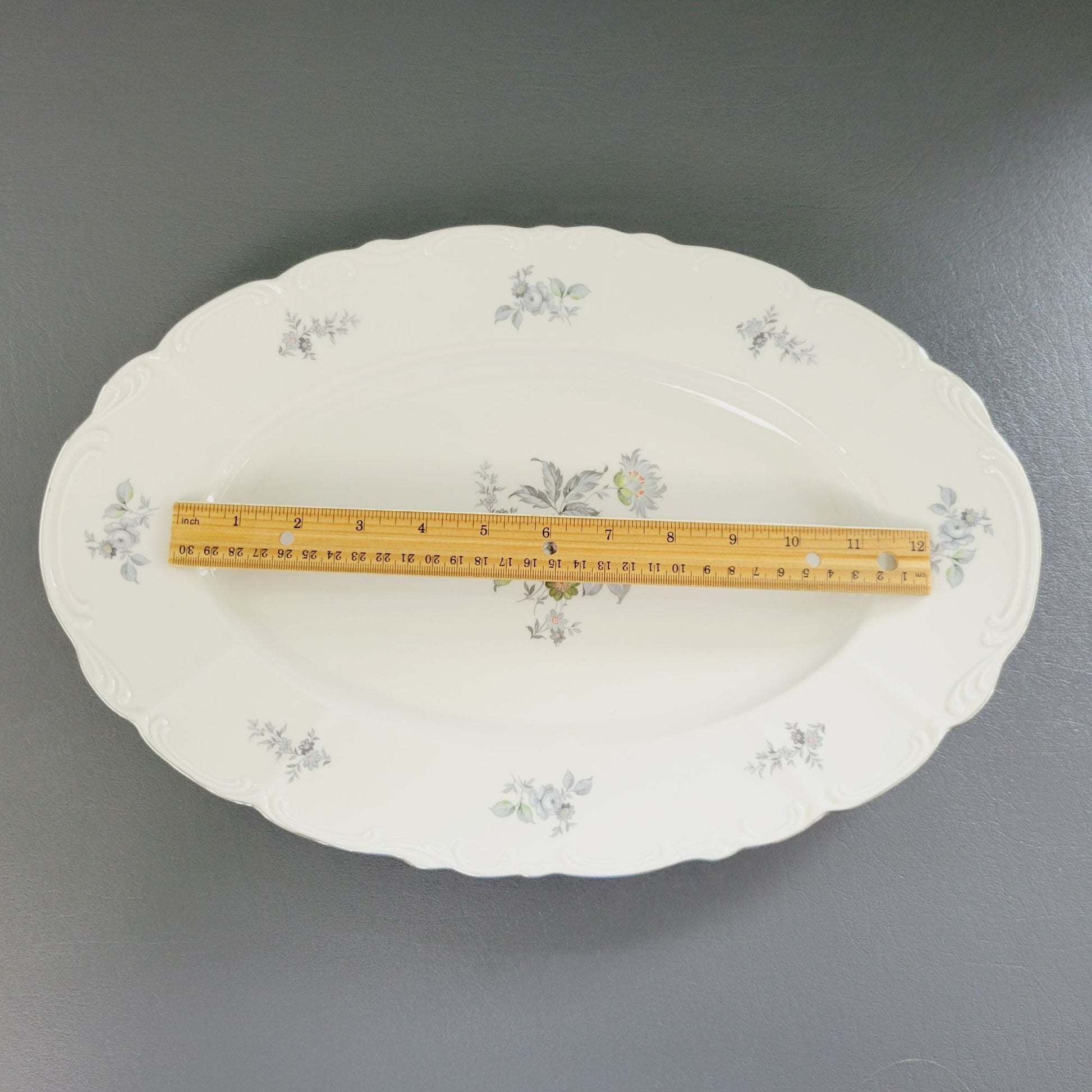 This Bohemian China Wild Flower Oval Platter showcases a beautiful blue and gray wildflower design, silver trim, and embossed edges. Made in Czechoslovakia, it's a perfect piece for those seeking discontinued replacement china.