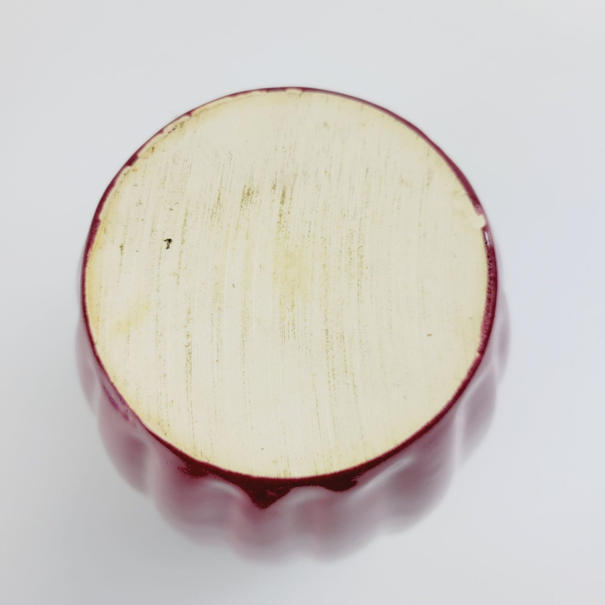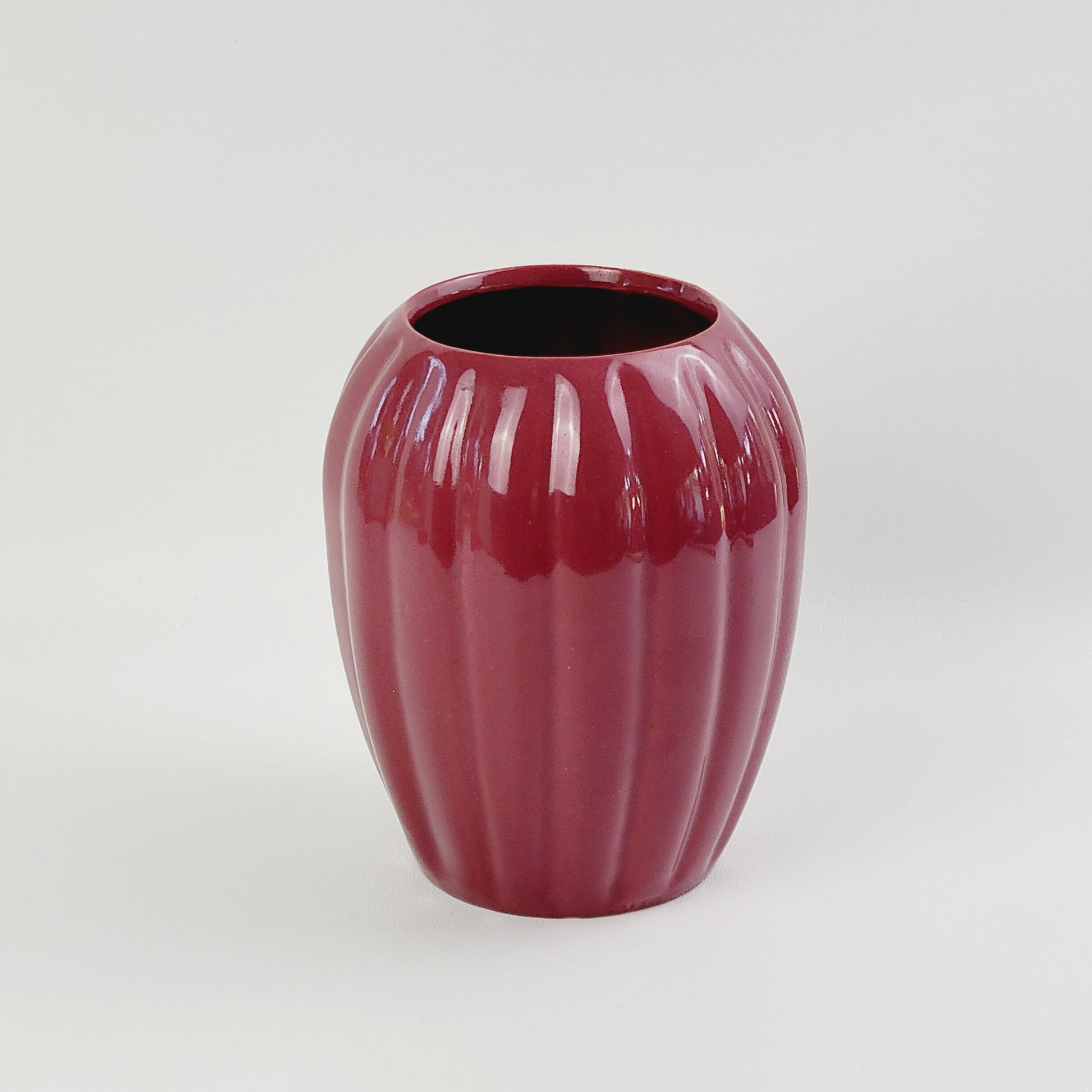 A splendid example of vintage ceramic artistry, this burgundy vase exudes a timeless charm with its glossy finish and elegant vertical grooves. The rich, deep hue captures the light beautifully, making it a distinctive decorative piece. Its classic shape and fine craftsmanship evoke an era of meticulous design.