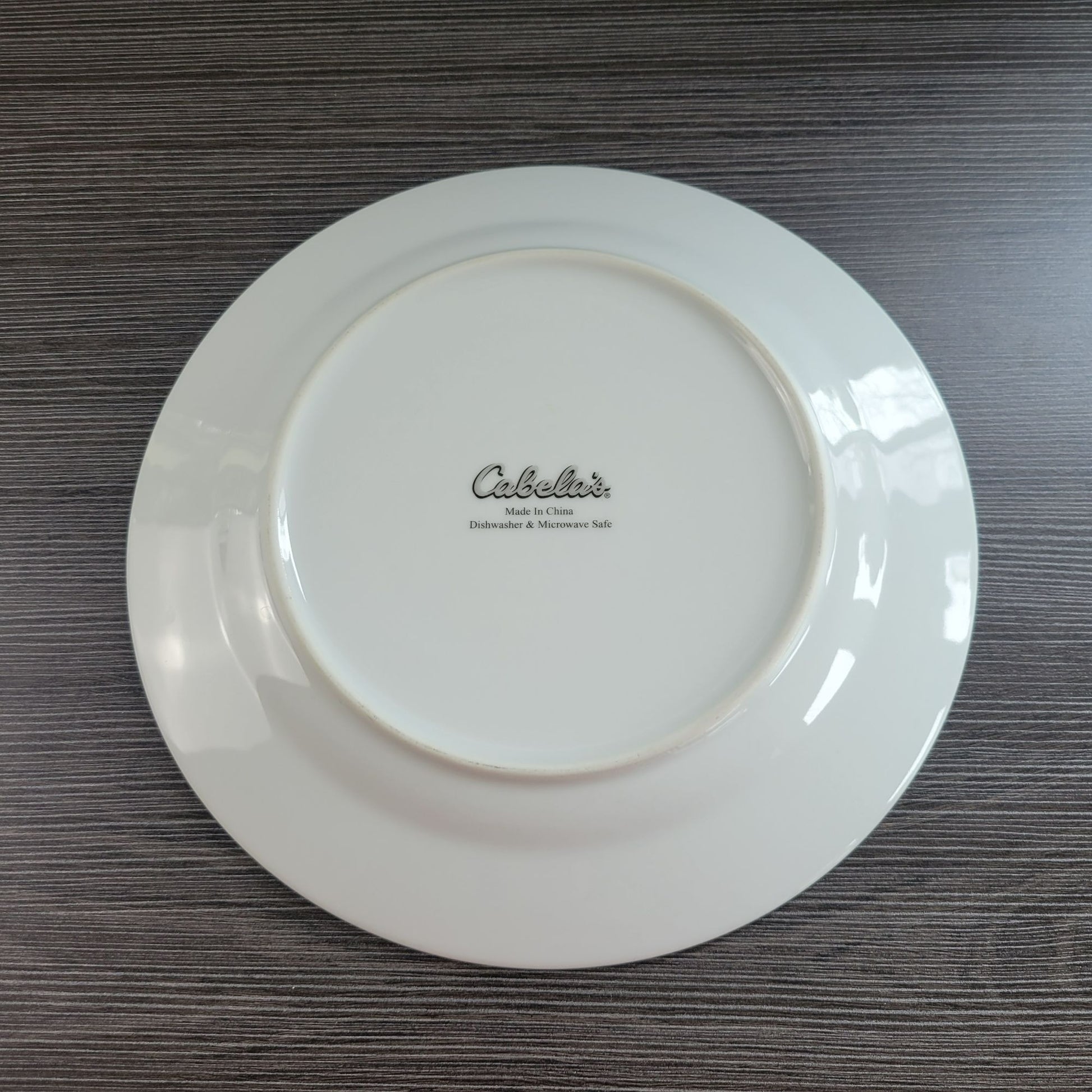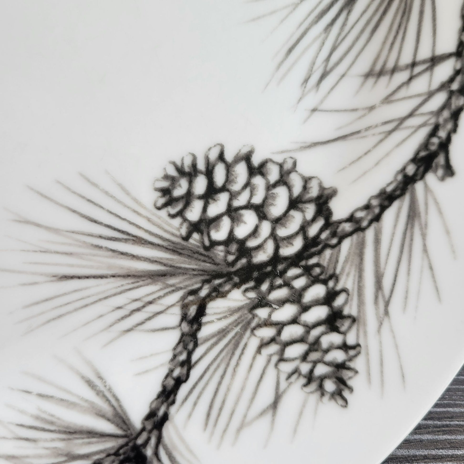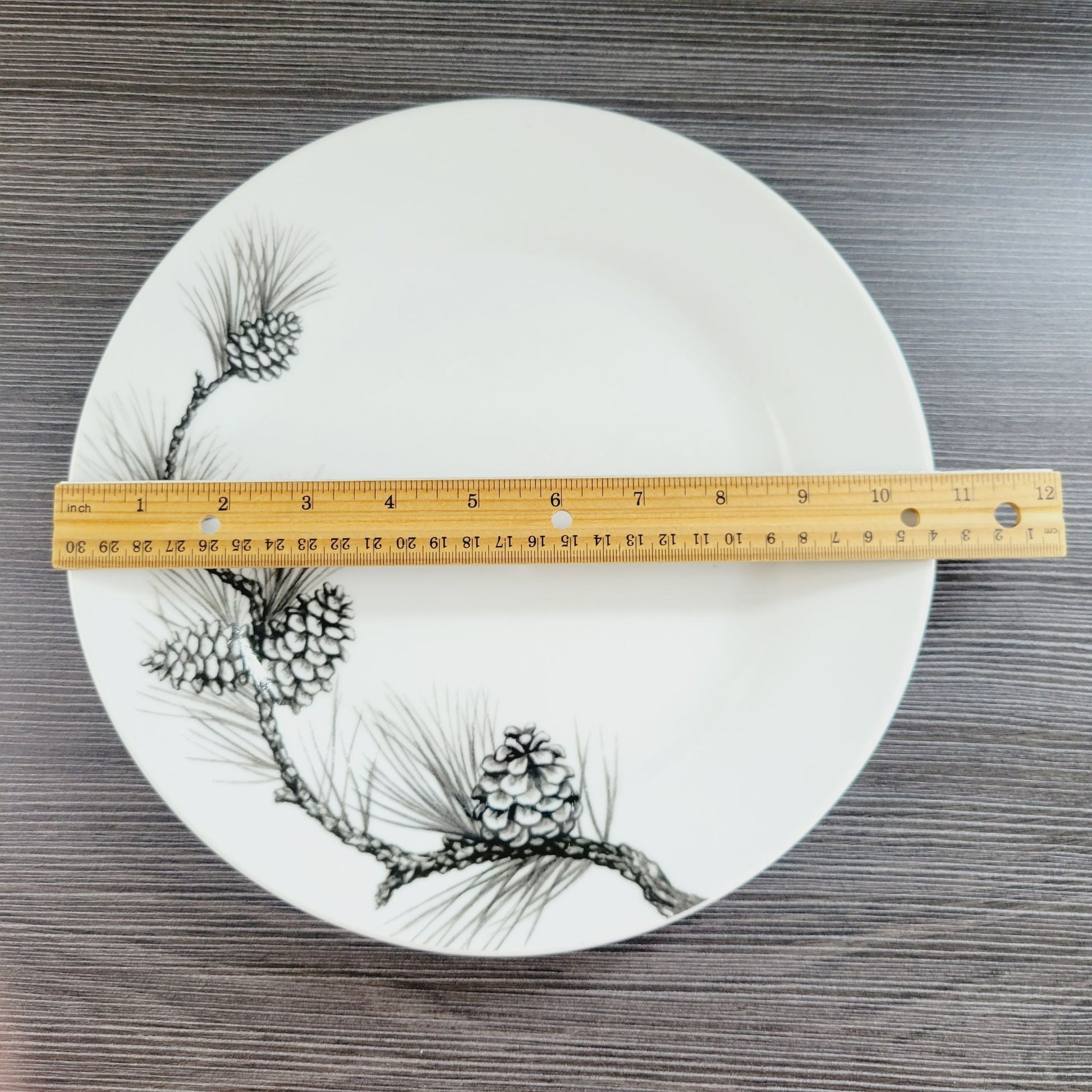 Cabela's Pinecone Dinner Plate is white with a black brown evergreen pattern. Crafted from ceramic, this discontinued piece adds a rustic touch to your tableware.