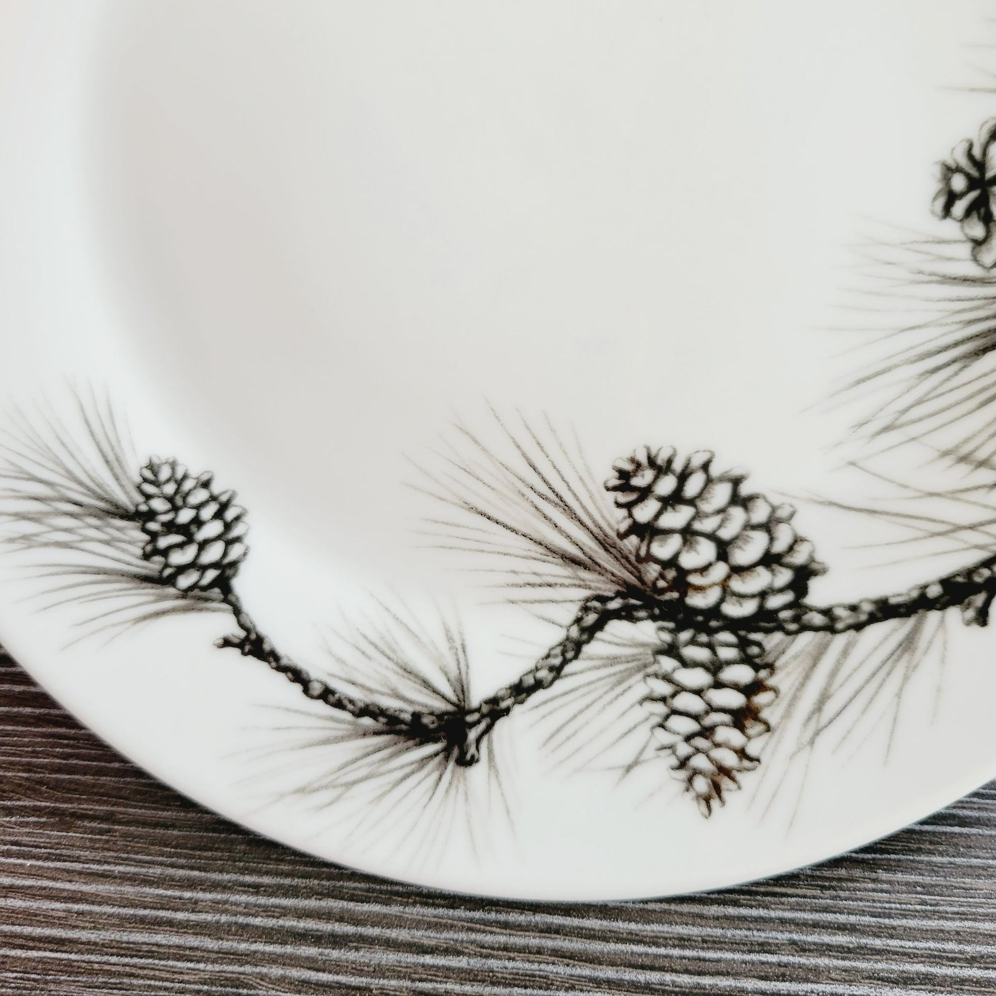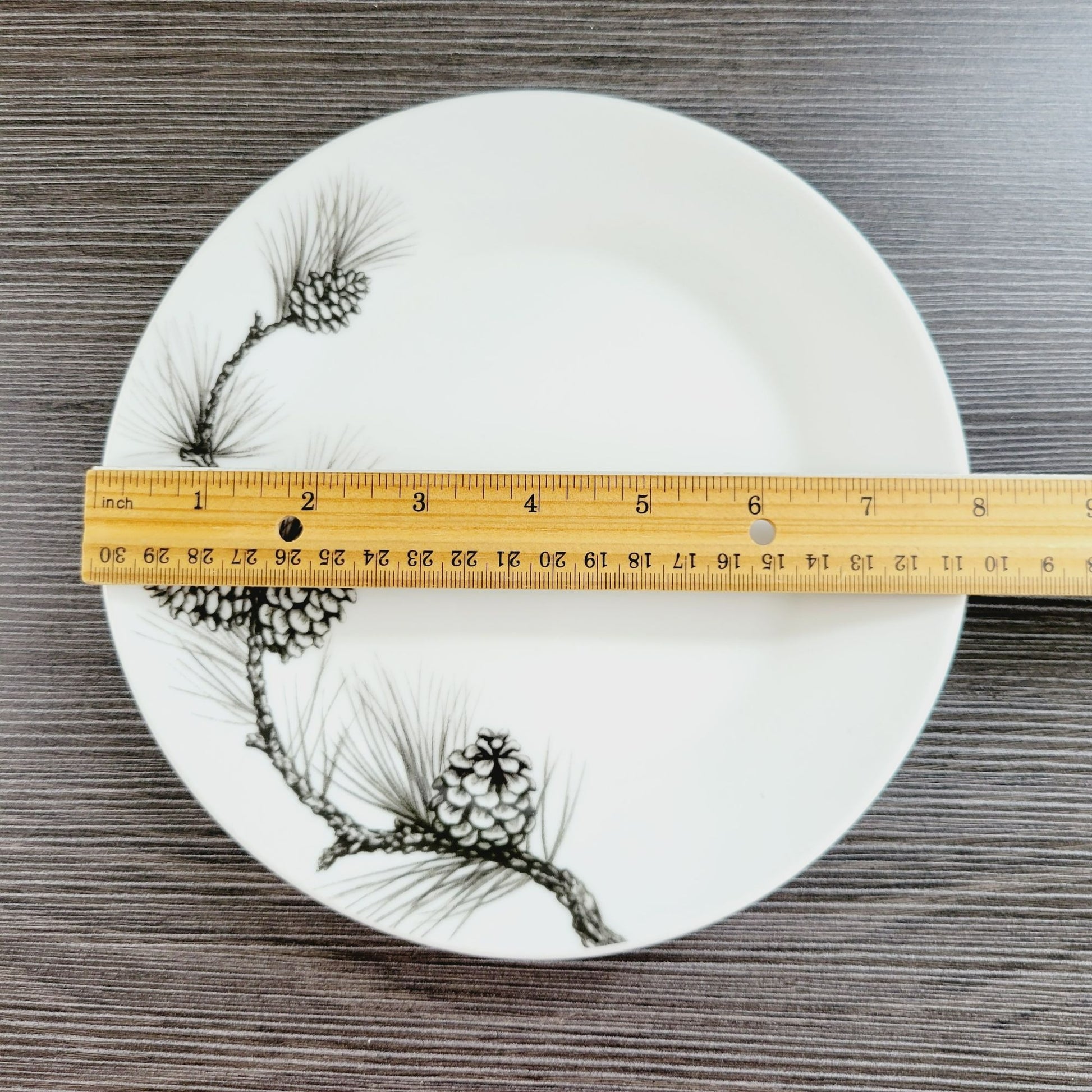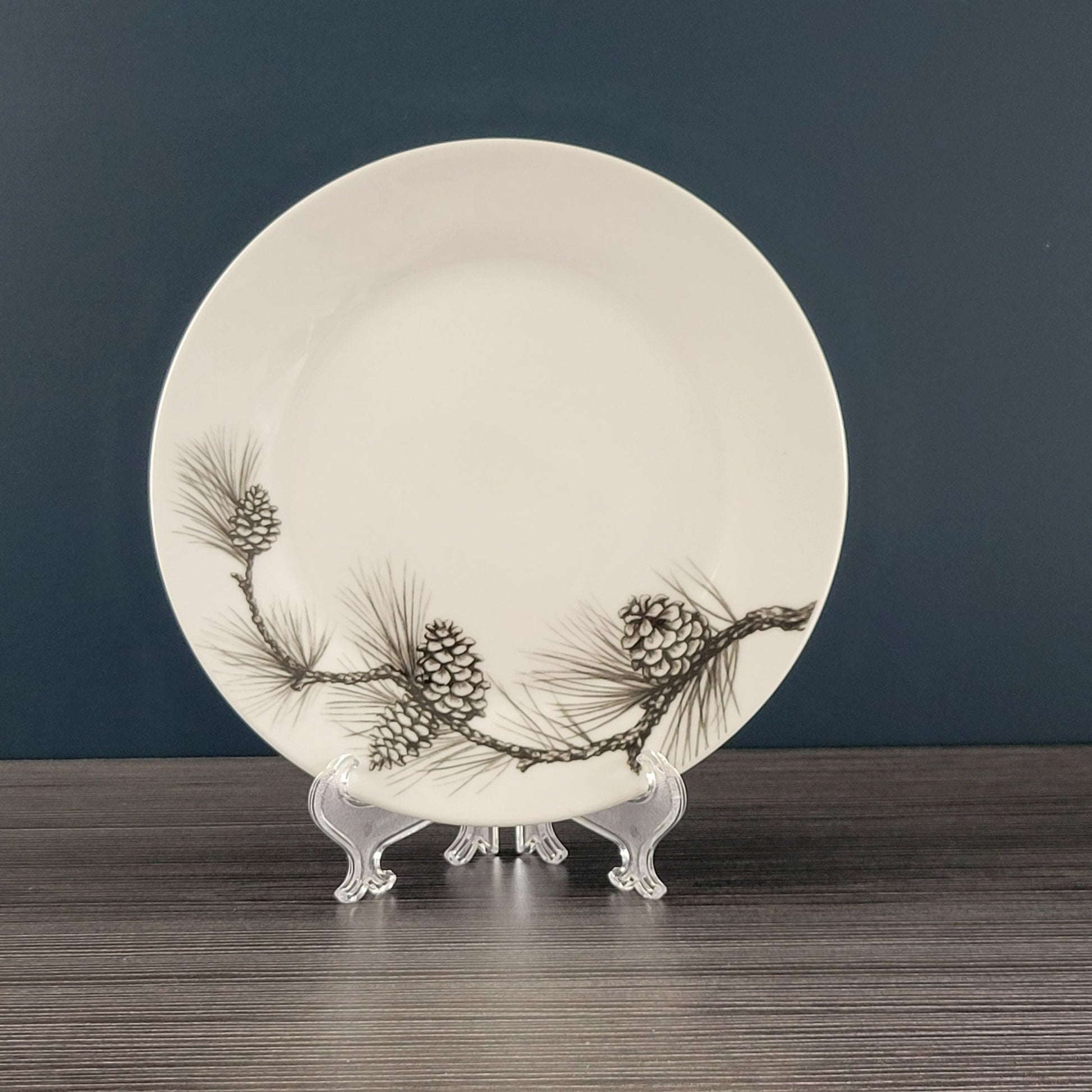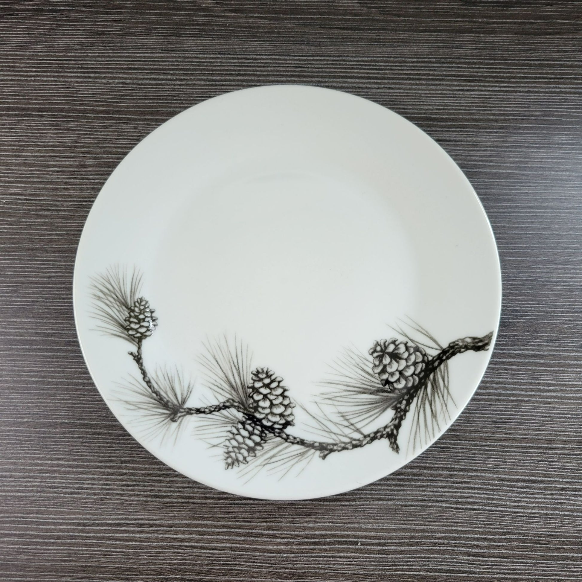 Cabela's Pinecone Salad Plate is white with a black brown evergreen pattern. Crafted from ceramic, this discontinued piece adds a rustic touch to your tableware.