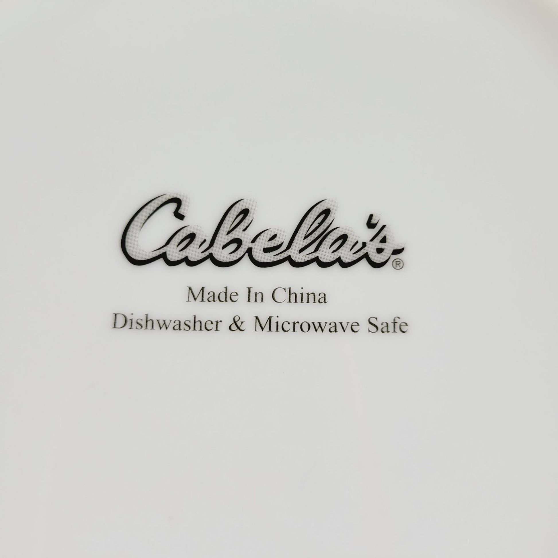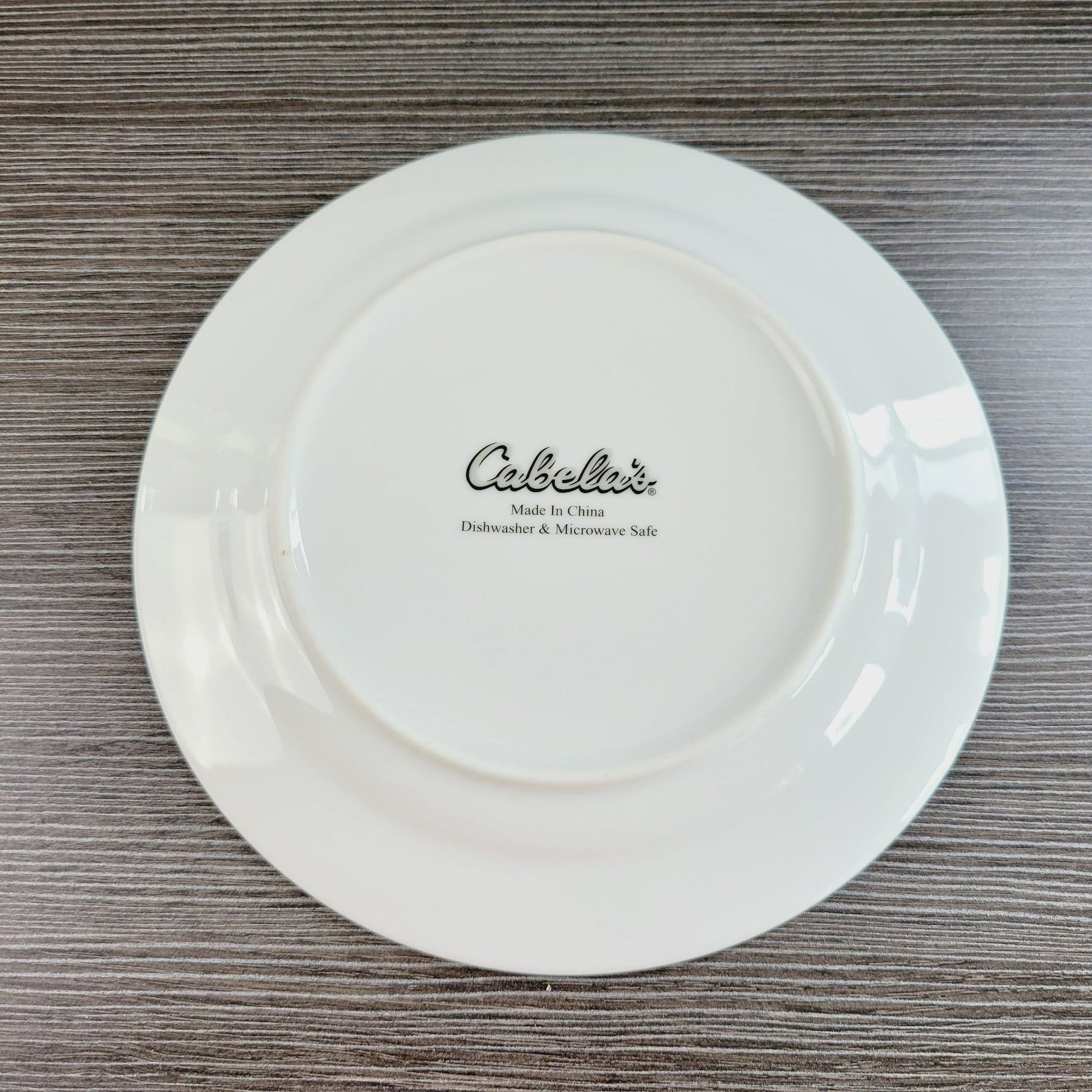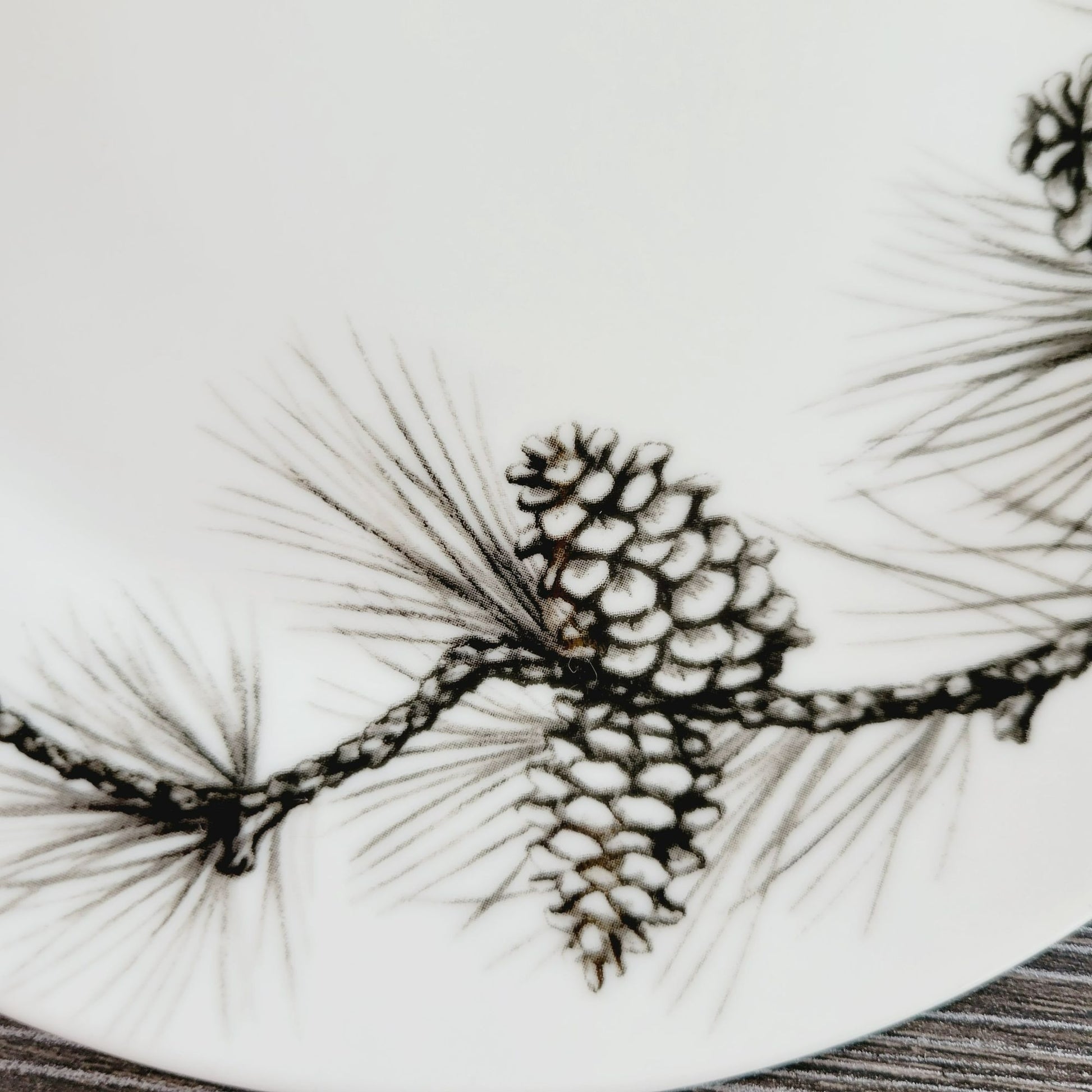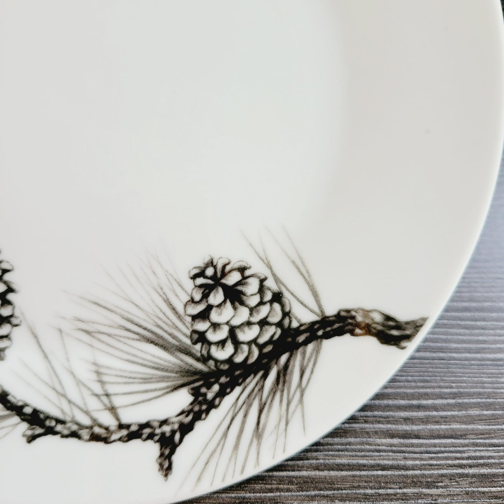 Cabela's Pinecone Salad Plate is white with a black brown evergreen pattern. Crafted from ceramic, this discontinued piece adds a rustic touch to your tableware.