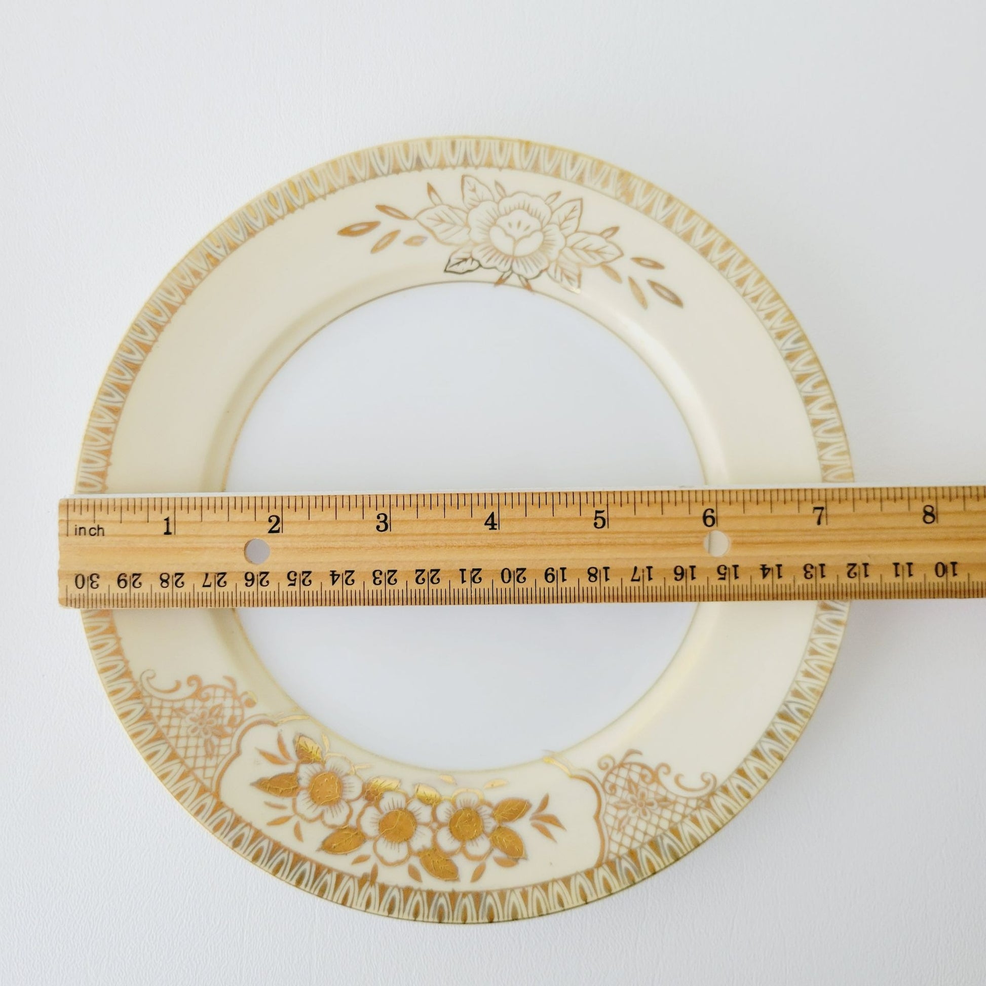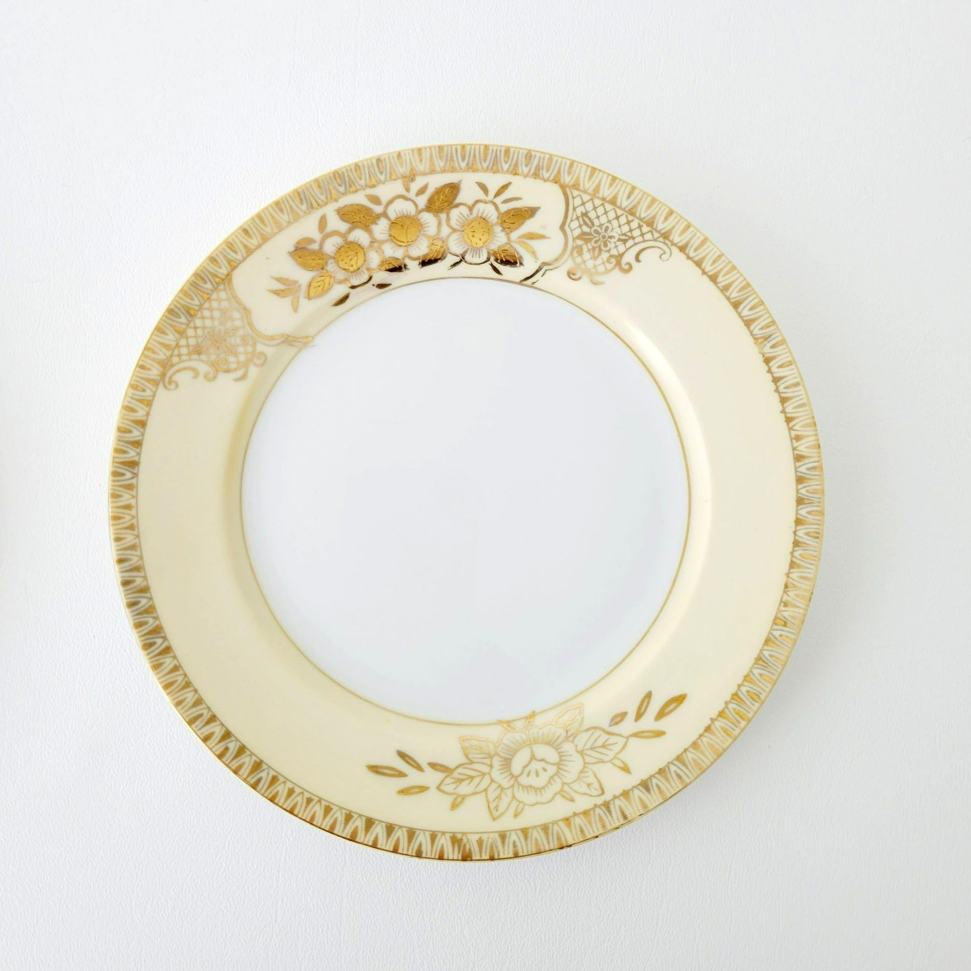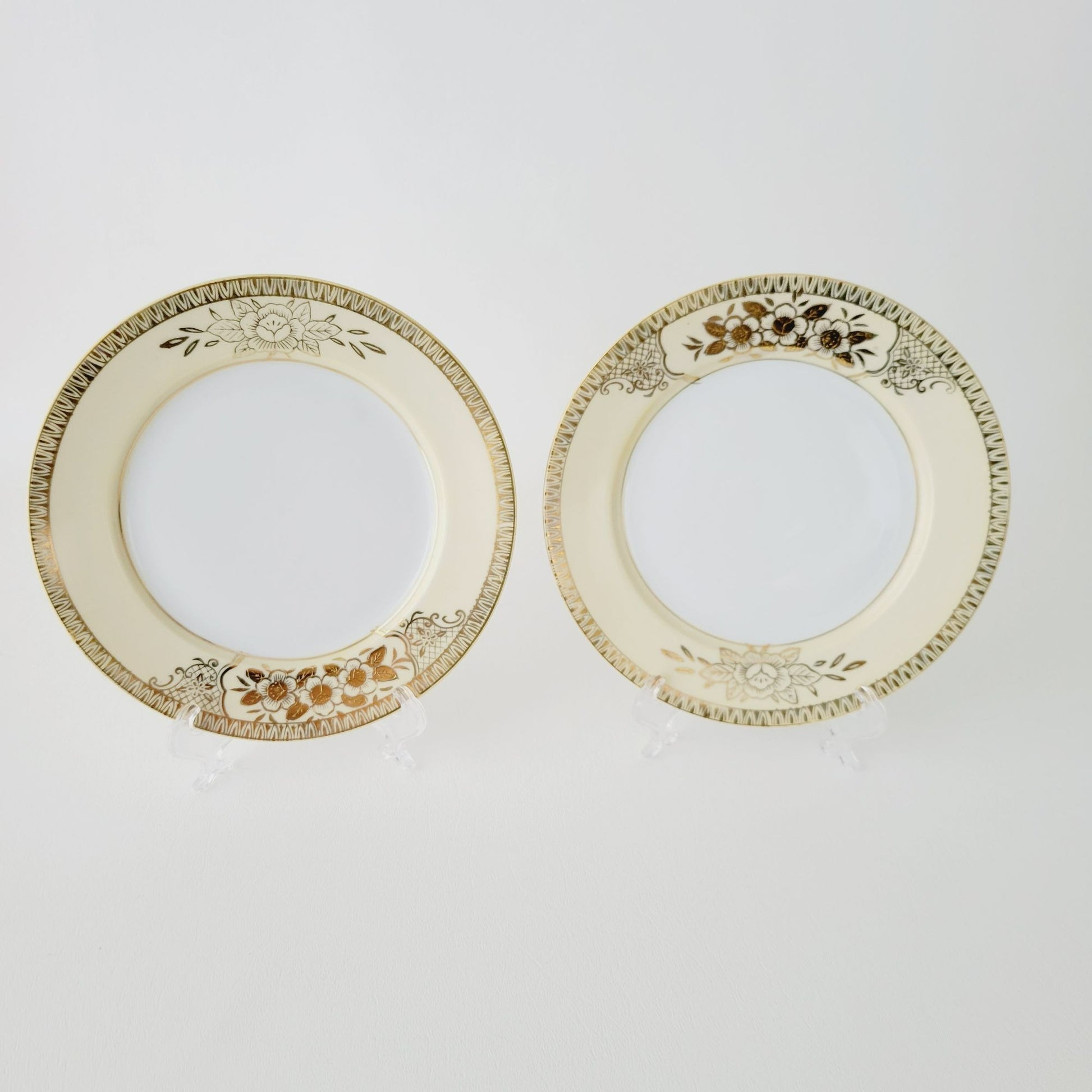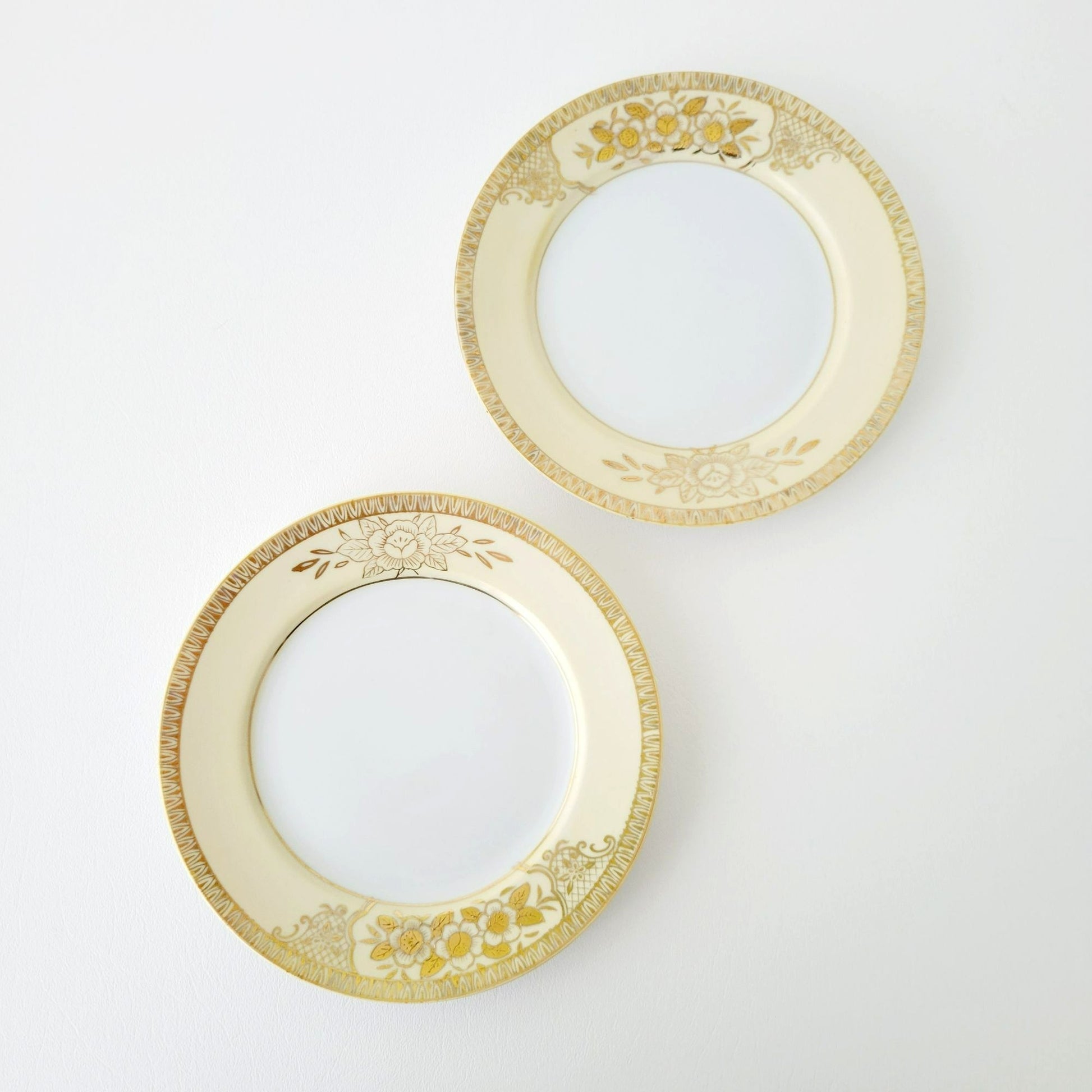Pair of vintage Chikaramachi embossed hand-painted salad plates from the 1920s-30s, featuring a gold and cream floral design. Part of the Noritake plate collection, made in Japan.