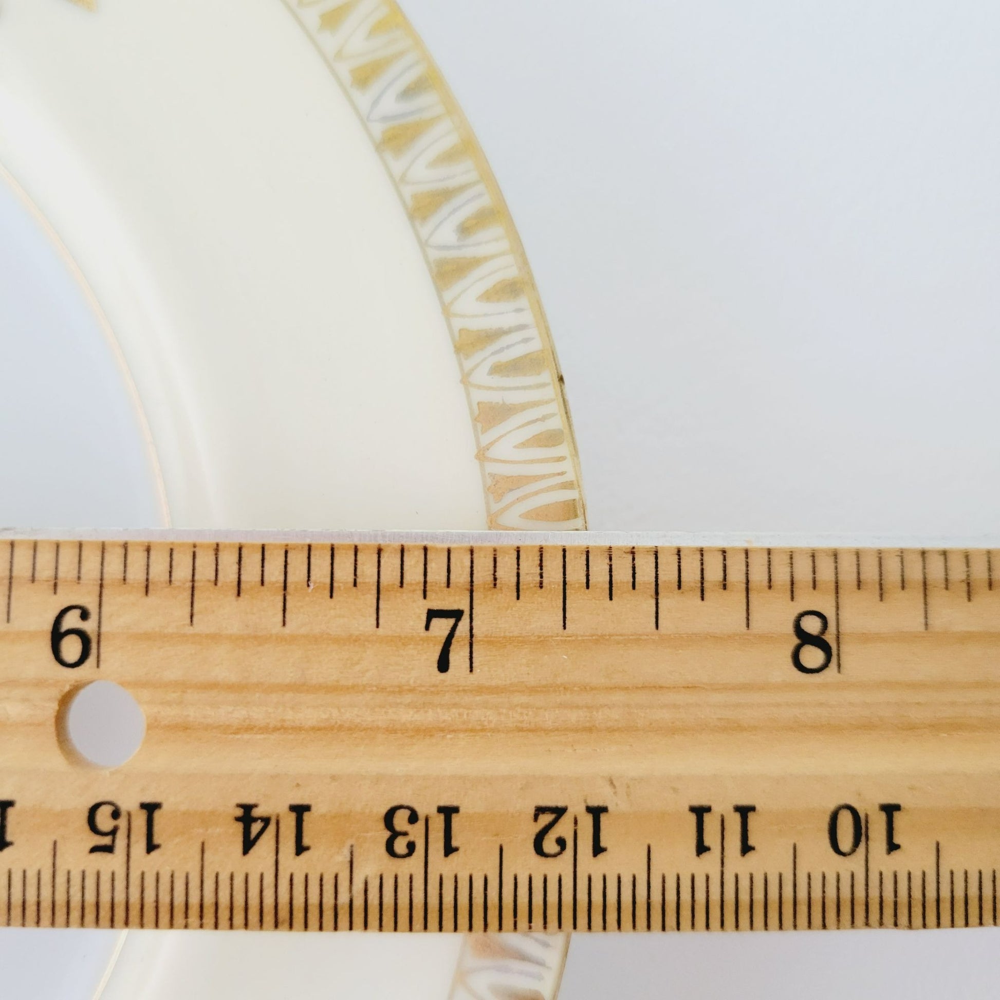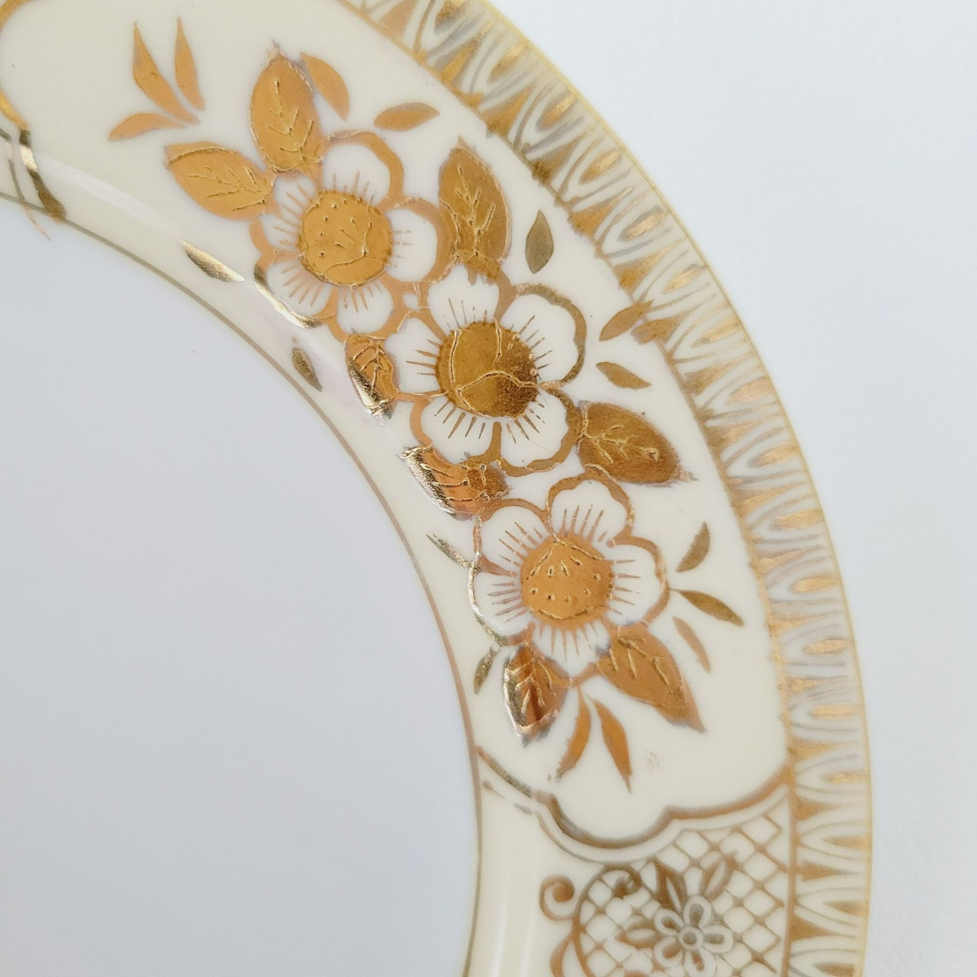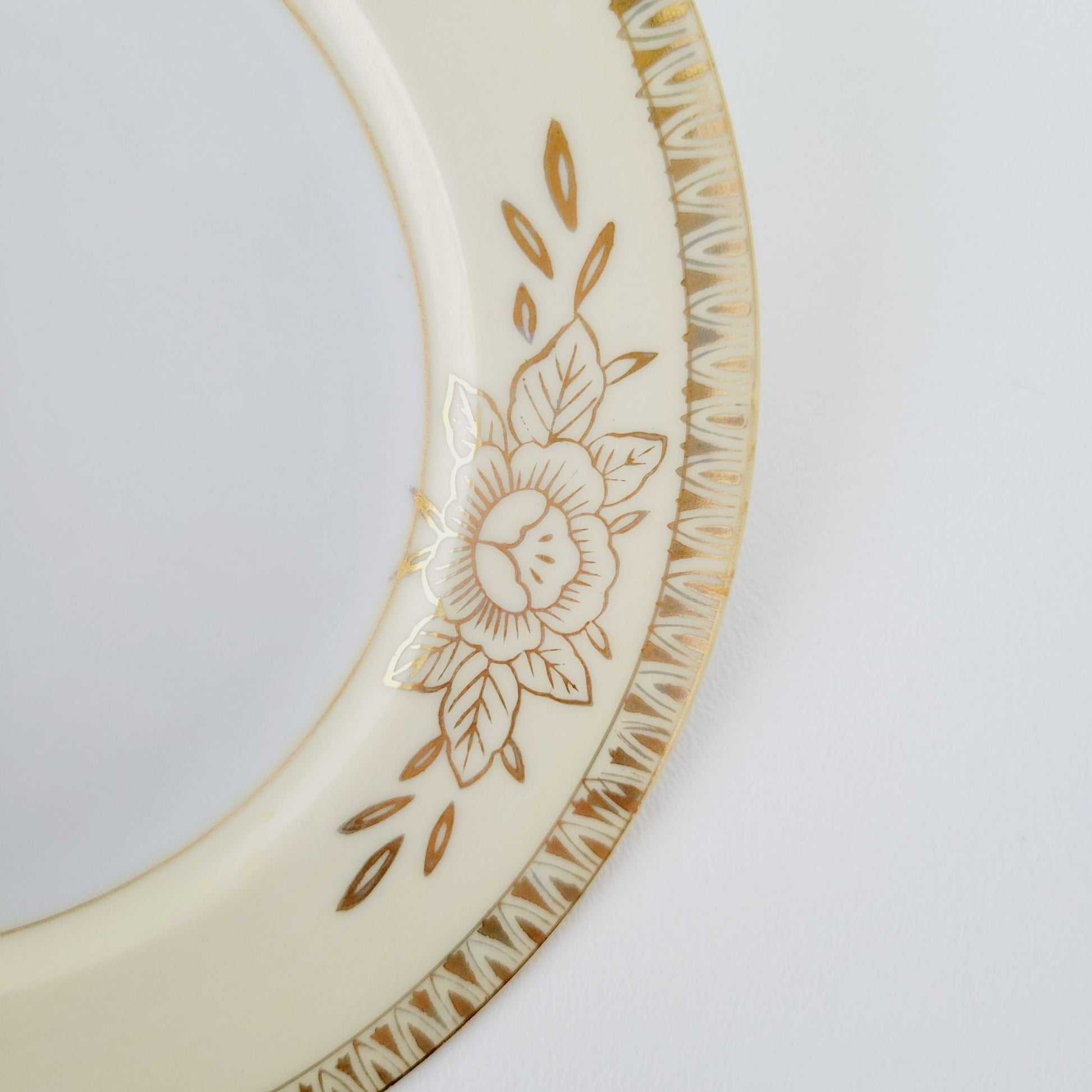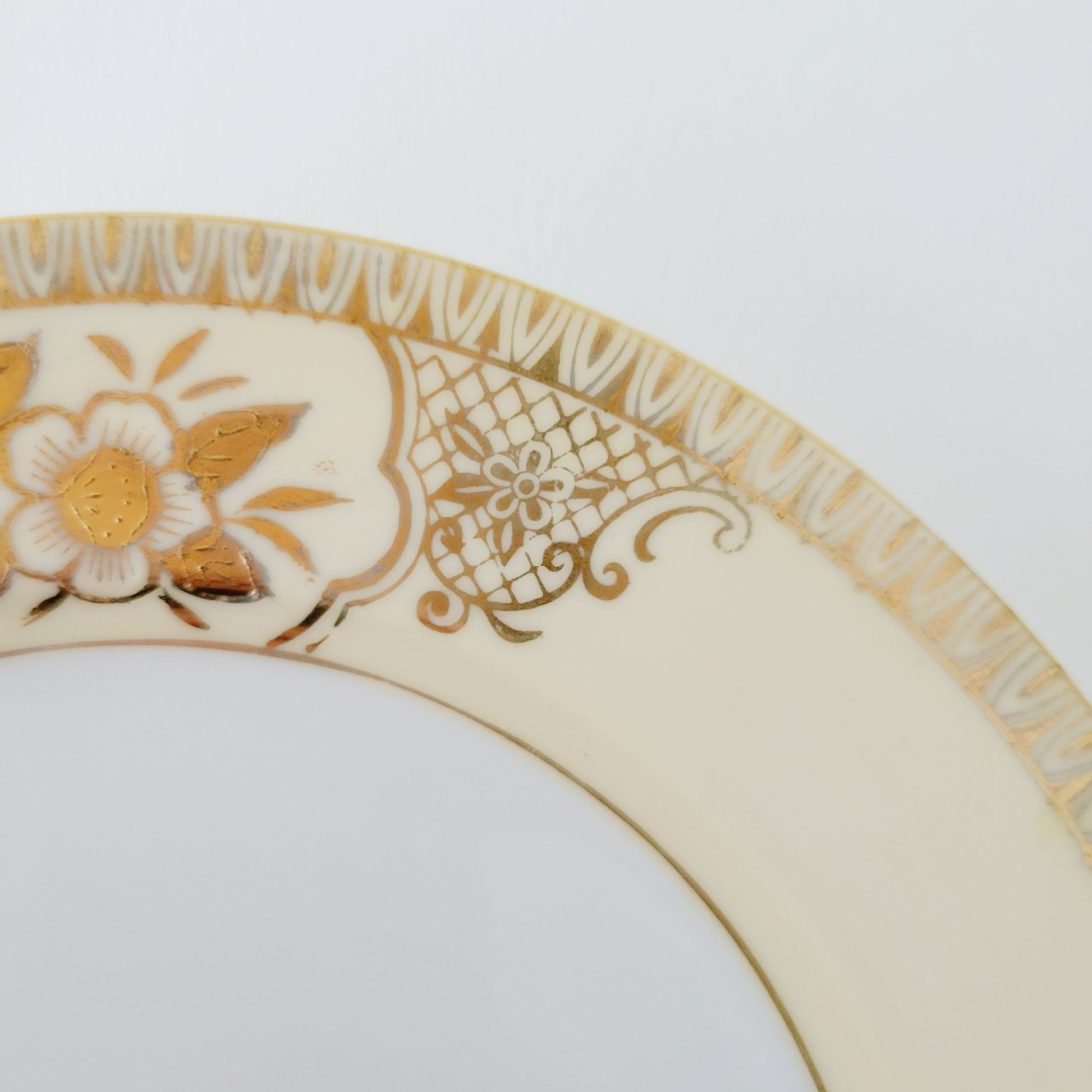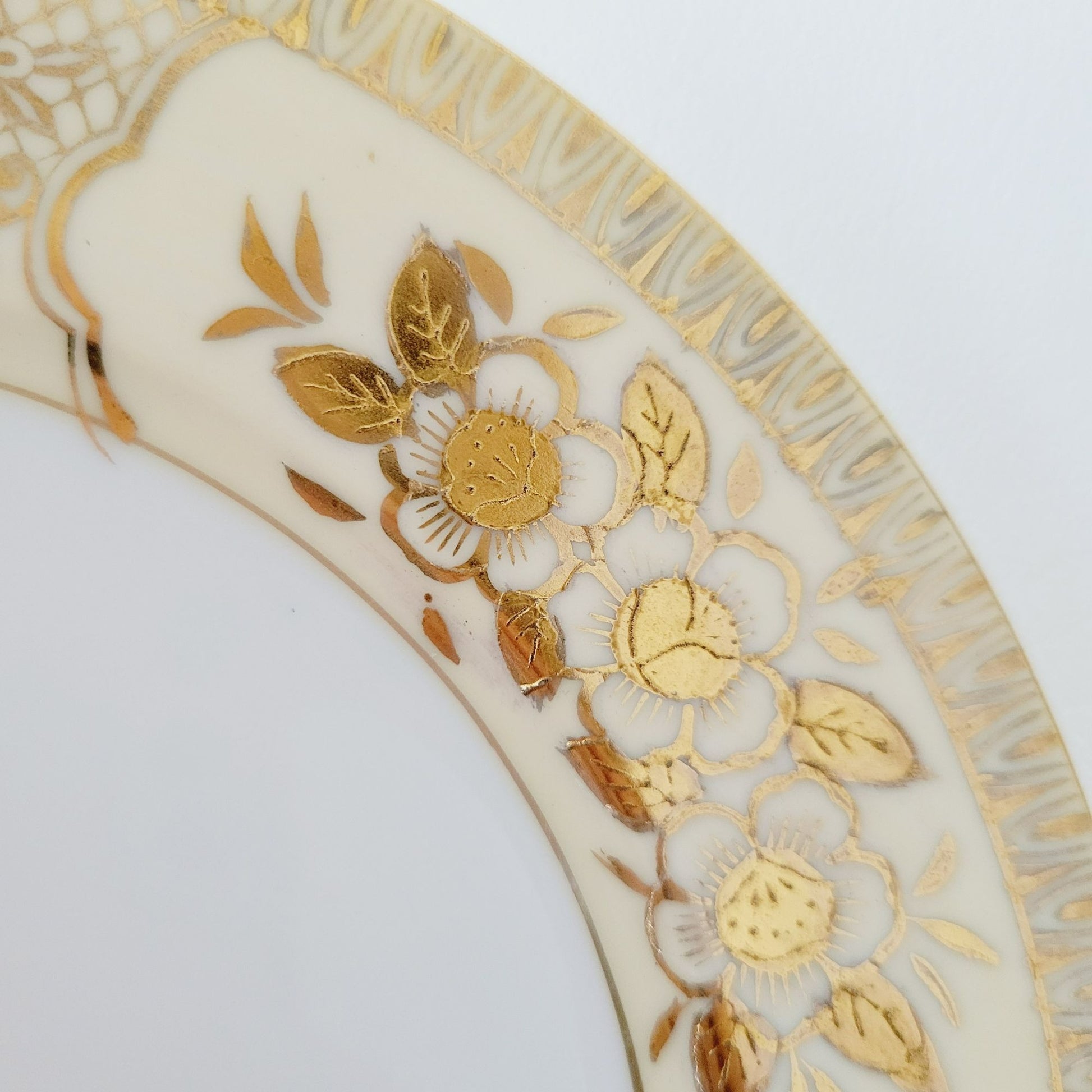 Pair of vintage Chikaramachi embossed hand-painted salad plates from the 1920s-30s, featuring a gold and cream floral design. Part of the Noritake plate collection, made in Japan.
