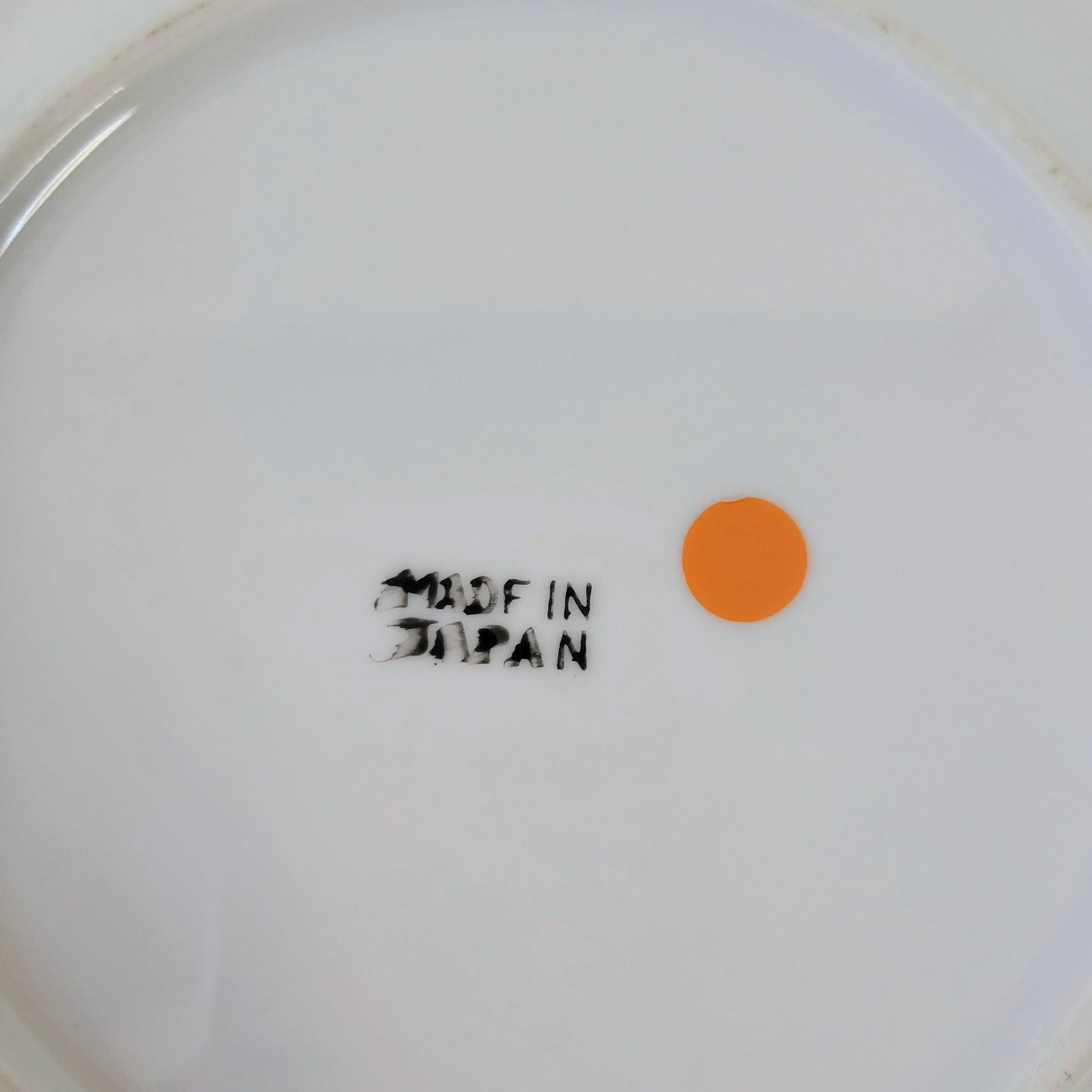 This Vintage Courting Couple Lusterware Salad Plate, with a striking red rim, measures 7.75". Perfect for an English countryside tea party, it also doubles as unique wall decor. Made in Japan, the brand is unknown.