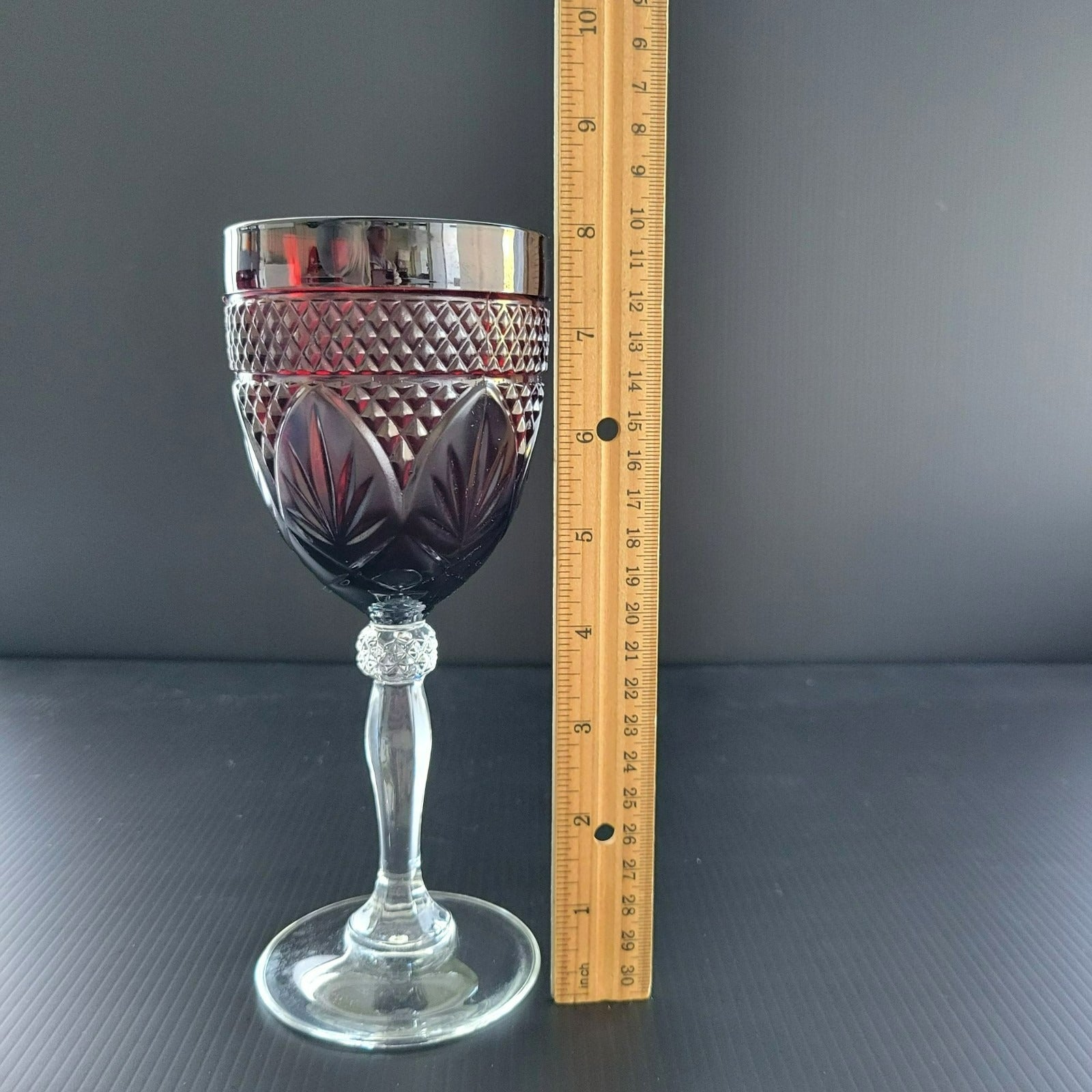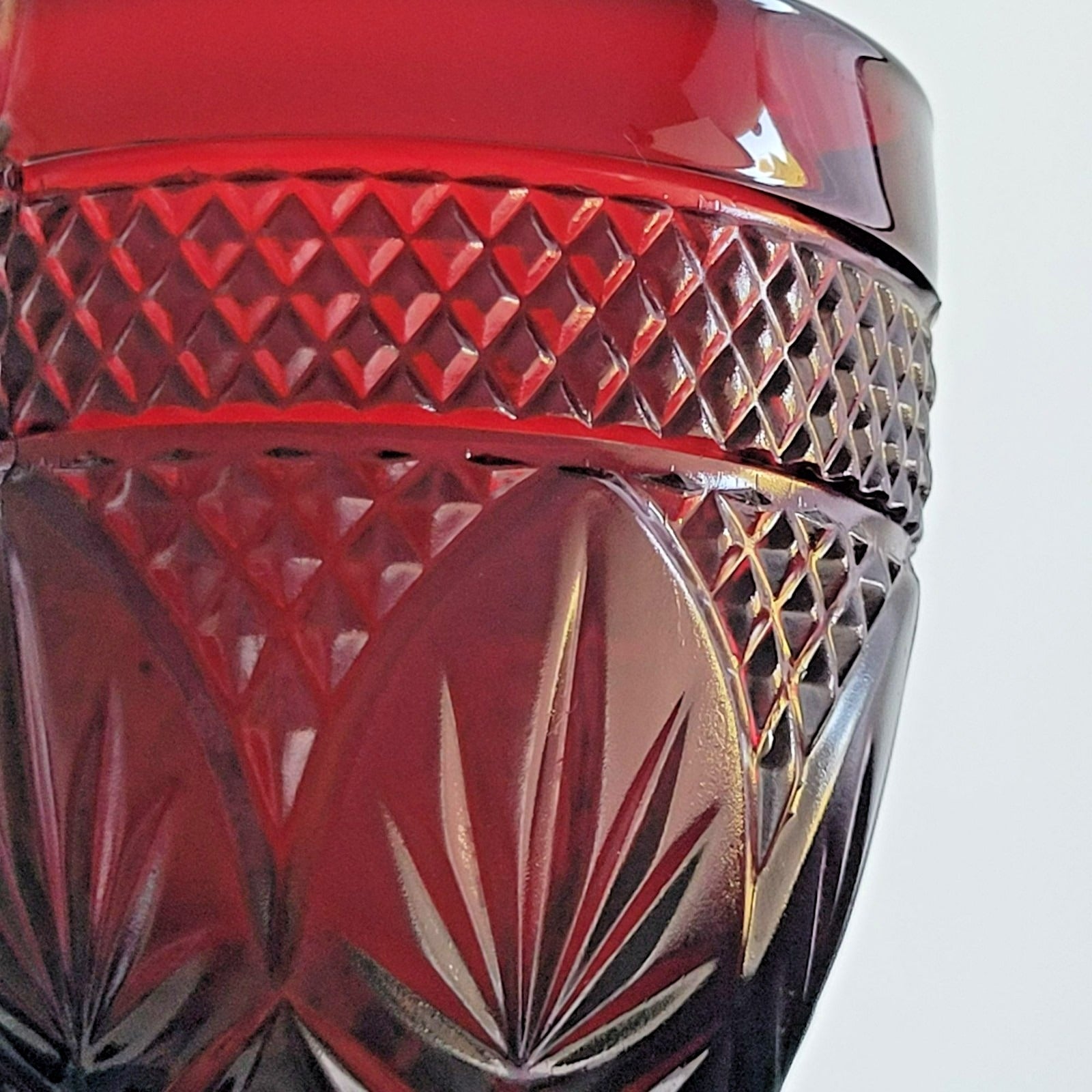 Cristal D'Arques set of two Antique Ruby Water Goblets. Featuring a pressed cut pattern and clear stem, these discontinued pieces add a touch of fun to any dining experience.