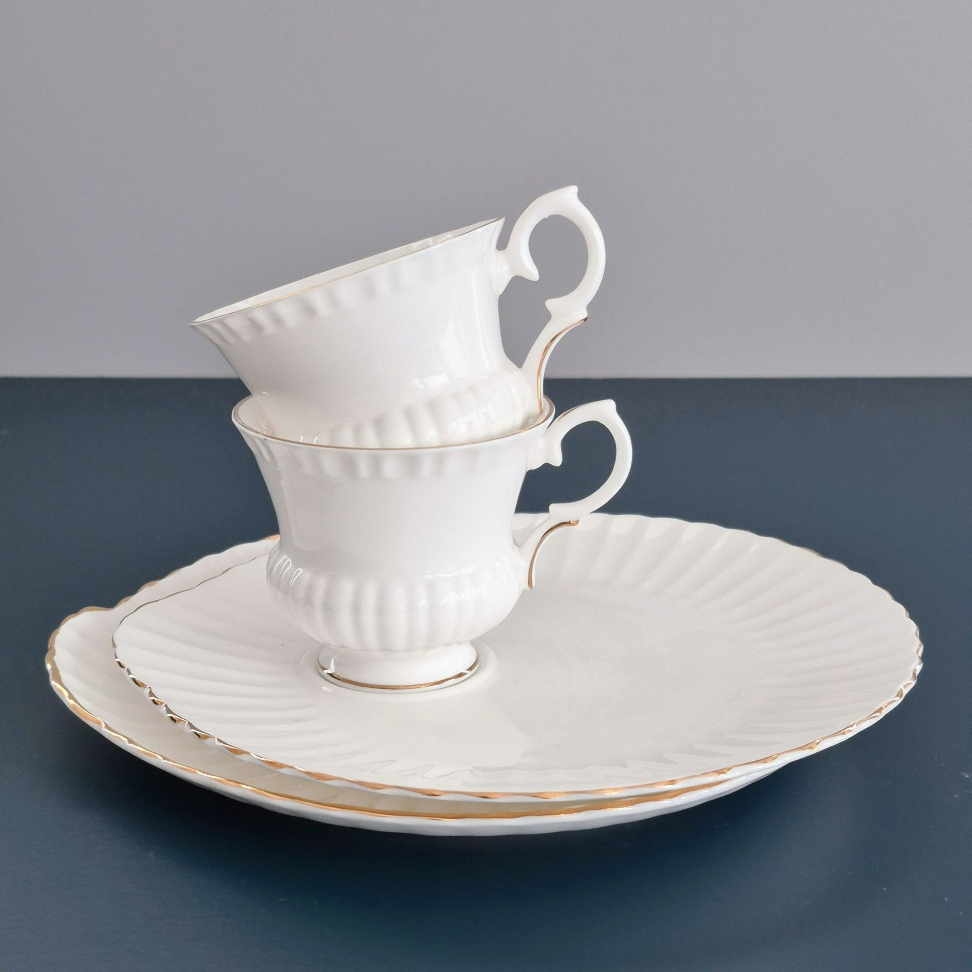 This exquisite set includes two vintage Crown Staffordshire teacups and snack plates with elegant gold trim. Crafted from ribbed bone china, each piece features a classic scalloped design, perfect for afternoon tea or display. Made in England, this set adds timeless charm to any collection.