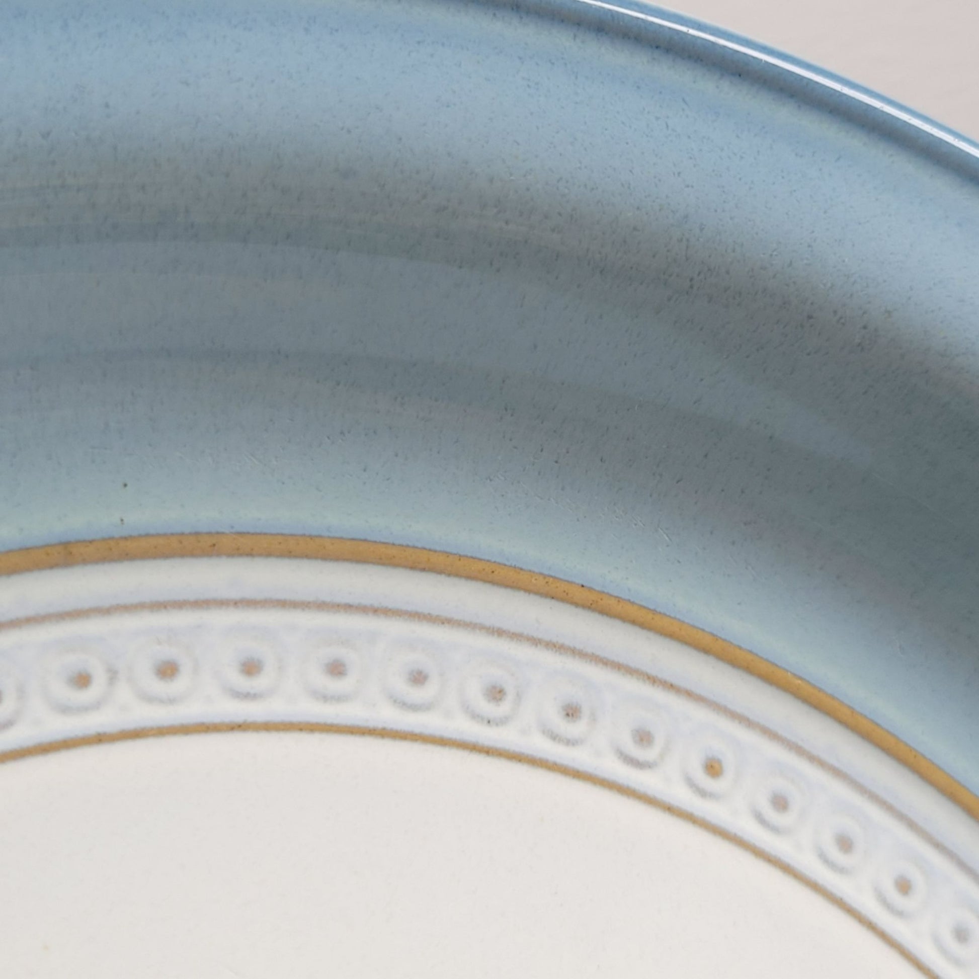 This vintage Denby Castile dinner plate features a blue rim with tan embossed accents. Crafted from stoneware and made in England, it has a glossy finish and is now discontinued, making it an ideal replacement piece for collectors.