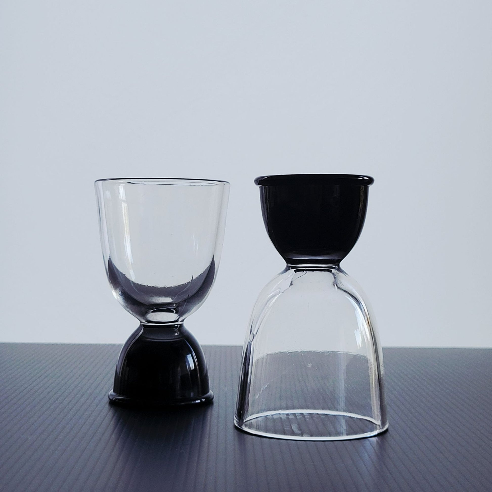 Elegant and functional, this vintage double egg cup set features a minimalist design in black and clear glass. Perfect for any breakfast setting, these large 4.5 size cups blend seamlessly into any kitchen décor.