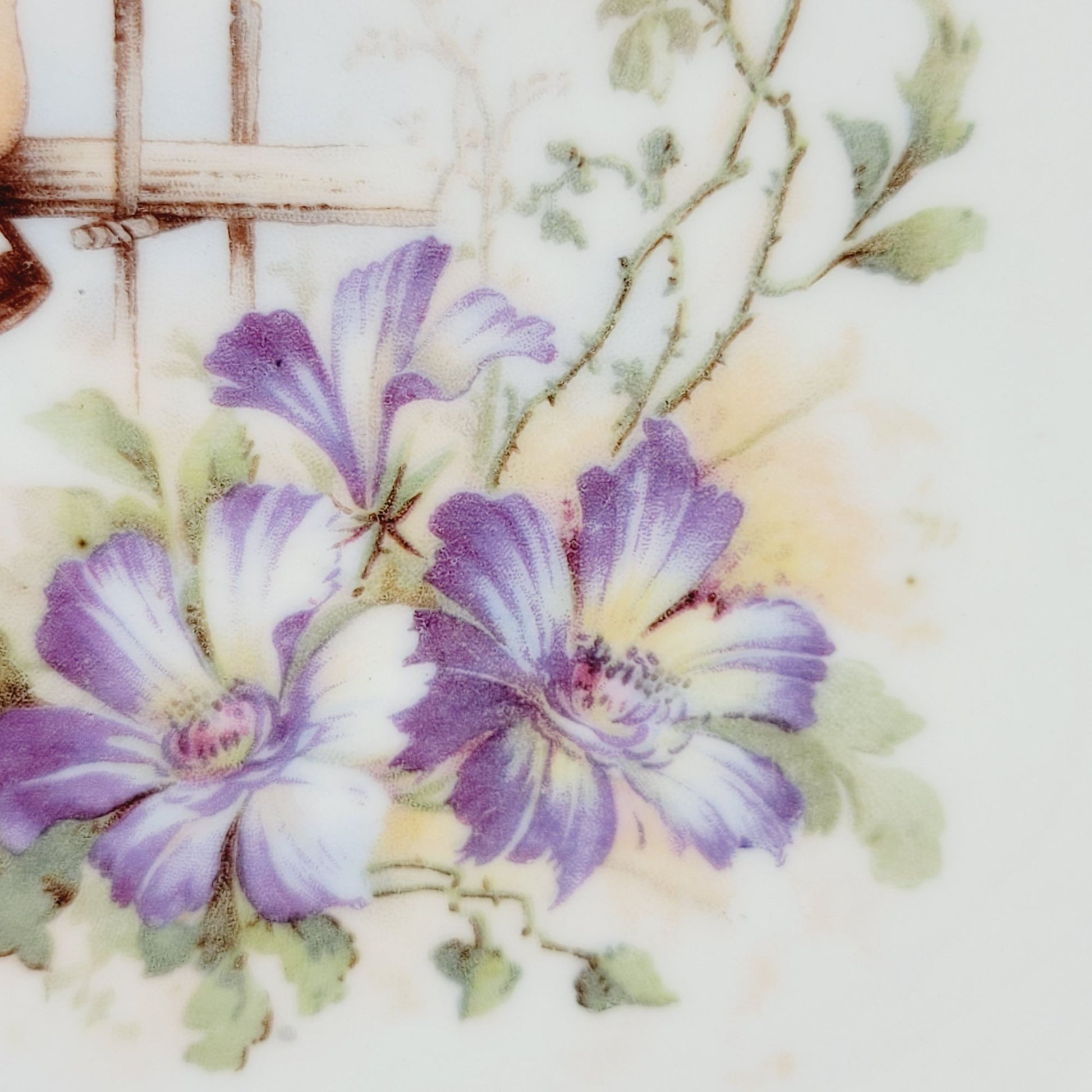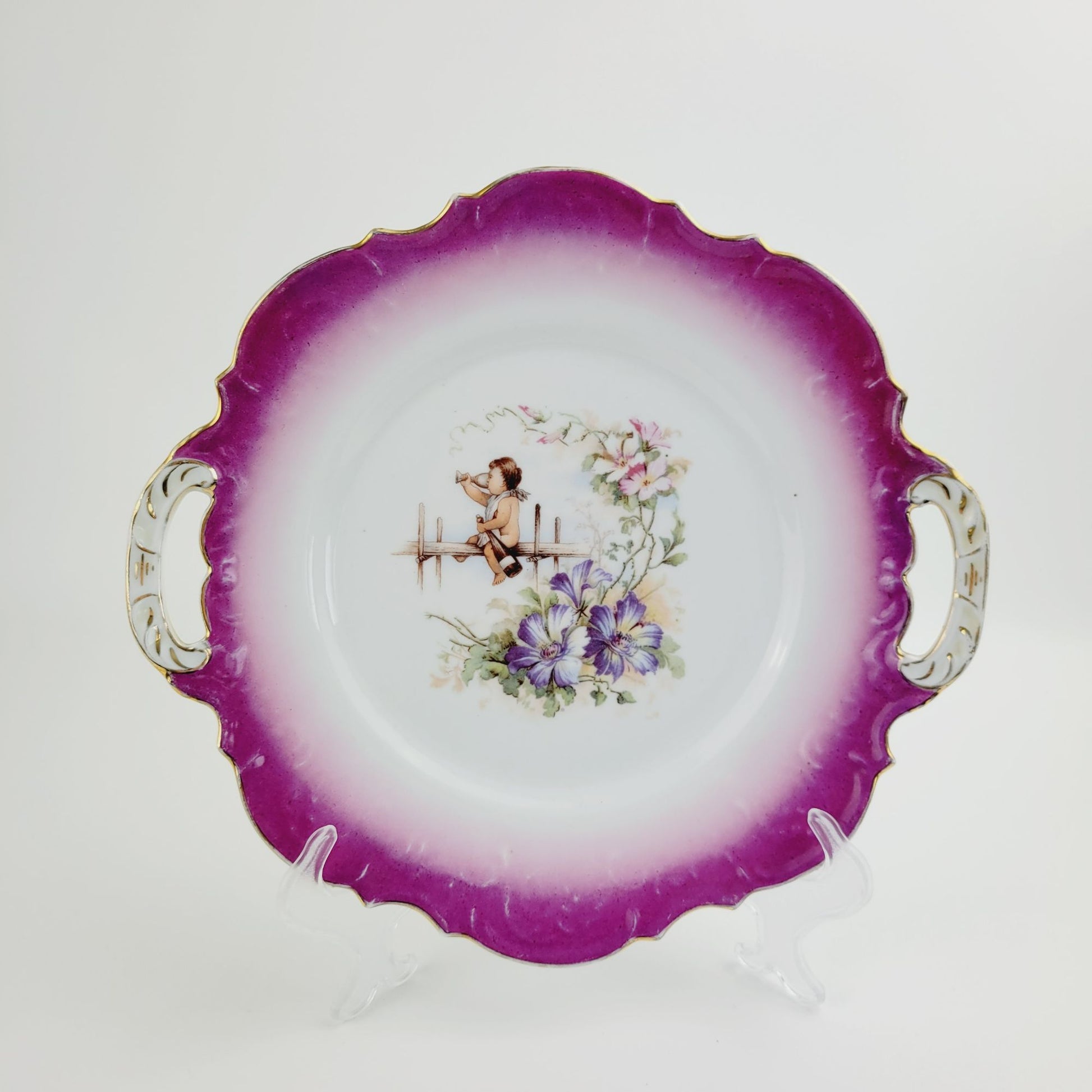 This exquisite porcelain plate, adorned with a charming cherub and delicate floral motifs, embodies the elegance of bygone eras. Its rich colors and intricate details make it a captivating piece for vintage collectors. With its graceful handles, this plate serves as both a functional and decorative artifact from a vanished time.