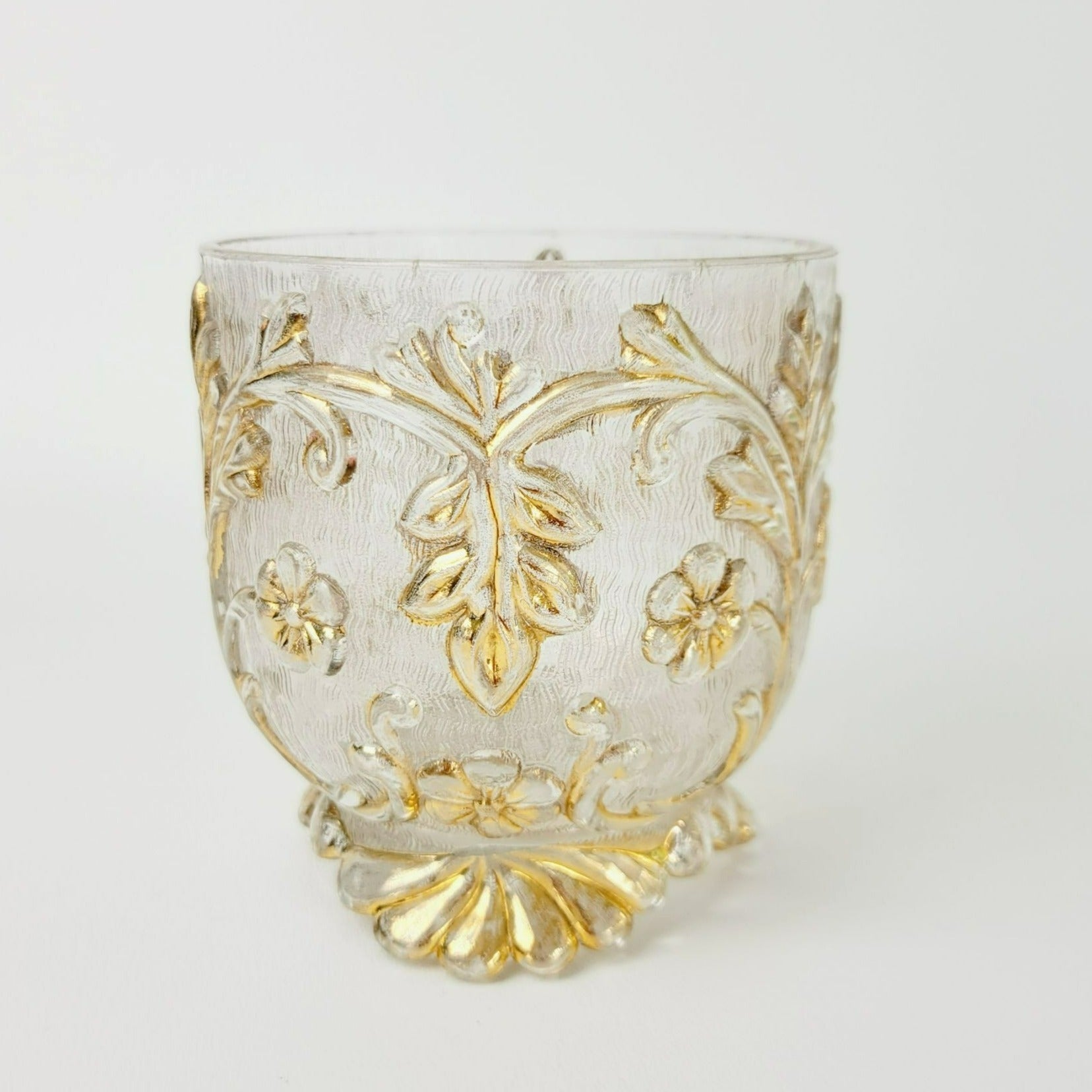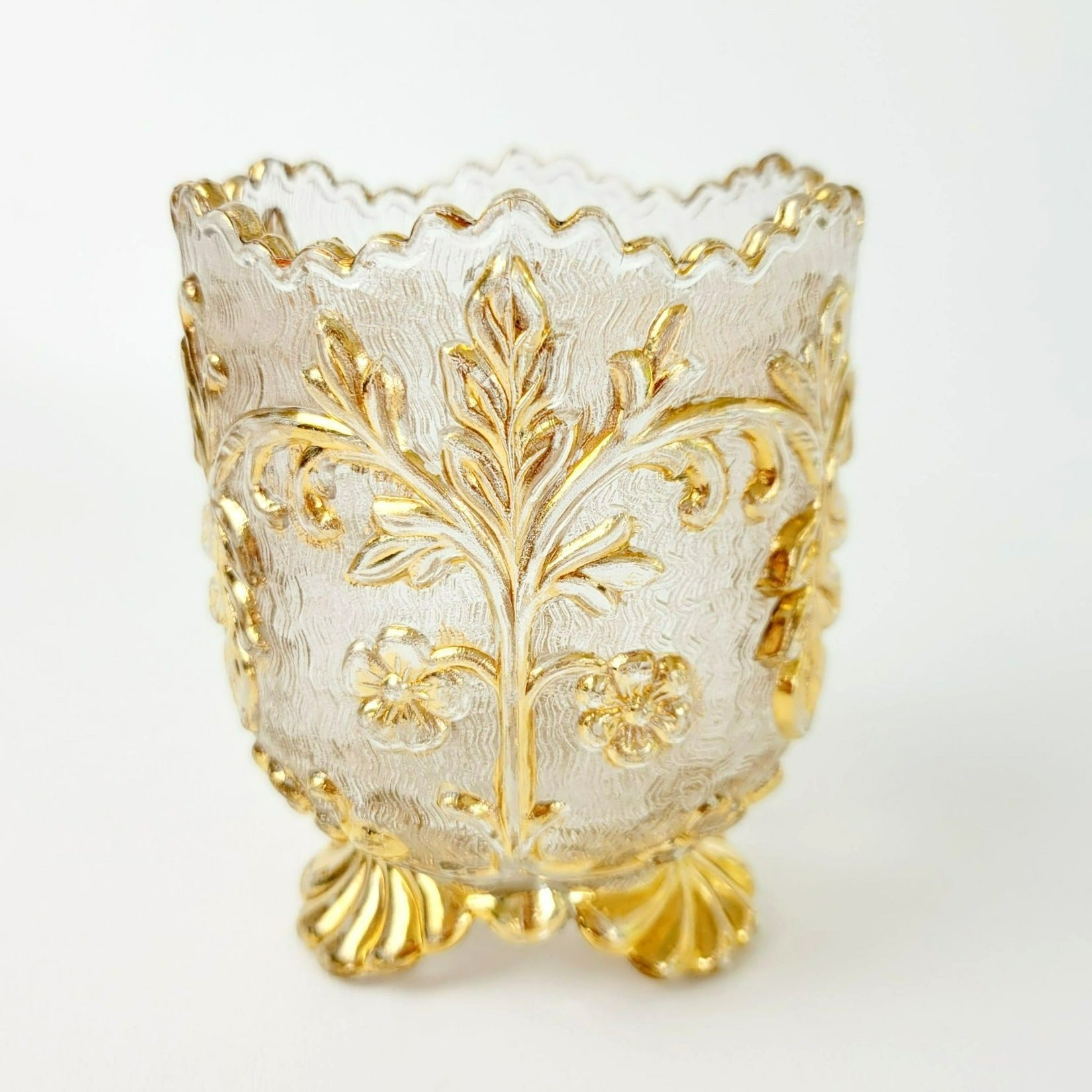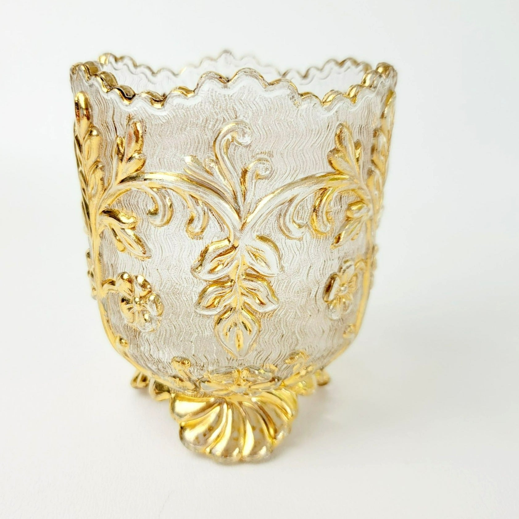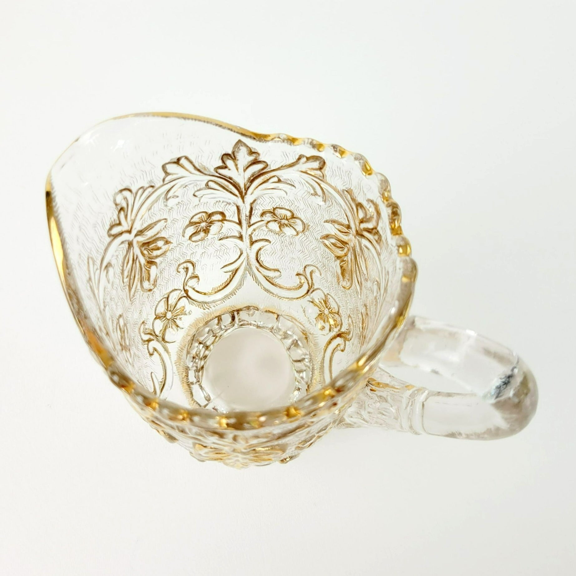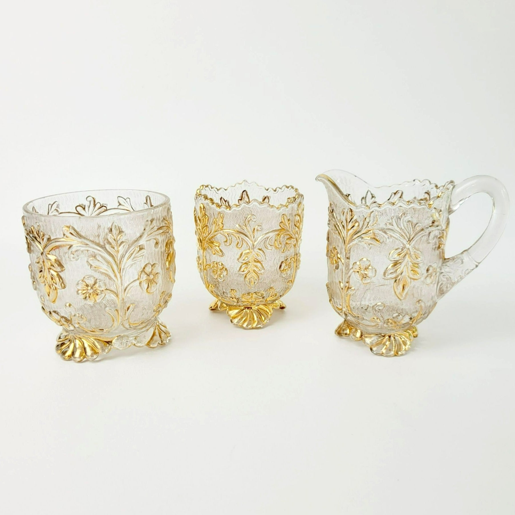 This antique c1898 Beaumont Glass Floral Spooner, Creamer & Open Sugar Bowl set features textured clear and gold pressed glass. A true vintage USA glassware treasure, perfect for collectors or to add a touch of elegance to any table setting.