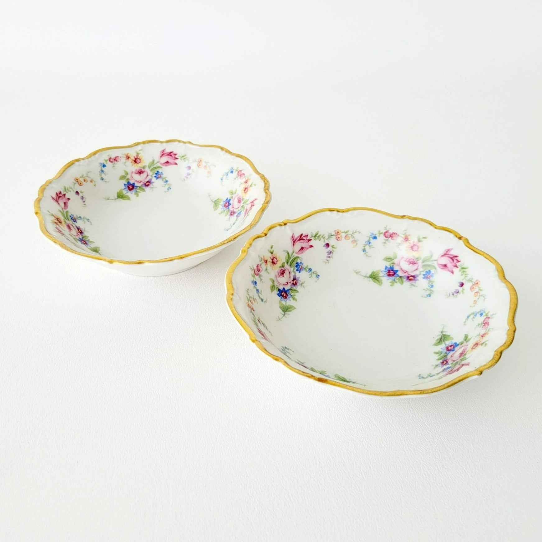 These elegant Edelstein Maria-Theresia dessert/berry bowls features the Margareta pattern, a pink floral design with gold edging. Made in Germany, these vintage porcelain bowls adds a touch of class to any meal.