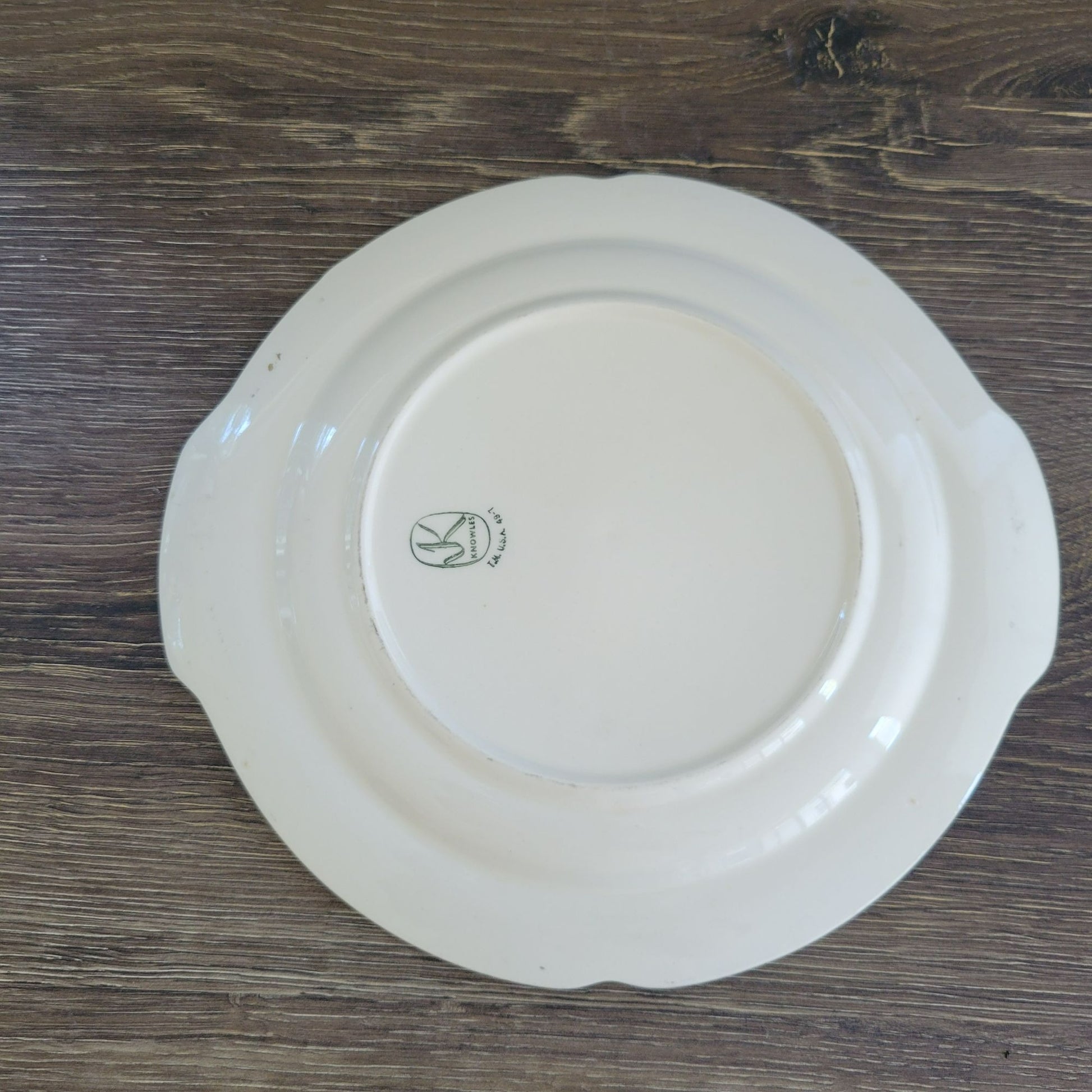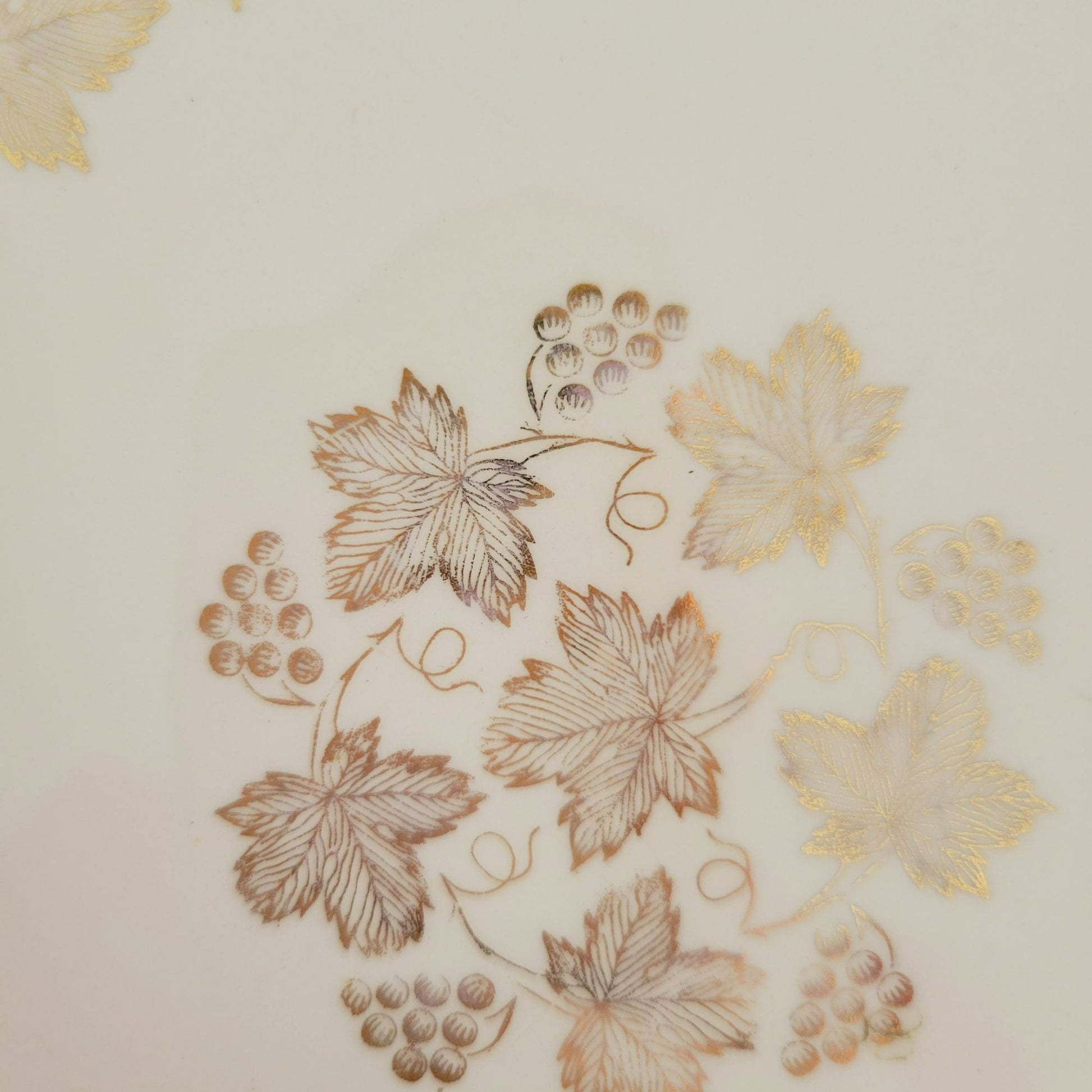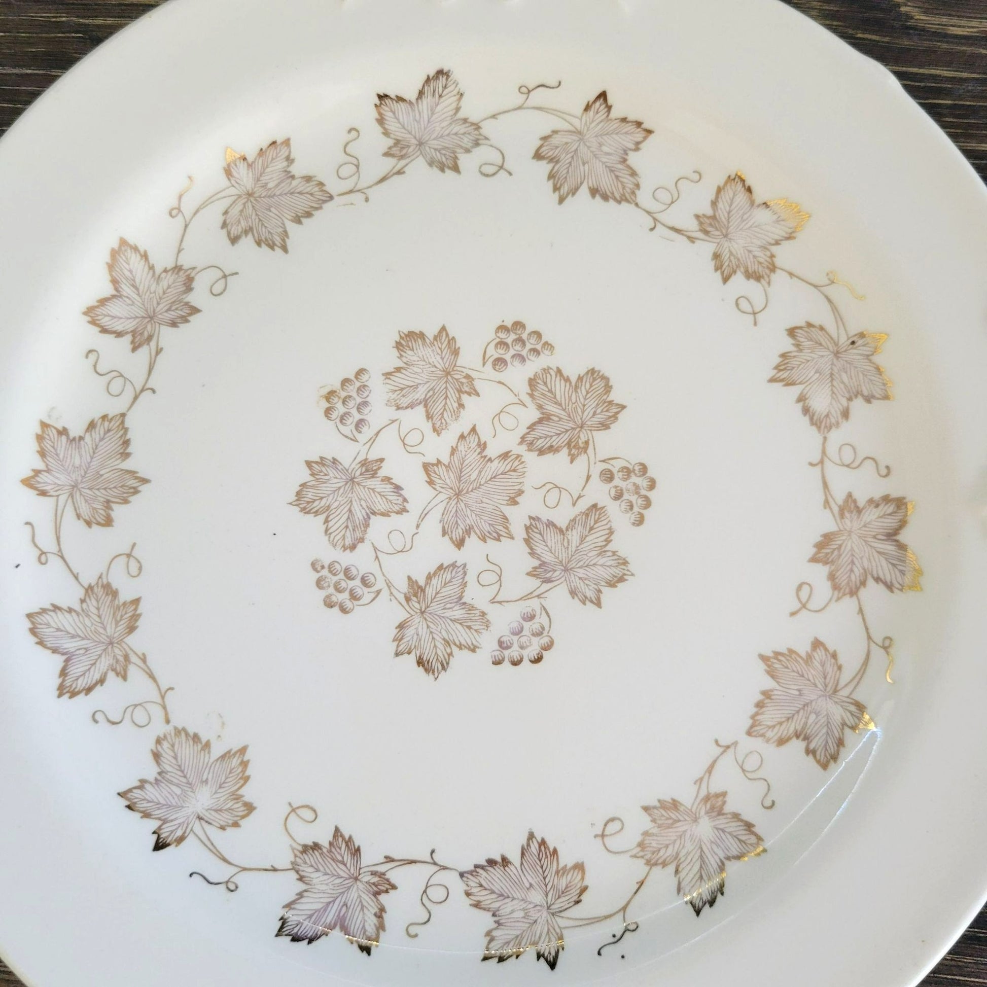 This vintage Edward Knowles cake plate featuring gold leaf and grape design, perfect for autumn gatherings. Made in the USA, this cake plate adds a touch of class to your table setting.