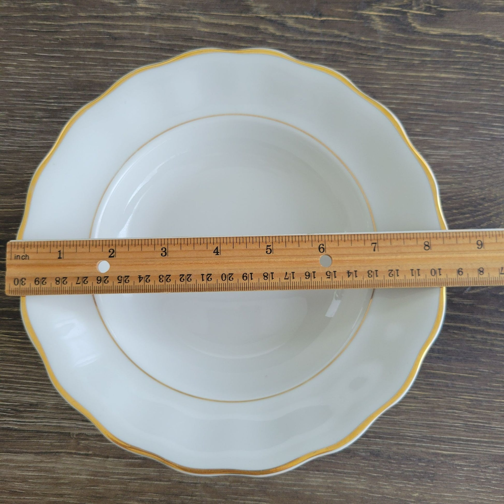 Elevate your dining experience with the Favolina-Karolina Golden Wedding Rimmed Soup Bowl. Made in Poland, this bright white porcelain bowl features a thick gold trim and an inner gold band.