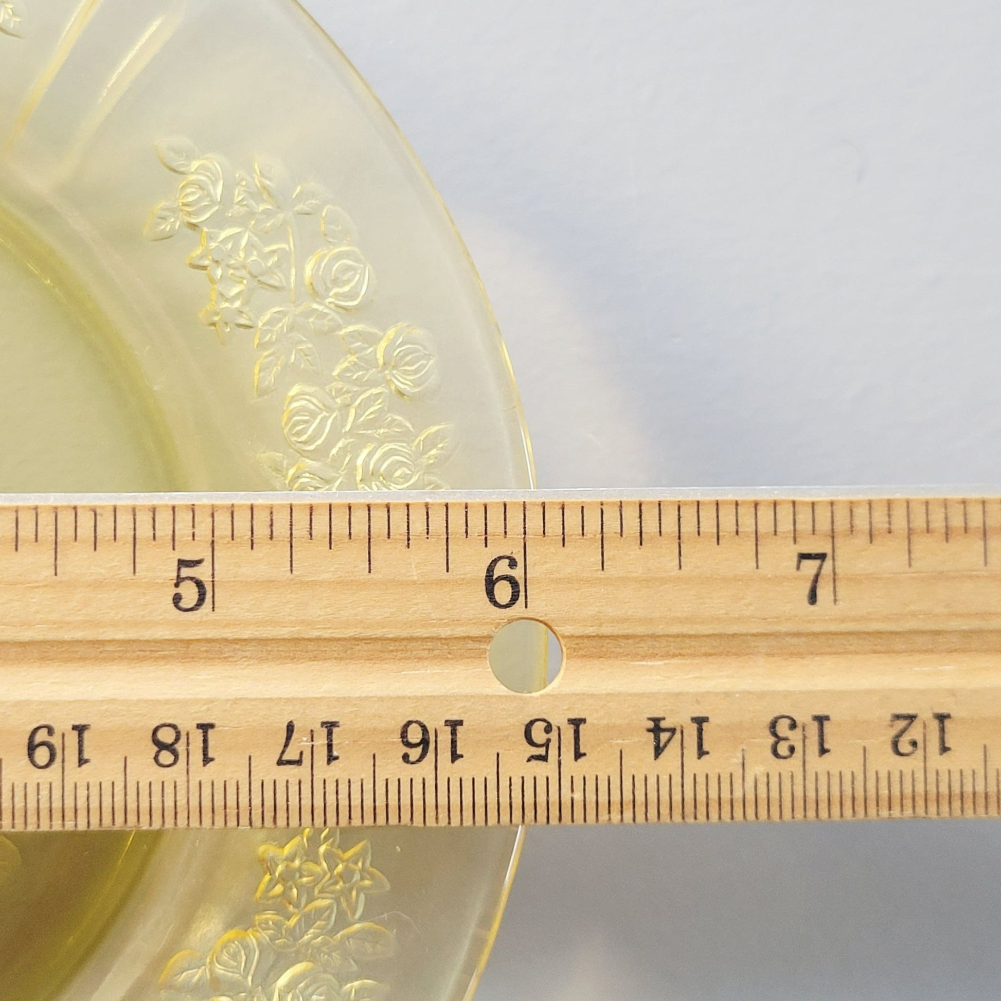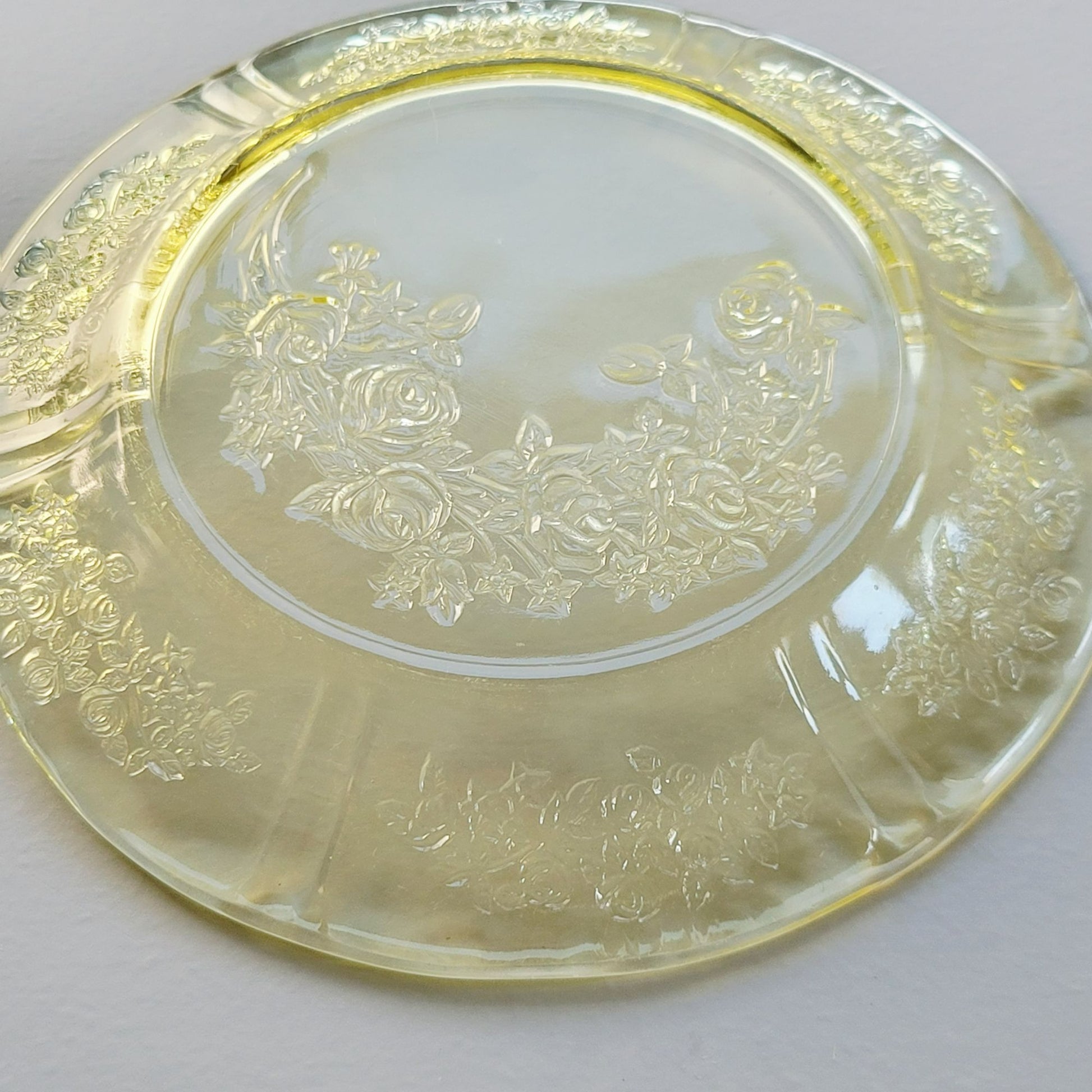 This vintage set of two Federal Glass Sharon bread plates features a lovely yellow amber color with a rose floral design. Made in the USA during the 1930s, these Depression Glass pieces are perfect for retro or Mid-Century Modern décor enthusiasts.
