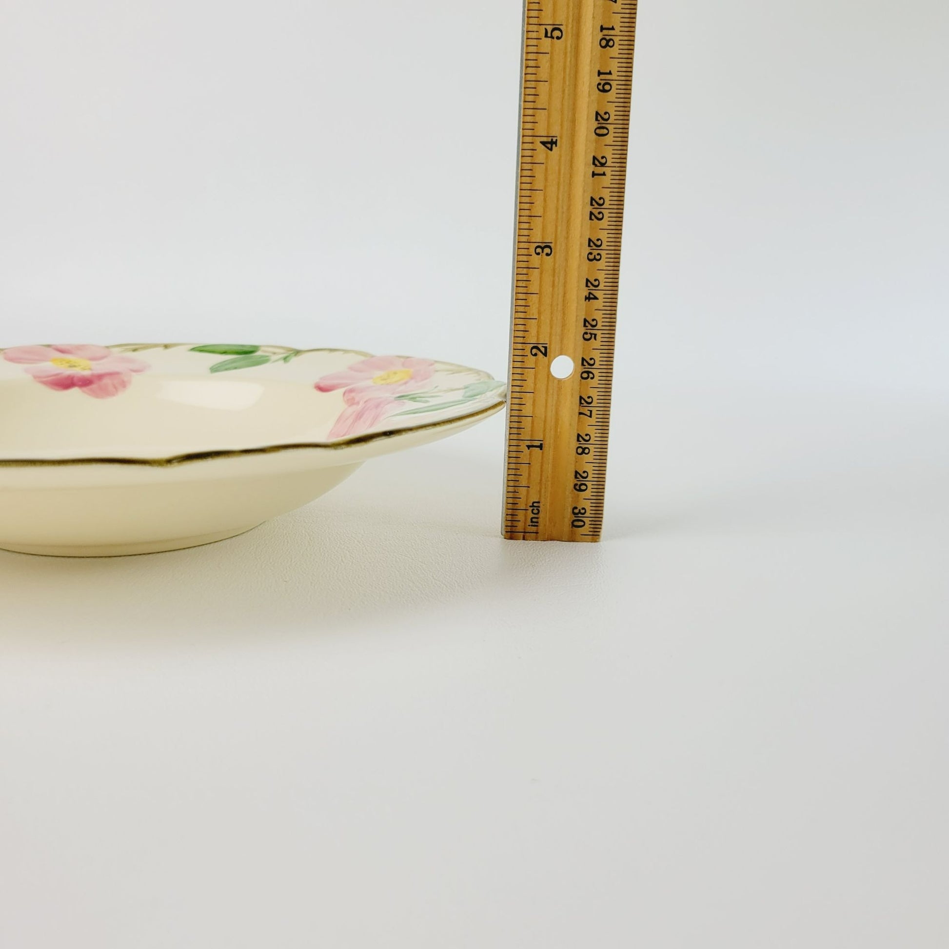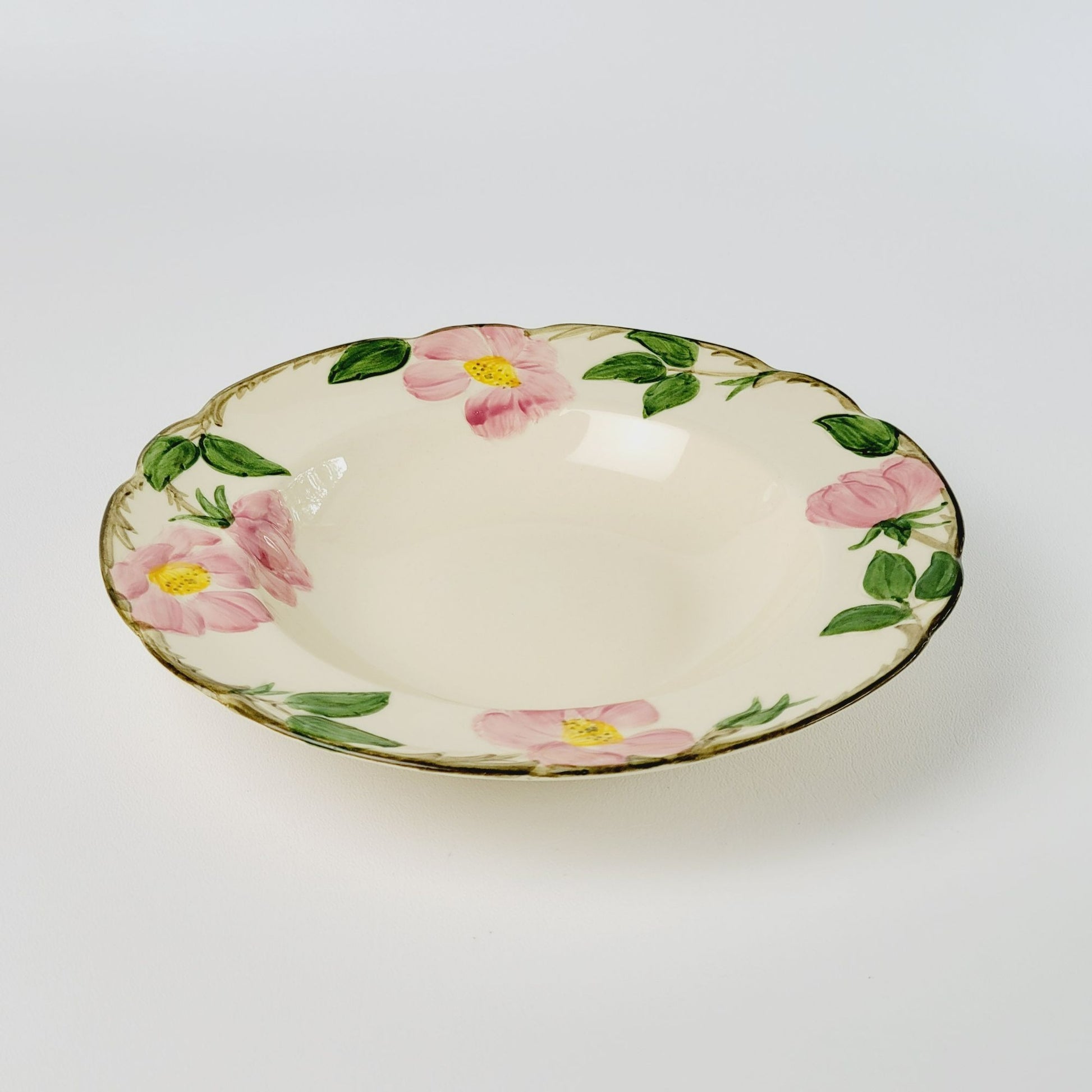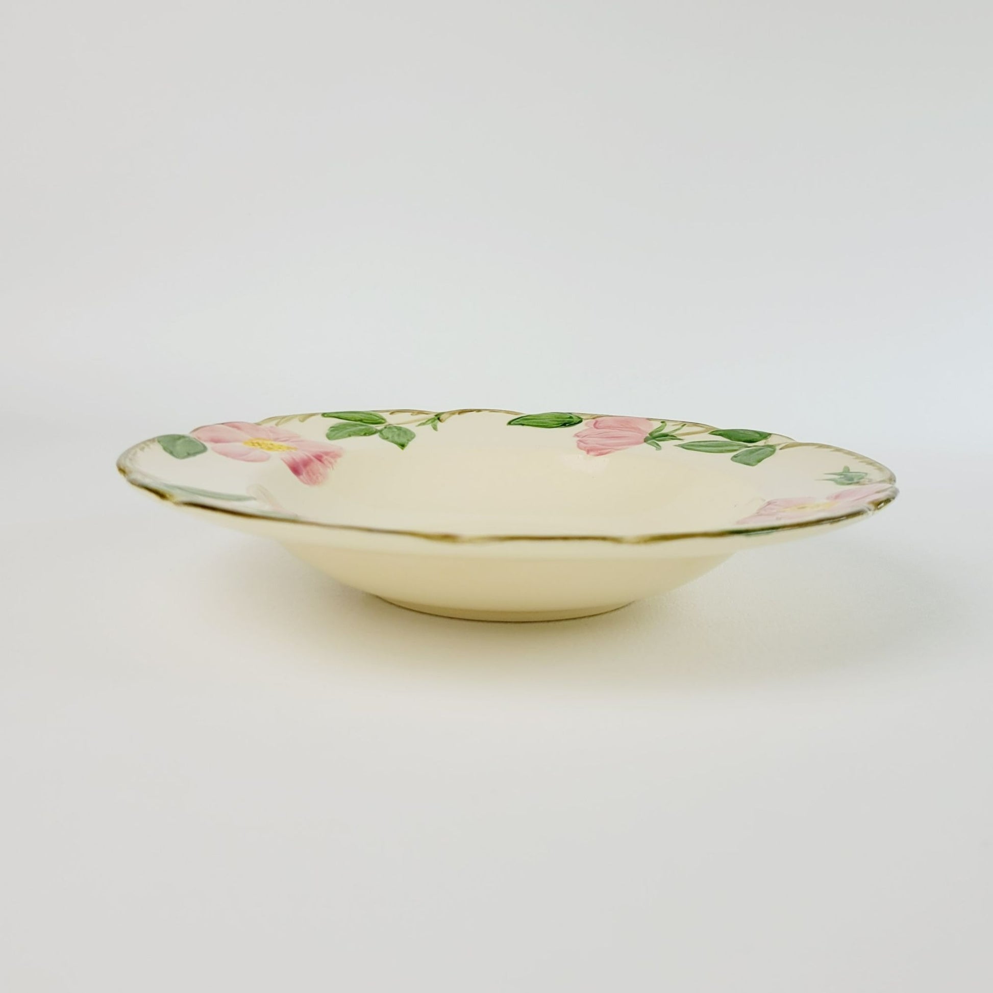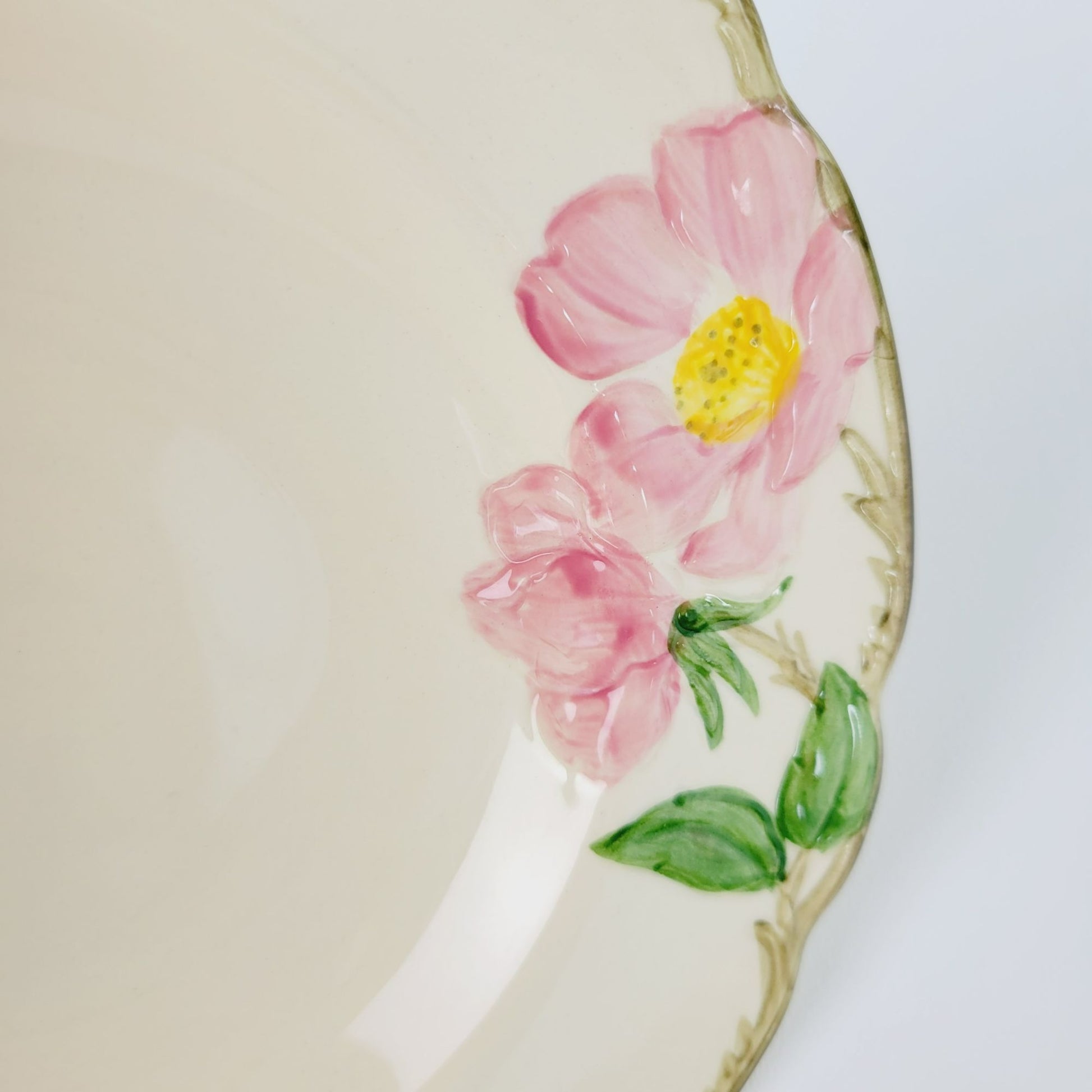 Desert Rose Cereal Bowl by Franciscan with USA Back Stamp. Piece has a cream colored base and is embossed with pink flowers and green leaves.
