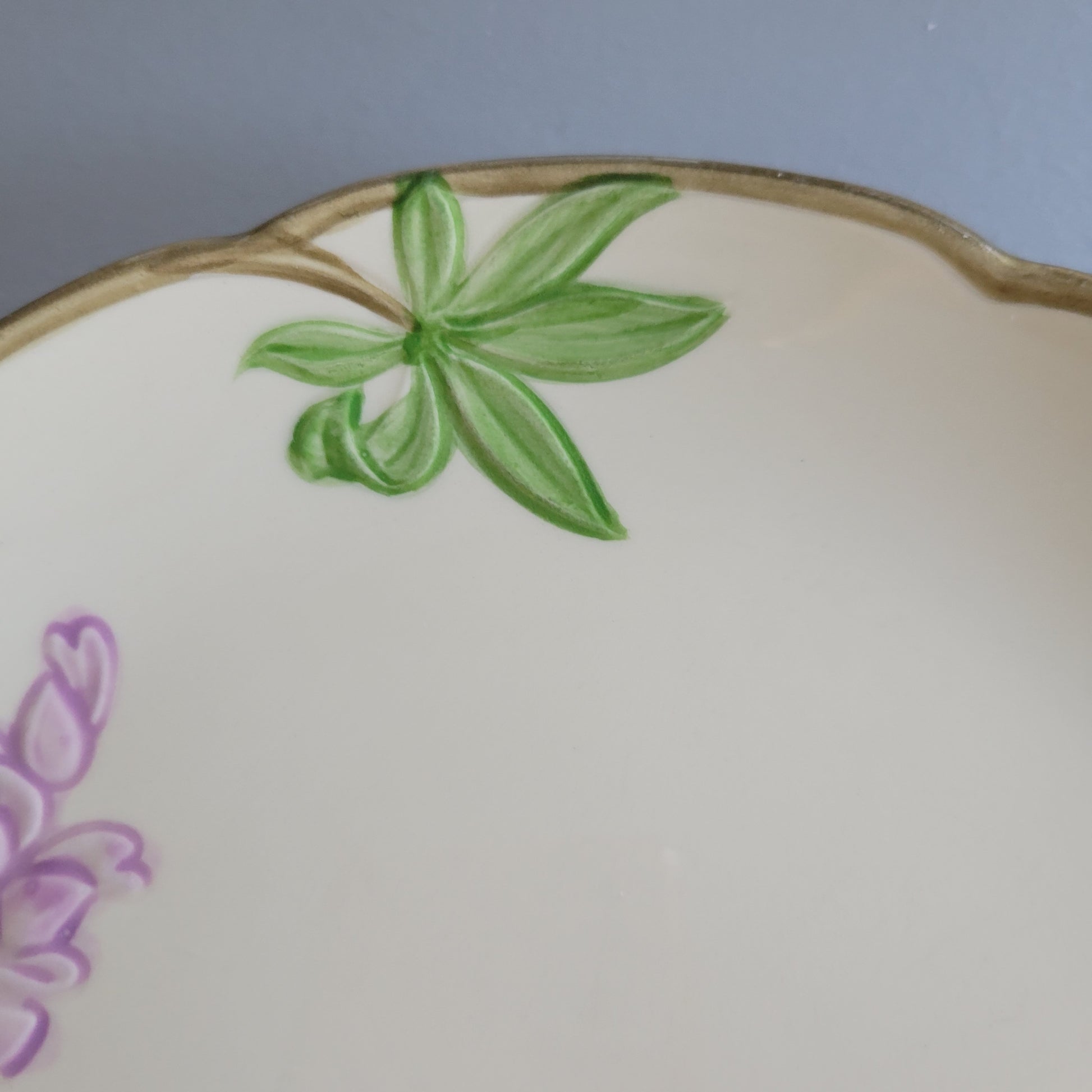 Vintage Franciscan Poppy salad plate from the 1950s features hand-painted yellow and purple floral design. A discontinued collectible perfect for replacement or display.