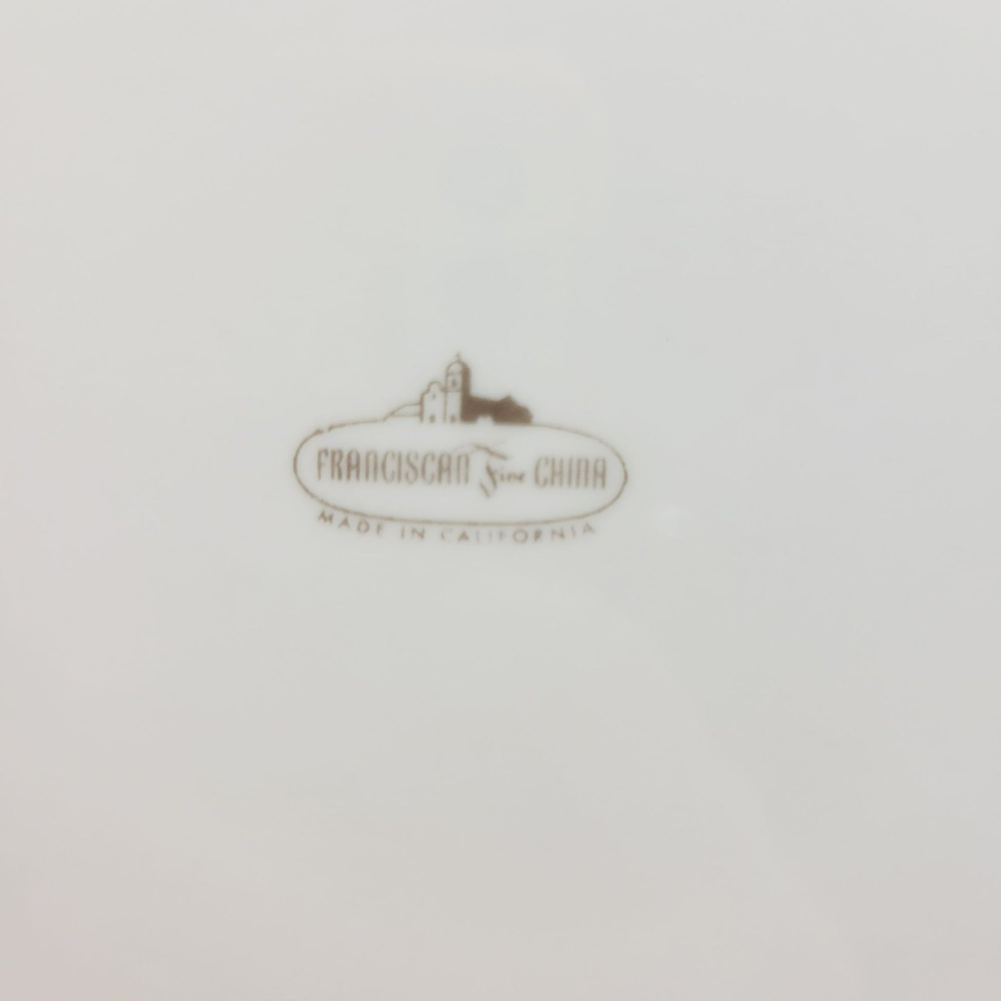 Elegant mid-century modern dinnerware by Franciscan, featuring the charming Willow Green pattern with platinum trim and coupe shape. Ideal for vintage table settings or as replacement pieces. This discontinued 1953 collection adds timeless allure to any kitchen.
