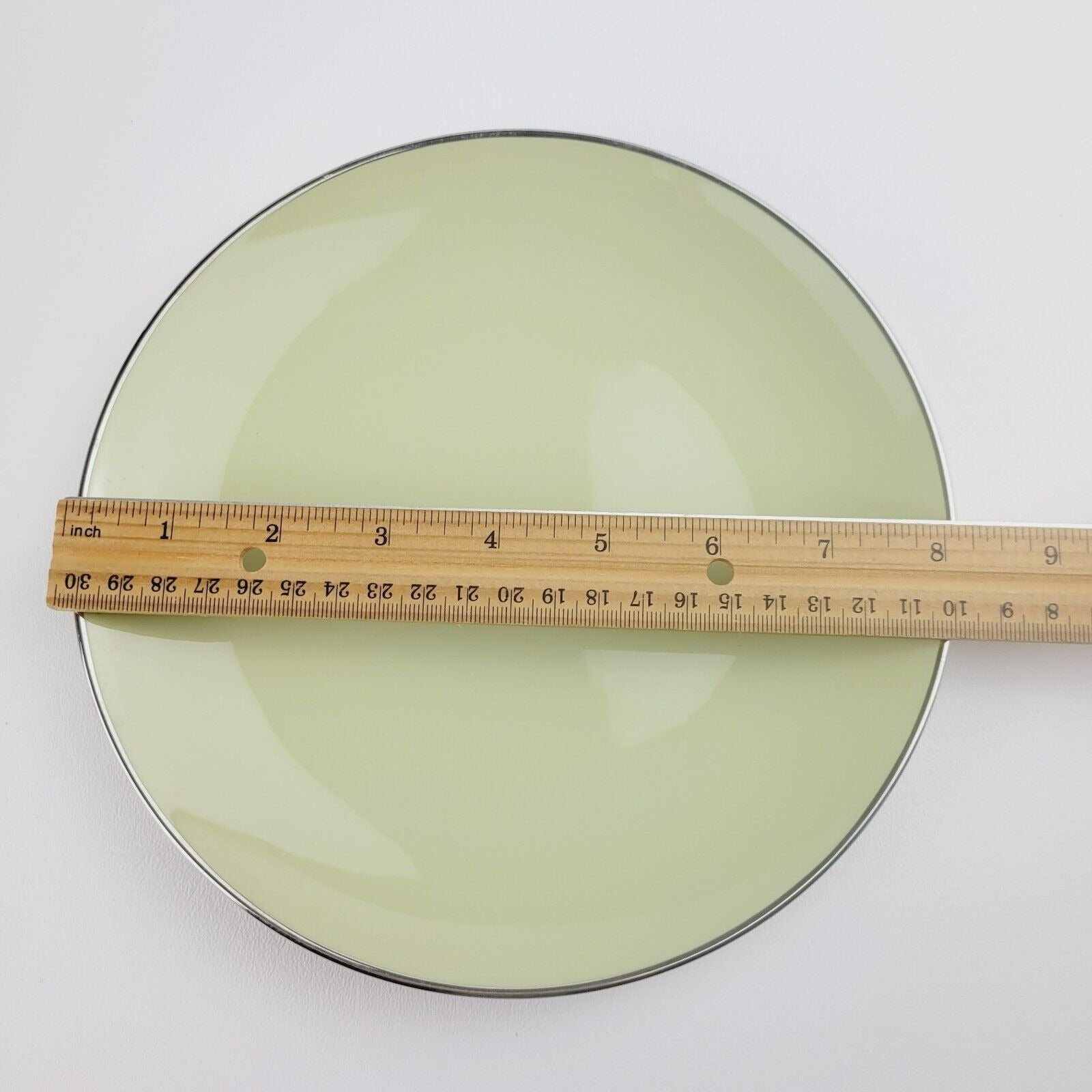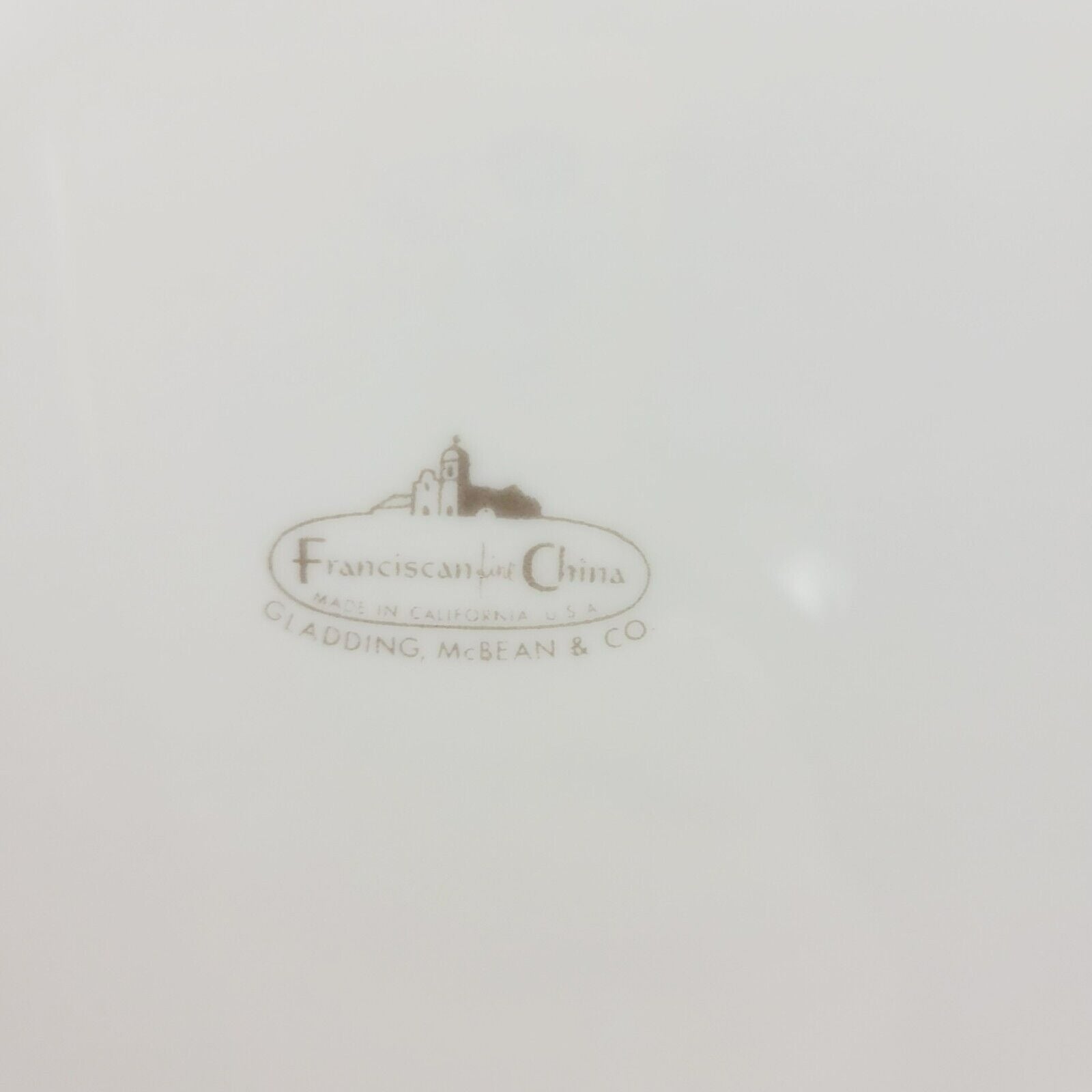 Elegant mid-century modern dinnerware by Franciscan, featuring the charming Willow Green pattern with platinum trim and coupe shape. Ideal for vintage table settings or as replacement pieces. This discontinued 1953 collection adds timeless allure to any kitchen.