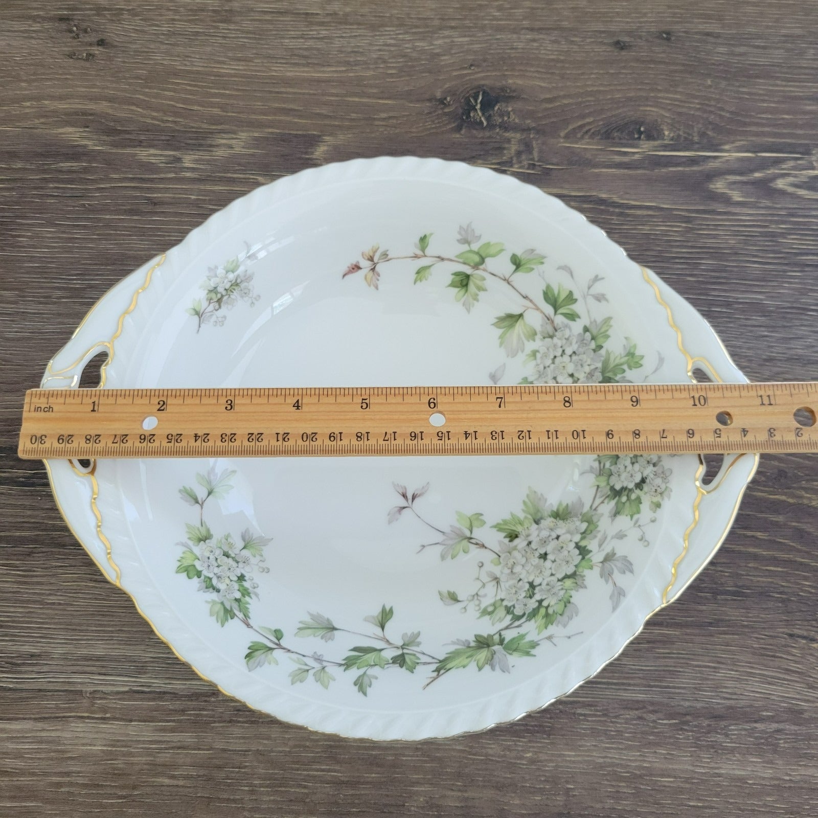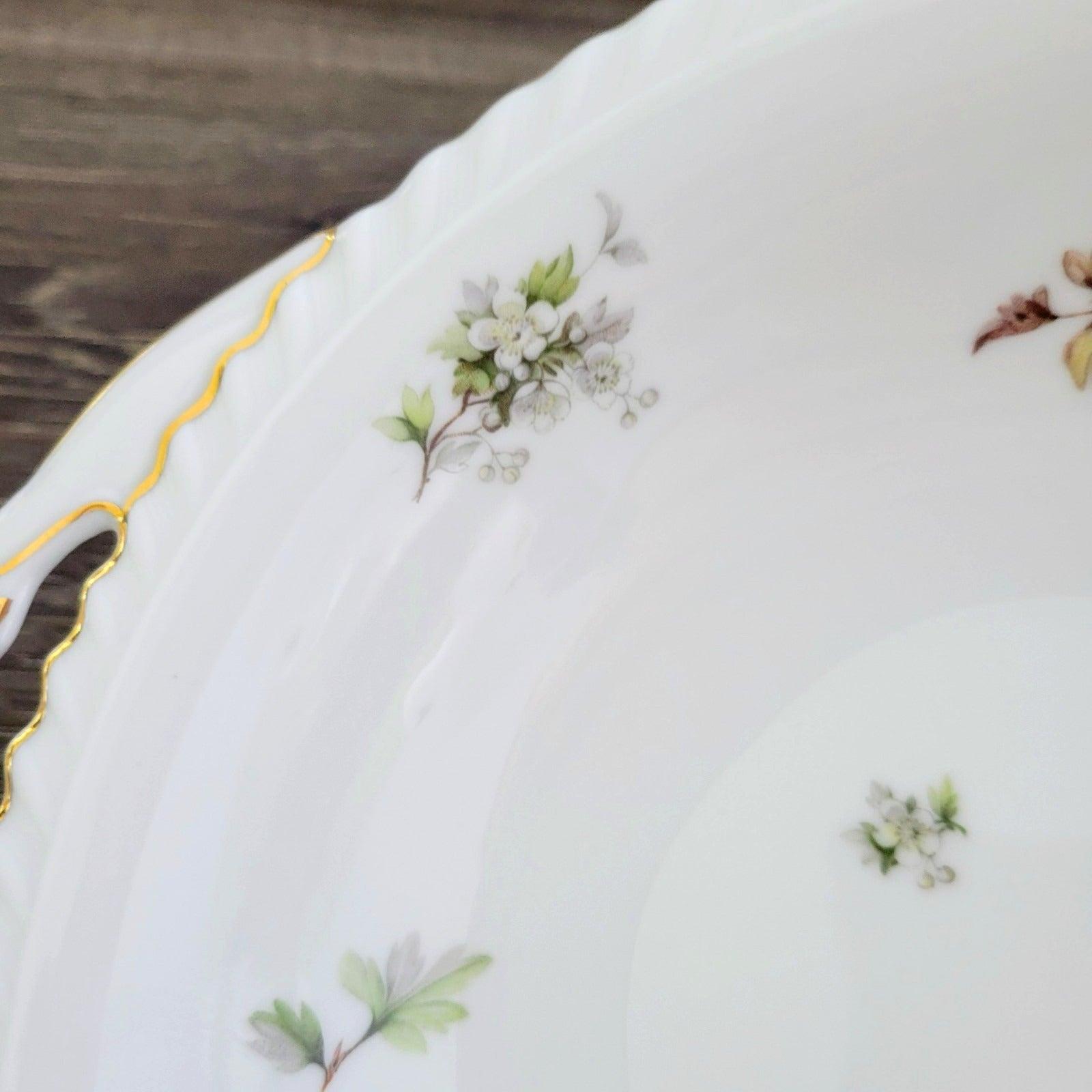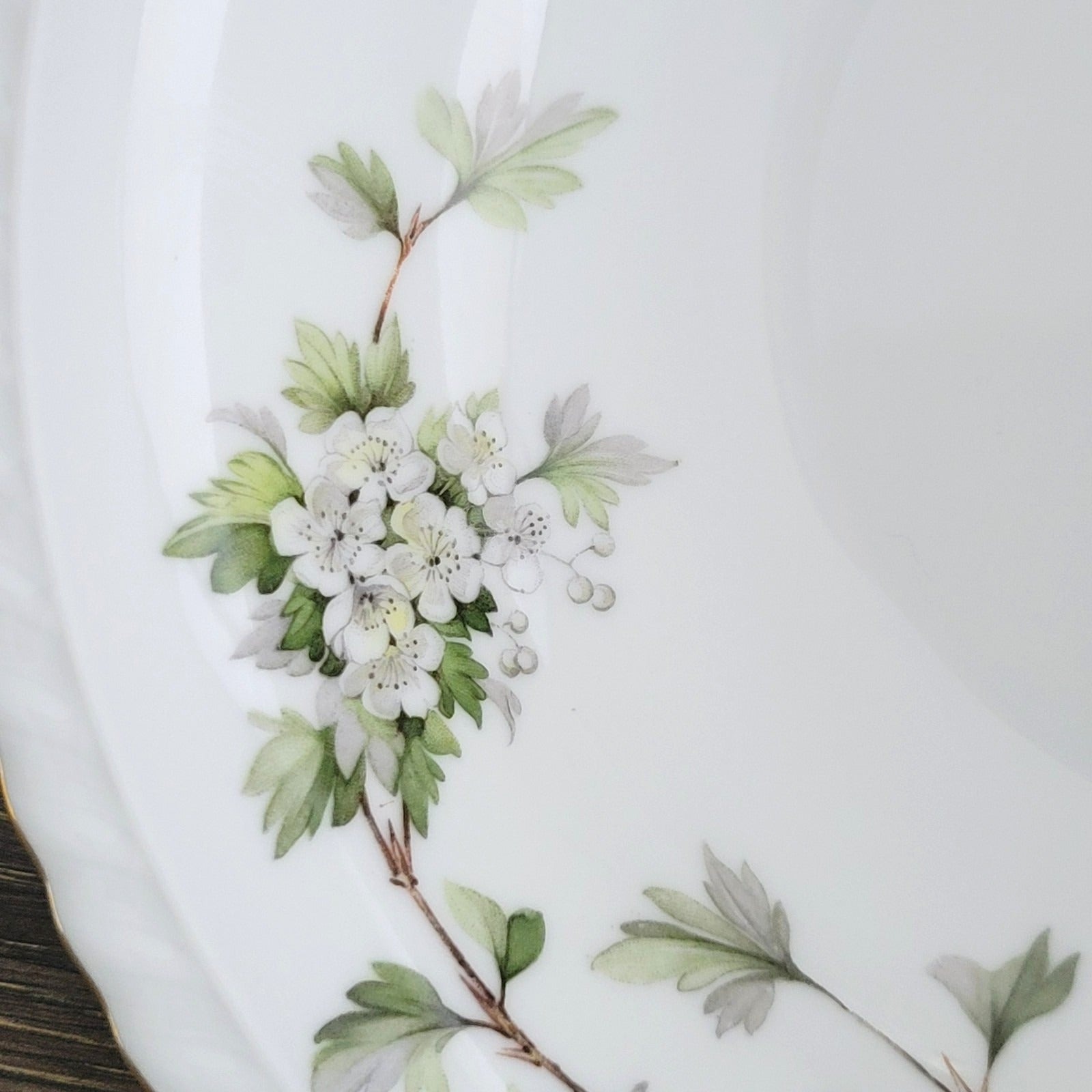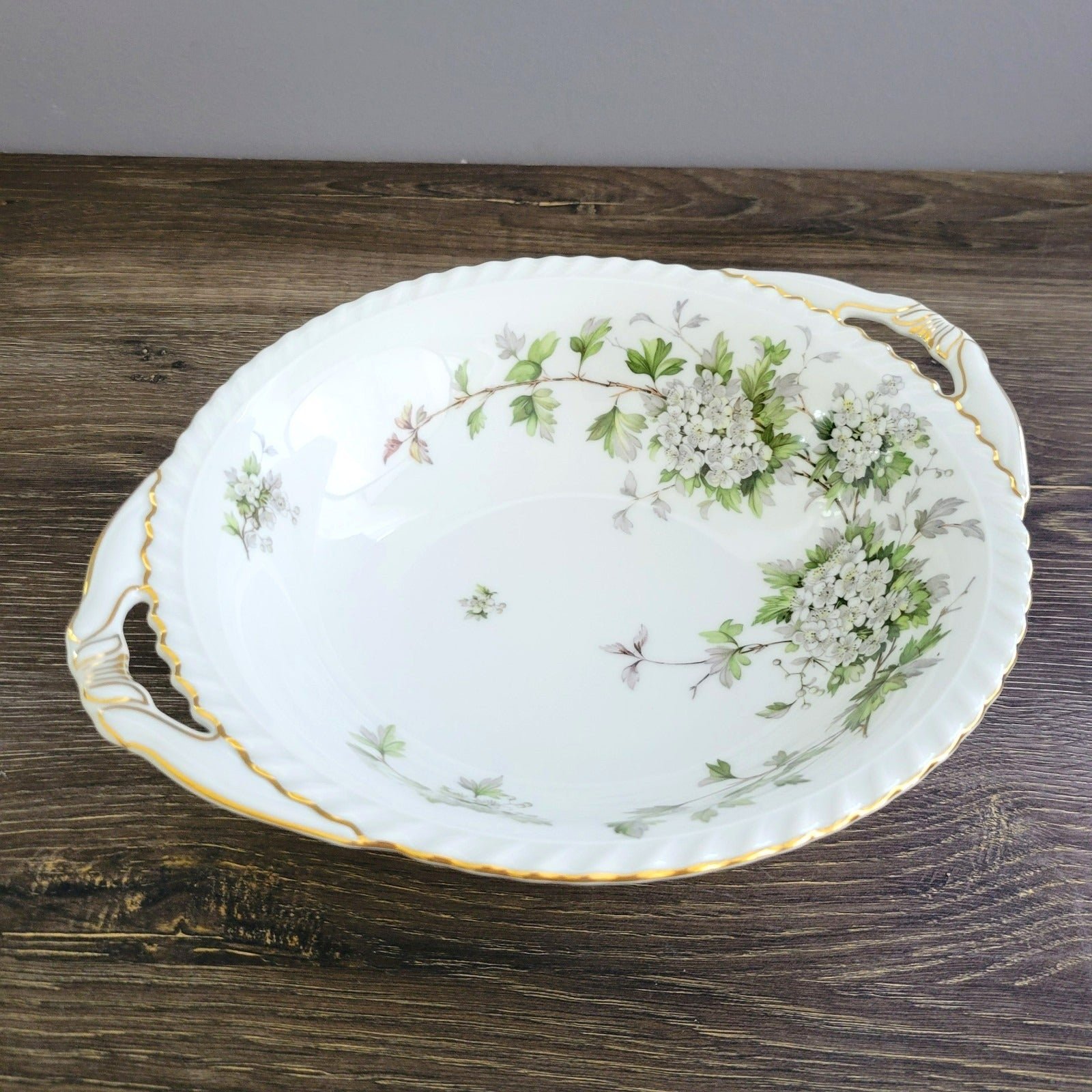 Elegant vintage Franconia Hawthorn bowl featuring delicate white flowers and leaves, complemented by a gadroon border and gold trim. Perfect for collectors and as a charming addition to your dining set.