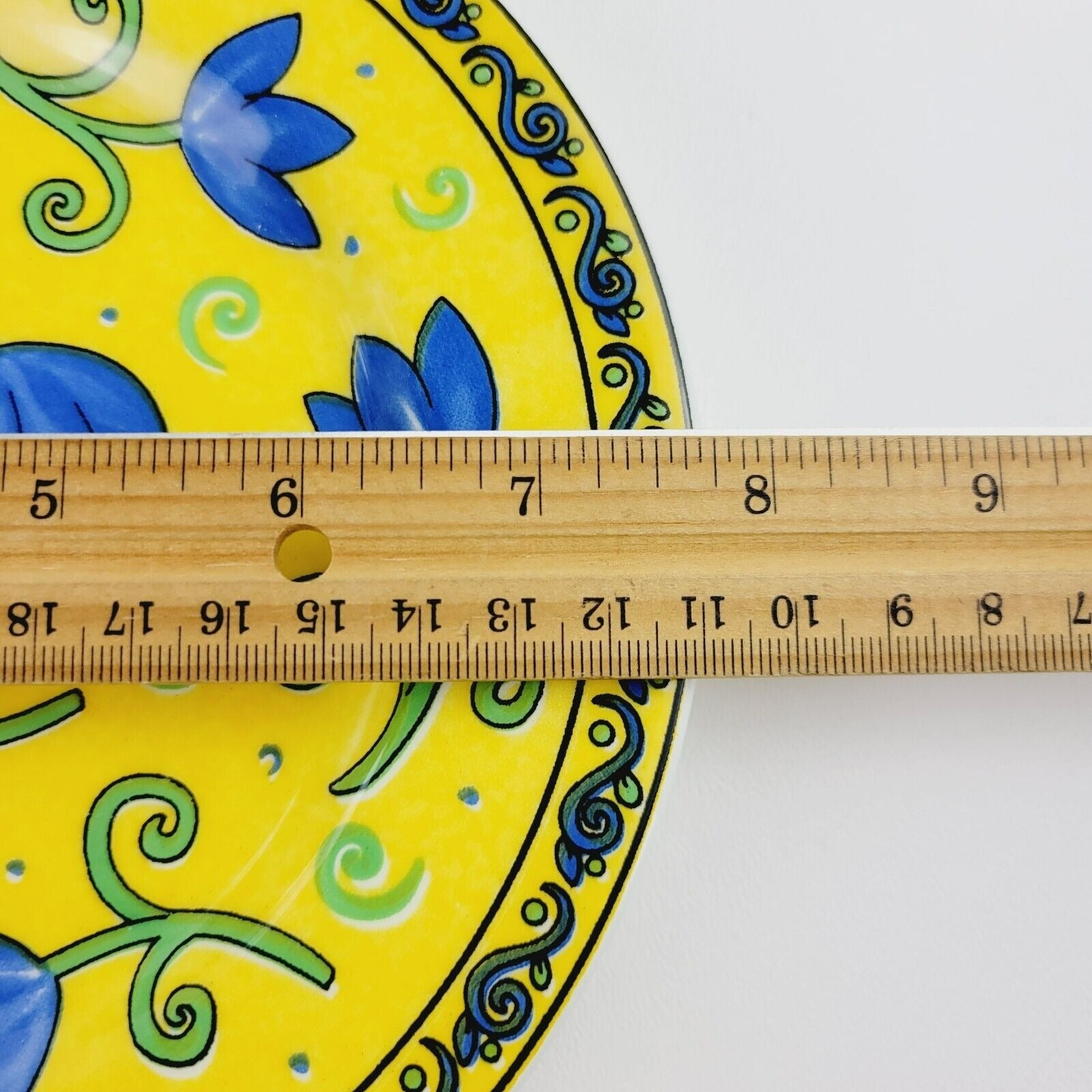Fun Italian salad plate featuring bright blue and yellow coloring with scroll designs. Crafted with care, this piece adds a touch of Mediterranean charm to your dining experience. Perfect for special occasions or everyday use.